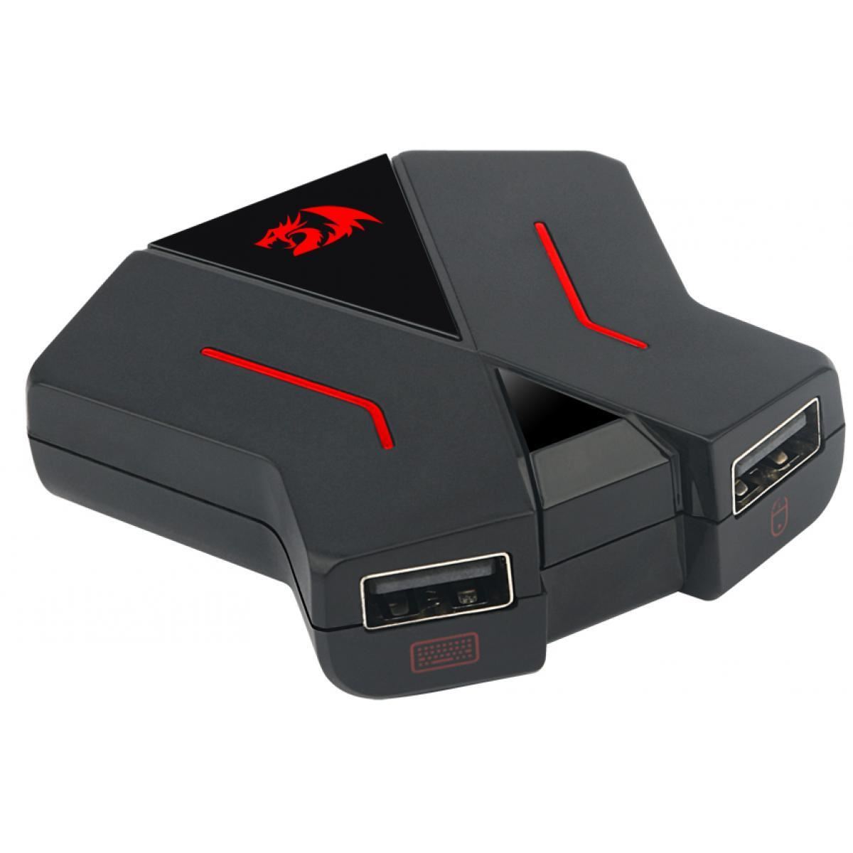 Adaptor console Redragon Eris negru, permite conectarea la majoritatea consolelor de jocuri a tastaturii si mouse-ului prin intermediul portului USB al consolei si al chip-ului Katana, include 2 port-uri USB marcate pentru mouse si tastatura, un port USB pentru conectarea unui controller, un port USB Type-C pentru conectarea la consola a adatptorului si un port USB Type-C pentru alimentare suplimentara, ideal pentru FPS, TPS and RTS, include cablu USB Type-C, lungime cablu: 30cm, dimensiuni: 61x64.4x19mm