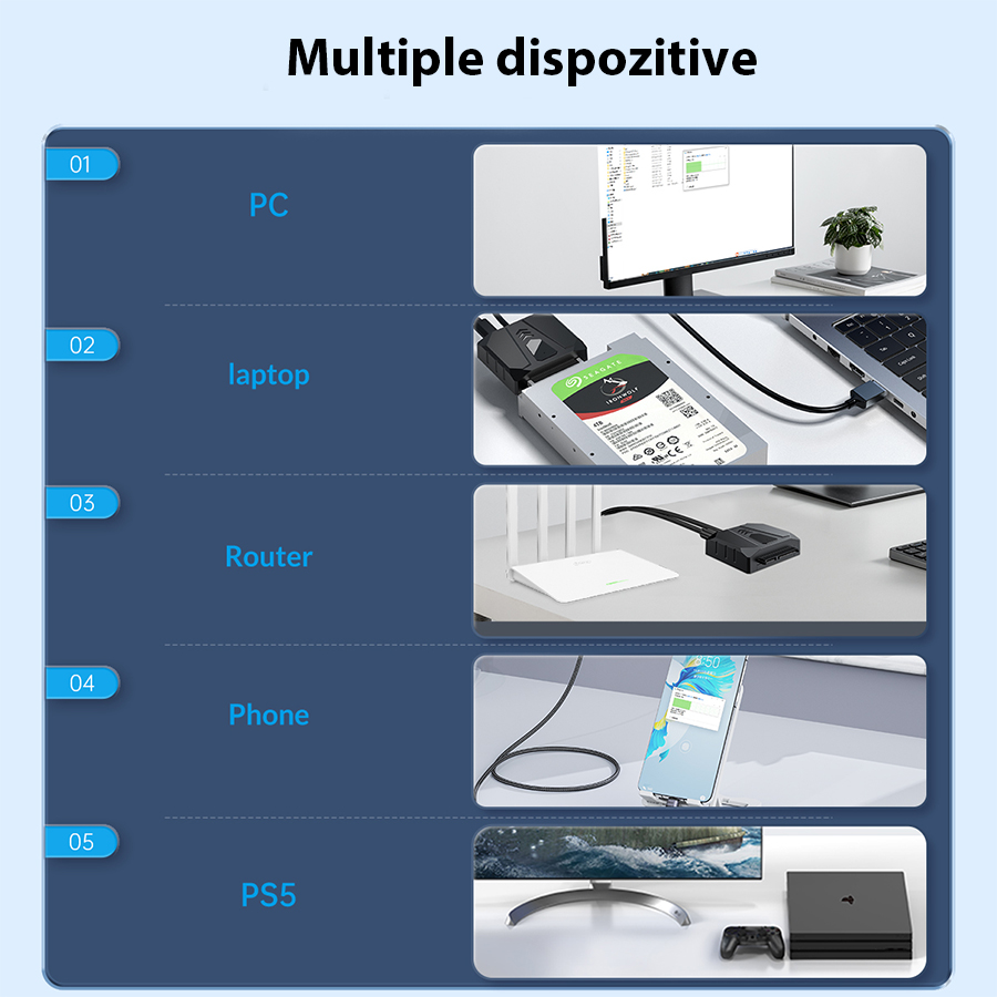 Adaptor HDD Orico UTS2-3A USB 3.0 2.5” negru, compatibilitate: SSD/HDD SATA de 2.5”, interfata: USB 3.0, capabilitati hot-swap, Plug & Play, viteza de transfer: 5Gbps (USB 3.0), lungime cablu: 30cm, dimensiuni: 61 x 59 x 16.5mm
