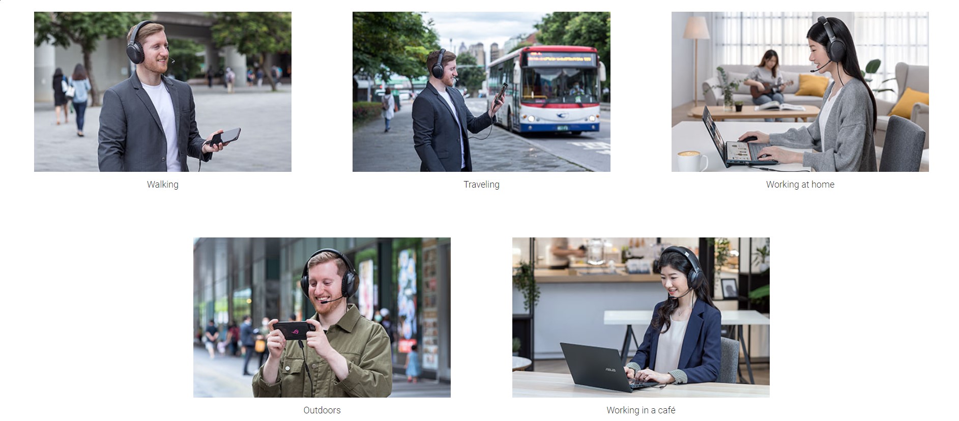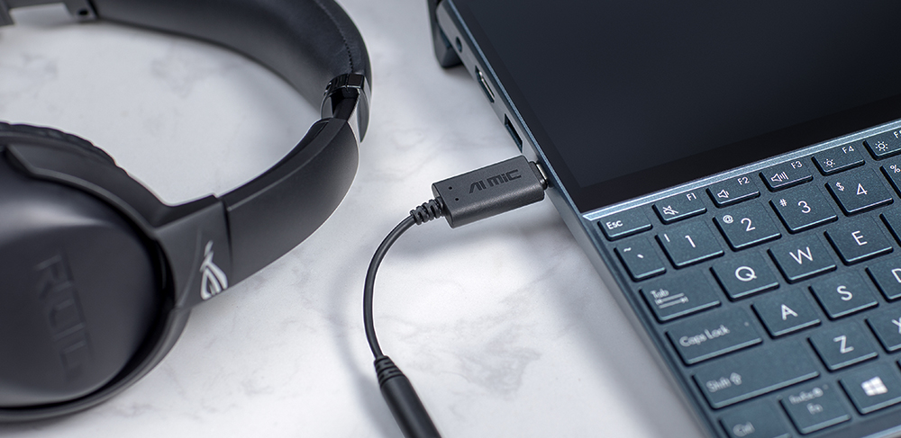 ASUS AI Noise-Canceling Mic Adapter functioneaza cu orice pereche de casti cu conector de 3,5 mm care includ si un microfon. Pentru cele mai bune rezultate, imperecheaza-ti castile cu un laptop cu un microfon unidirectional.