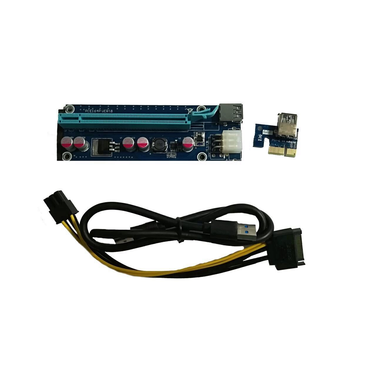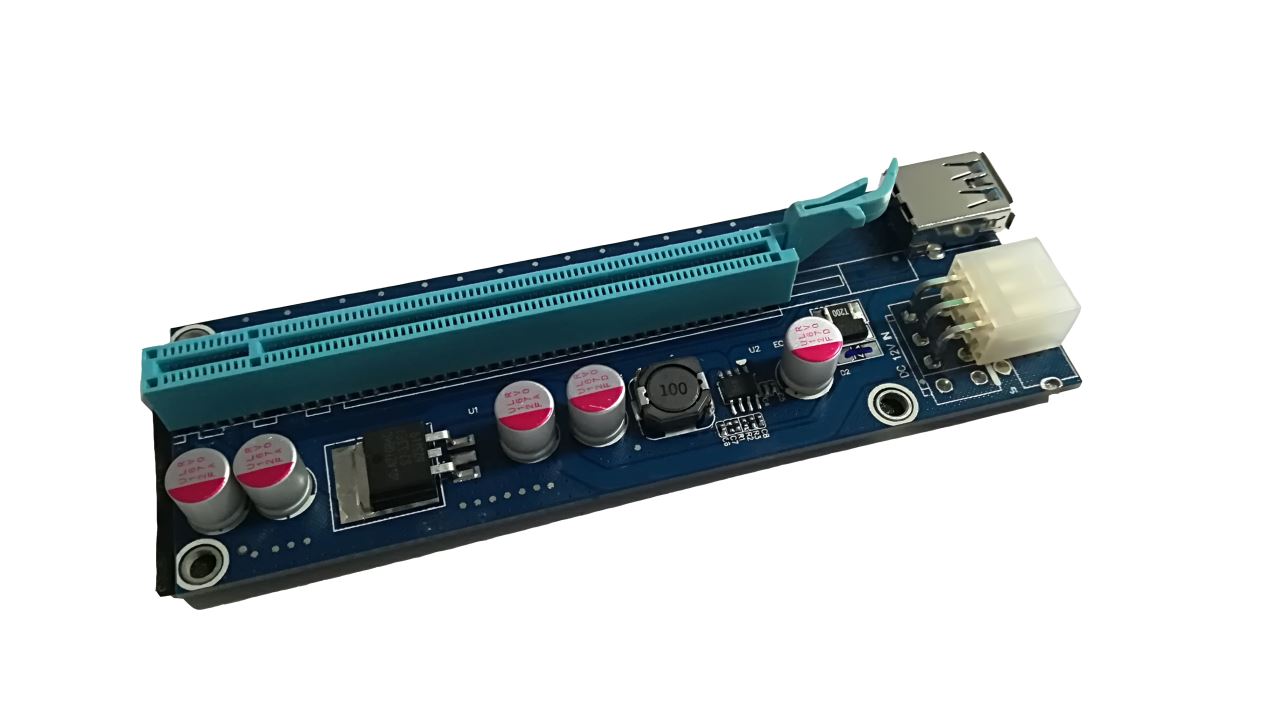 Riser PCIE 1x-16x pentru mining, versiune V006C, lungime cablu USB: 60cm, include cablu alimentare SATA-PCIE, condensatori solizi