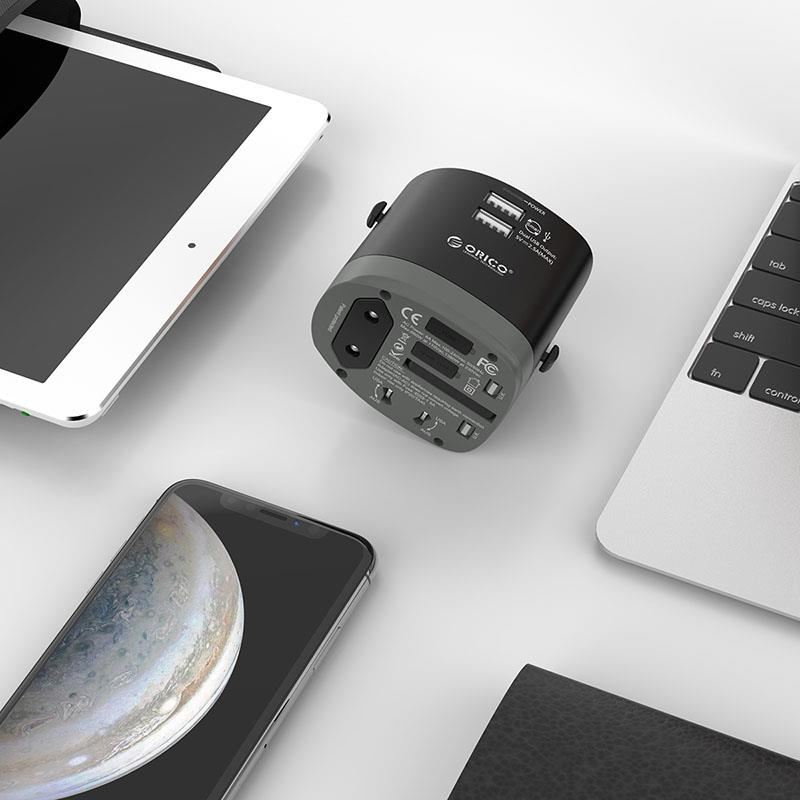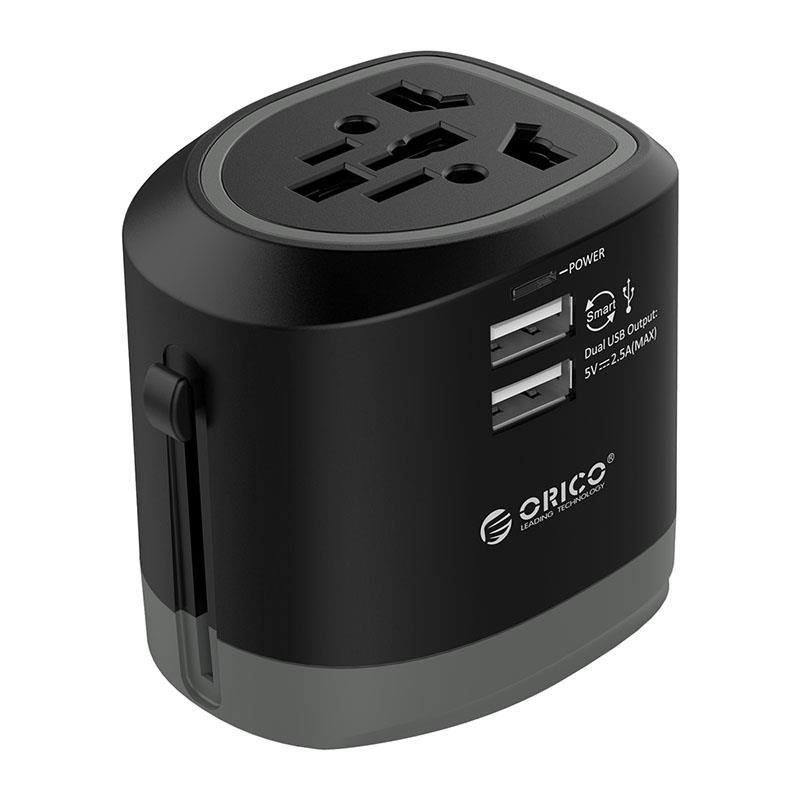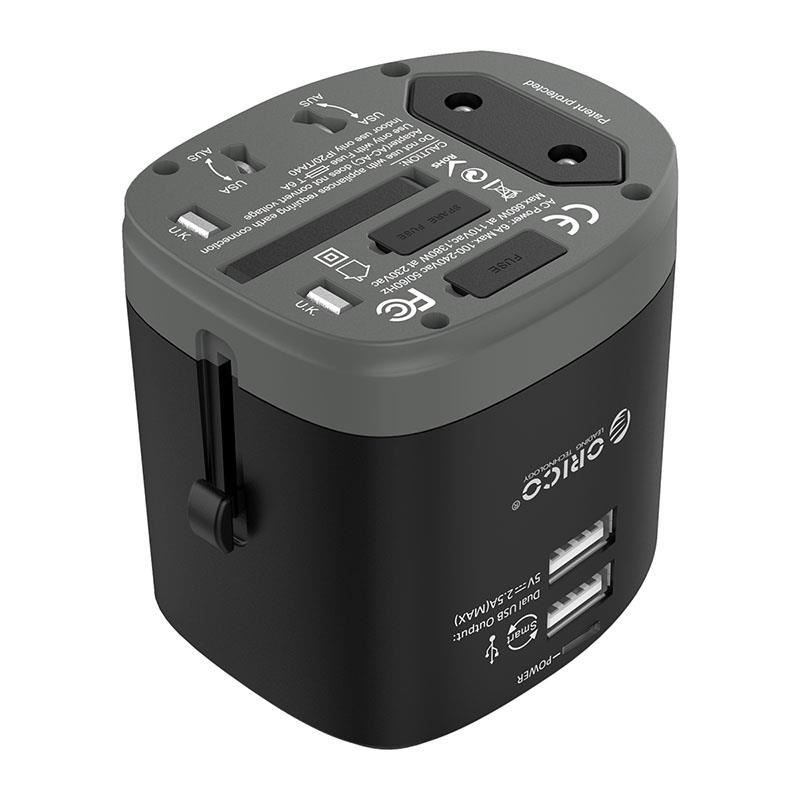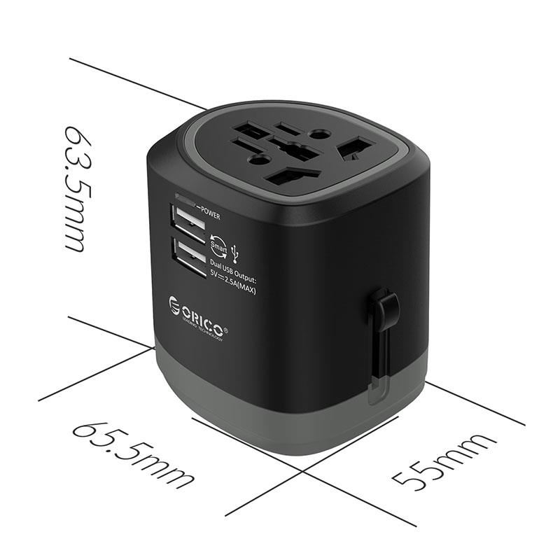 Adaptor universal priza Orico UTT-2U01 negru, incarcator cu 2 port-uri USB pentru diverse dispozitive (tablete, telefoane mobile, etc.), adaptor universal pentru prize (IN & OUT), intrare: 100-240V 50/60Hz, iesire priza: 660W (660W-110V~/1380W-230V) iesire USB: 5V2.5A, protectii: overvoltage/over current/short circuit protection, dimensiuni (l/w/h): 63.5 x 65.5 x 55mm, greutate: 122g