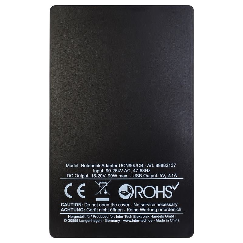 Inter-Tech Argus USN90UCB 90W, adaptor de notebook universal, eficienta 82+ (>83%), putere: 90W, selectie automata a voltajelor in functie de conectorul utilizat (10 conectori inclusi – voltaj: 15V-20V, max. 6A), protectii: Over voltage protection, Over current protection, dimensiuni (h/w/d): 30 x 58 x 132mm, marci compatibile: HP, COMPAQ, DELTA, GATEWAY, ASUS, NEC, IBM, LENOVO, DELL, TOSHIBA, LITEON, SONY, ACER (lista completa: http://www.inter-tech.de/index.php?option=com_phocadownload&view=category&download=1506%3Adata-sheet-argus-usn90-ucb&id=2%3Adatenblaetter-englisch&Itemid=471&lang=en)