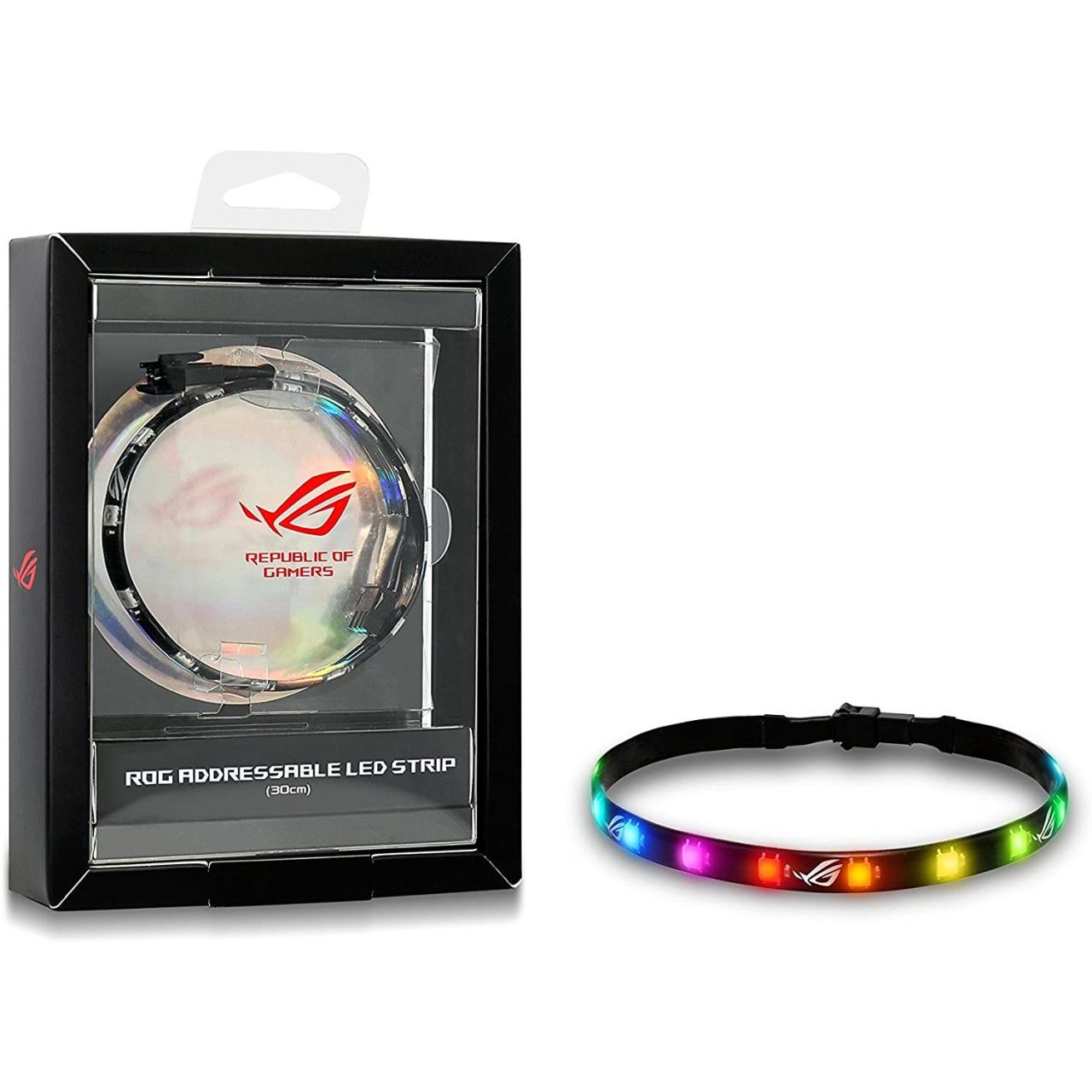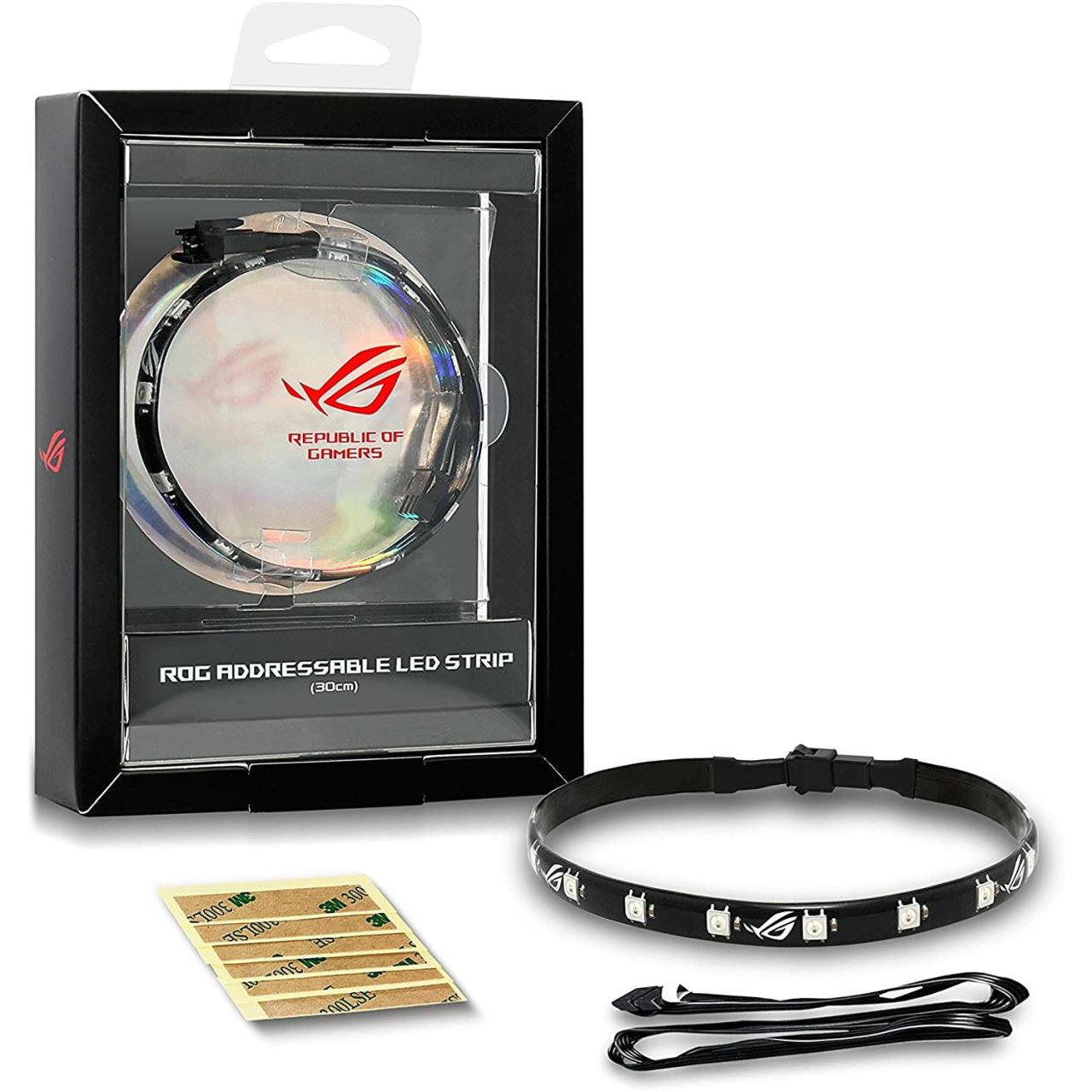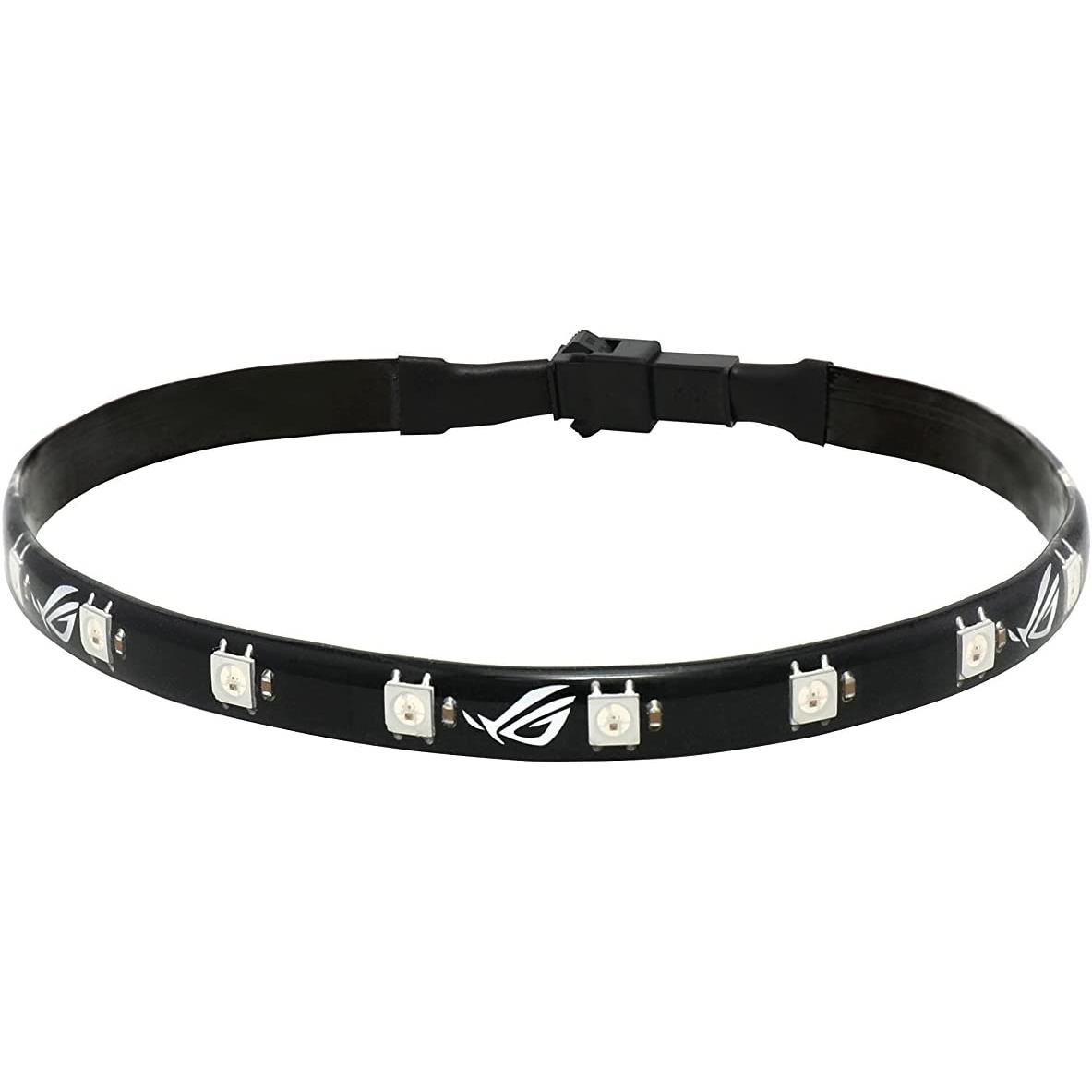 Banda LED Asus ROG adresabila RGB 30cm, fixare magnetica, dimensiuni banda LED: 300x10x 2mm, numar LED-uri: 15buc, tip LED: RGB 5050, include 1 banda LED, cabluri incluse: 1x extensie/alimentare: 760mm, compatibil cu AURA Sync RGB