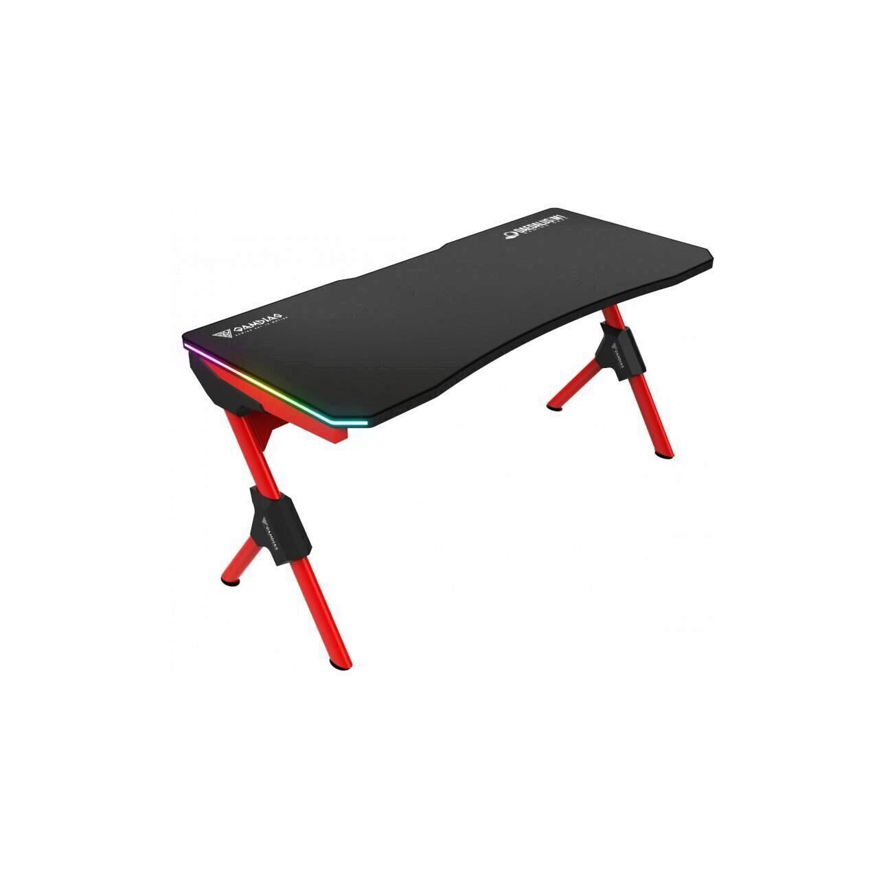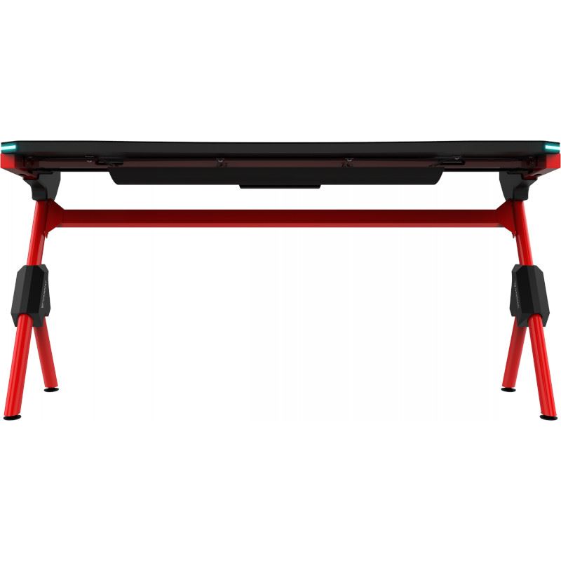 Birou gaming Gamdias Daedelus M1 negru cu rosu, suprafata biroului este acoperita in intregime cu un mousepad rezistent la apa, 2 benzi LED RGB incorporate pe lateralele blatului, dimensiune suprafata birou: 150x66cm, inaltime blat: 75-76.5cm(piciorusele se pot regla pe inaltime), sistem pentru organizarea cablurilor sub blat