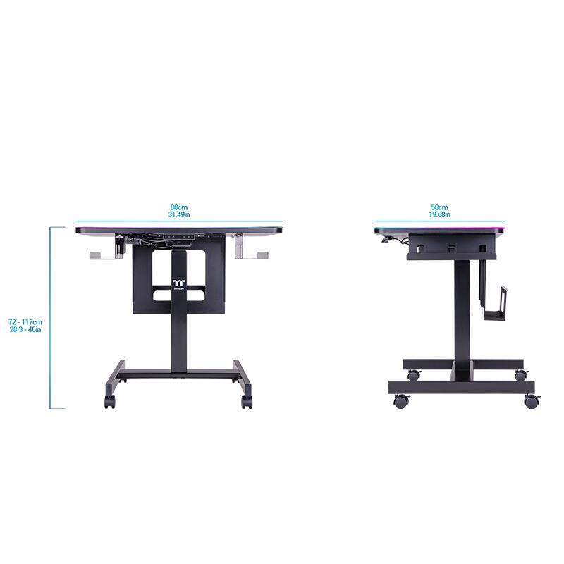 Birou gaming reglabil electric pe inaltime Thermaltake CycleDesk 100 negru iluminare RGB, structura din fier, biroul este reglabil electric pe inaltime,se pot seta 4 profile accesibile folosind butoanele de la 1 la 4, se pot programa setari automate pentru diferite inaltimi in functie de momentul zilei,include display pentru afisarea inaltimii, poate fi folosit pentru gaming, office sau antrenamente de ciclism, suprafata biroului este acoperita in intregime cu un mousepad rezistent la apa, biroul este iluminat RGB fiind configurabil prin intermediul aplicatiei iTake (5 moduri de iluminare), include modul WiFi, dimensiune suprafata birou: 80x50cm, inaltime blat: 72-117cm, suport pentru laptop, sistem pentru organizarea cablurilor sub blat