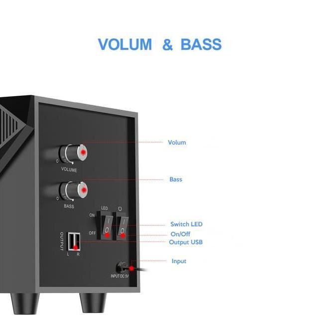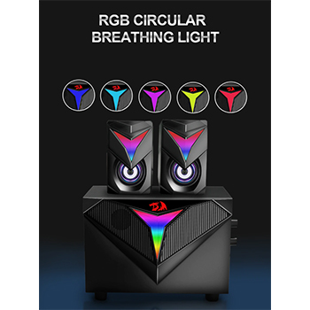 Boxe 2.1 Redragon Toccata iluminare RGB negre, iluminare RGB a difuzoarelor si a subwoofer-ului, putere: 11W RMS (3W x 2 + 5W), dimensiune difuzor: 2x 2” si 1x 4”, frecventa: 150Hz~20KHz, ≥70db, buton pentru pornirea sau oprirea iluminarii, butoane pentru reglajul volumului si al bass-ului, conexiuni: input: 1x jack 3.5mm TRS, 1x USB, dimensiuni: sateliti – 120x90x75mm / subwoofer – 230x175x175mm