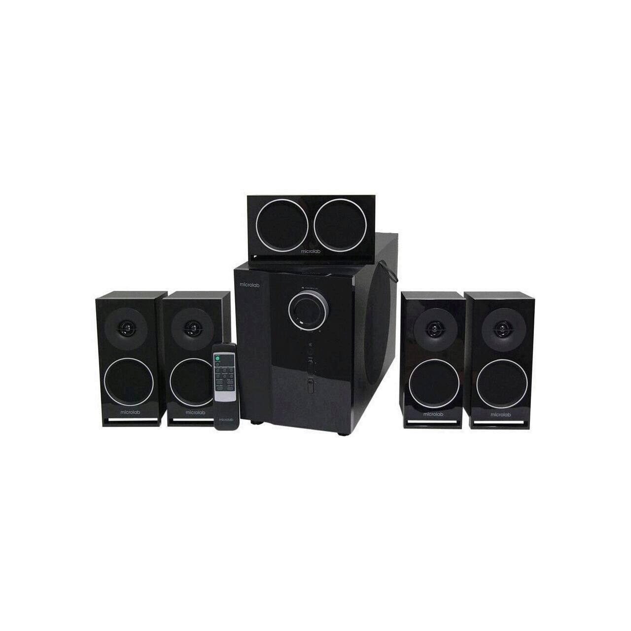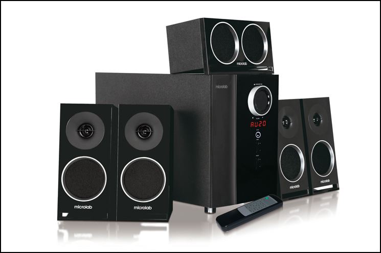 Microlab M-1910 5.1 65W, putere: 8W x 5 + 25W RMS, difuzoare sateliti: 4x 3” (impedanta: 4Ω) / 2x 3” (impedanta: 8Ω) / 4x 1” (impedanta: 8Ω), difuzor subwoofer: 6.5” (impedanta: 8Ω), frecventa raspuns: 30Hz-20kHz, S/N: >75dB, separation: >45dB, harmonic distortion: <0.3 % (1W 1kHz), conexiuni: output: 5x RCA / input: 2x RCA (stereo), 6x RCA (5.1), TOSLINK, coaxial, include cablu 3.5mm jack-2x RCA, include telecomanda fara fir, dimensiuni subwoofer: 190x267x400mm, dimensiuni sateliti: 95x218x107mm, greutate: 10kg