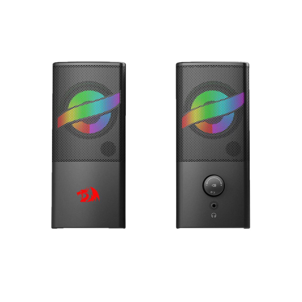 Boxe Redragon Air iluminare RGB negre, iluminare RGB a difuzoarelor, putere: 6W RMS (3W x 2), dimensiune difuzor: 2.5”, frecventa: 160Hz~20KHz, ≥60db, conexiuni: ouput: 1x jack 3.5mm TRS, input: 1x jack 3.5mm TRS, 1x USB, dimensiuni: 82x96x185mm
