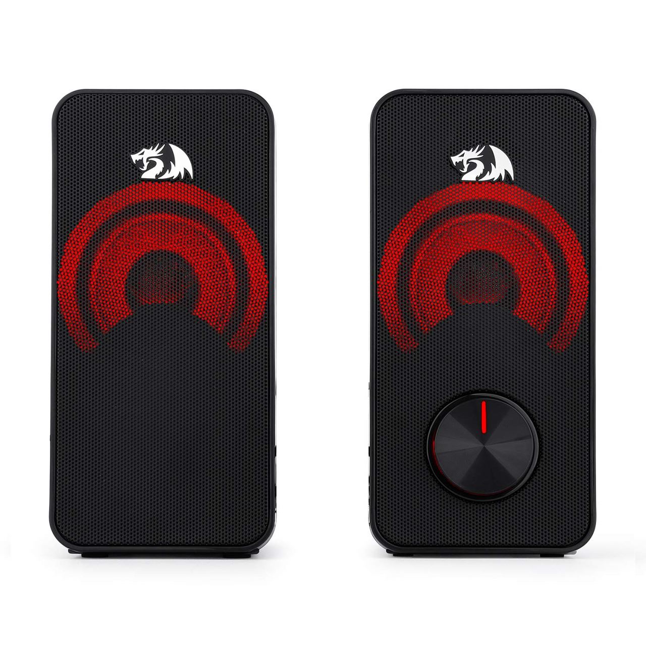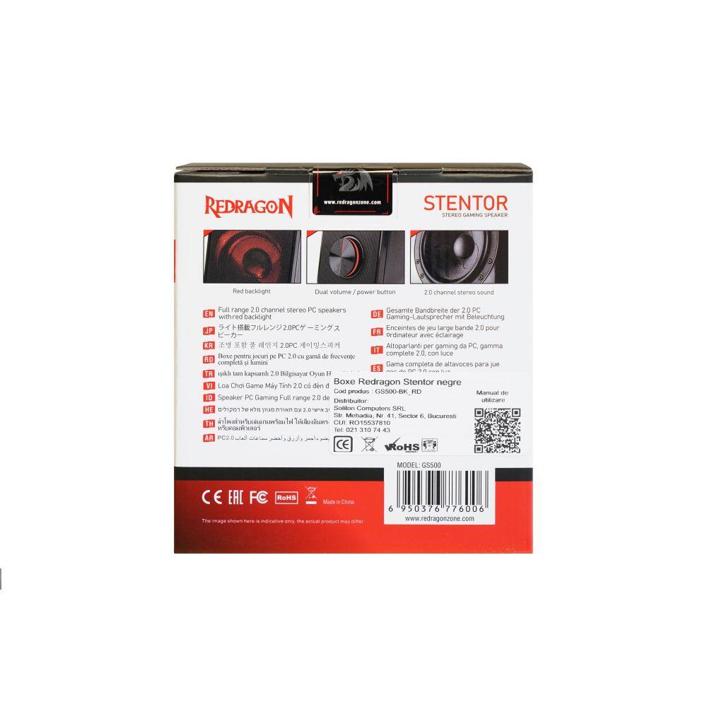 Boxe Redragon Stentor negre, iluminare rosie a difuzoarelor, putere: 10W RMS (5W x 2), conexiuni: output: input: 1x jack 3.5mm TRS, 1x USB, dimensiuni: 177x163x107mm, greutate: 372g