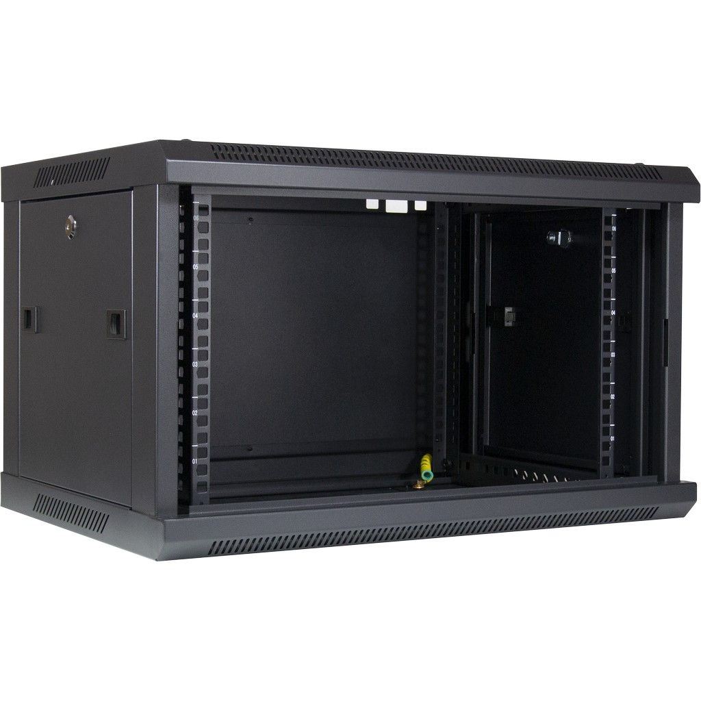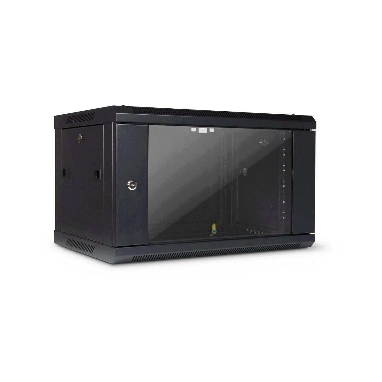 Cabinet server Inter-Tech SMA-6406 IPC 19" 6U 450mm montare pe perete, material: otel laminat la rece cu o grosime de 1.25-1.5mm, usa din sticla securizata cu incuietoare si deschidere de 180°, balamalele se pot monta pe ambele parti, panouri laterale demontabile si blocabile, posibilitate montare 2 ventilatoare pentru racire in tavan (ventilator 120mm, alimentare 230V PN: 88887269), intrare/iesire de cabluri pe capac si baza, capacitate unitati 6U, adancime 450mm, latime 600mm, greutate maxima echipamente 30Kg, certificare IP: IP20, culoare: RAL 9005 (negru), continut pachet: SMA-6406/ set suruburi/ 12x suruburi si piulite / 12x saibe de platic / 1x surub impamantare/ 1x suport montare pe perete, dimensiuni (HxWxD): 368 x 600 x 450mm, greutate: 14.4Kg