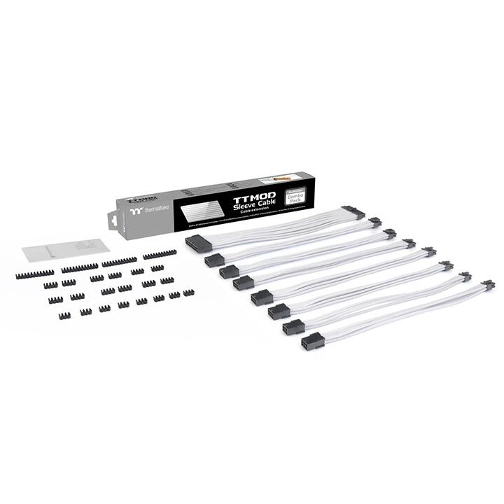 Cabluri extensie Thermaltake TtMod Mesh-uite albe, continut: 24 Pin ATX Extension Cable x 1, 4 + 4 Pin EPS Cable x 2, 8 Pin PCI-e Cable x 3, 6 Pin PCI-e Cable x 2, 24 Pin Cable Comb x 4, 8 Pin Cable Comb x 20, 6 Pin Cable Comb x 8, grosime cabluri (AWG): 16, lungime: 300mm