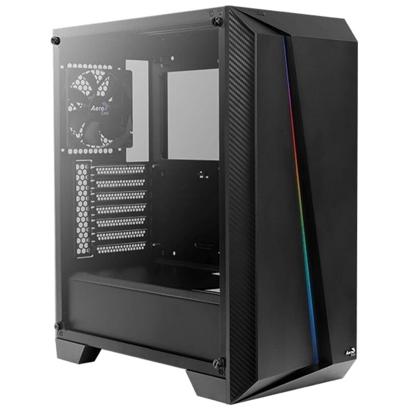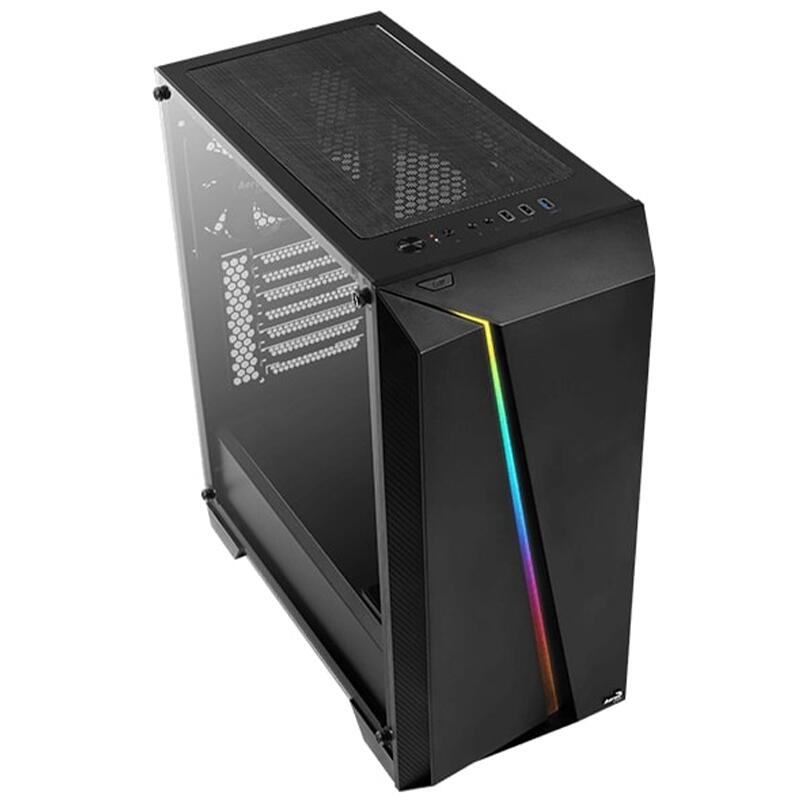 Carcasa Aerocool Cylon Pro V2 neagra, SPCC Steel ATX Mid Tower, fara sursa (tip ATX, montata jos), interior vopsit negru, 2x2.5”/3.5” (intern), 2x2.5” (intern), fata – 3x 120mm/140mm fans (optional), spate – 1x 120mm fan (inclus), tavan – 2x 120mm/140mm fans (optional), design premium cu panou lateral din sticla securizata si panou frontal cu banda LED RGB cu diverse efecte de iluminare, 1x USB 3.0, 2x USB 2.0, HD Audio, ATX / microATX / Mini-ITX, sloturi expansiune: x7, spatiu destinat cable management: 21mm, inaltime maxima cooler procesor: 167mm, lungime maxima placa video: 359mm (fara ventilator montat), suport radiatoare water cooling: fata – 1x 240mm, tavan – 1x 240mm, spate – 1x 120mm, dimensiuni (HxWxD): 491x219x434mm, greutate: 3.2kg