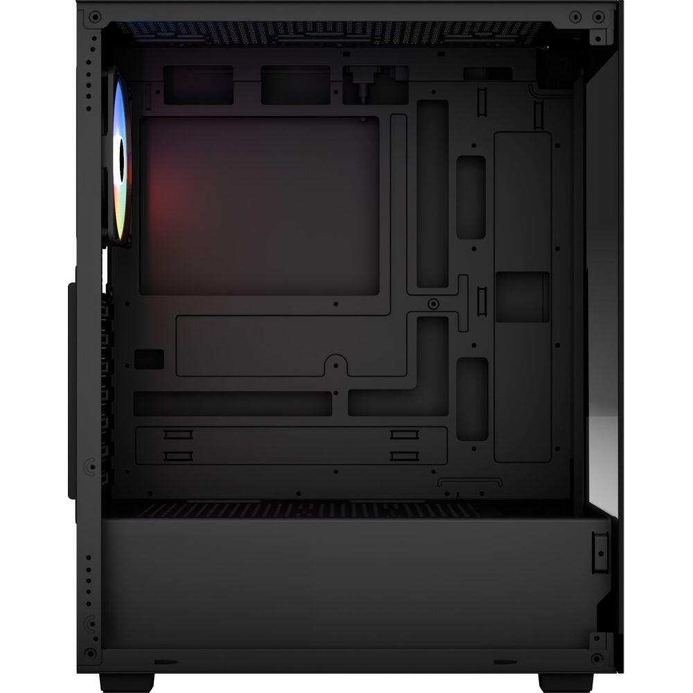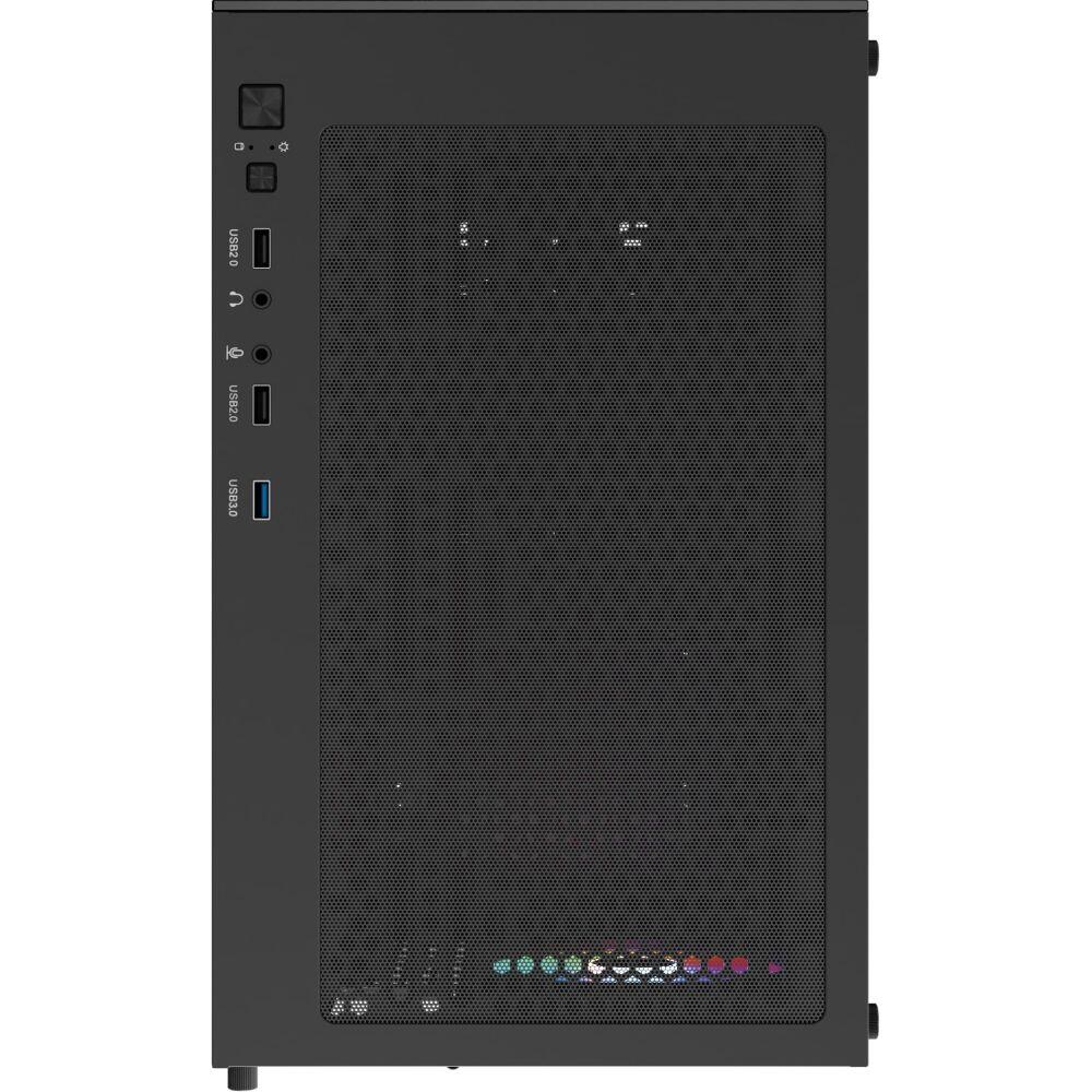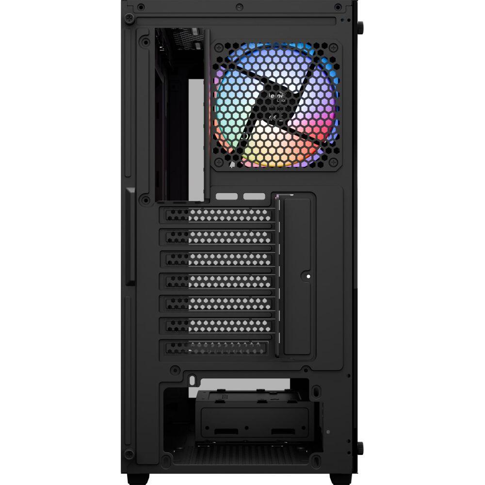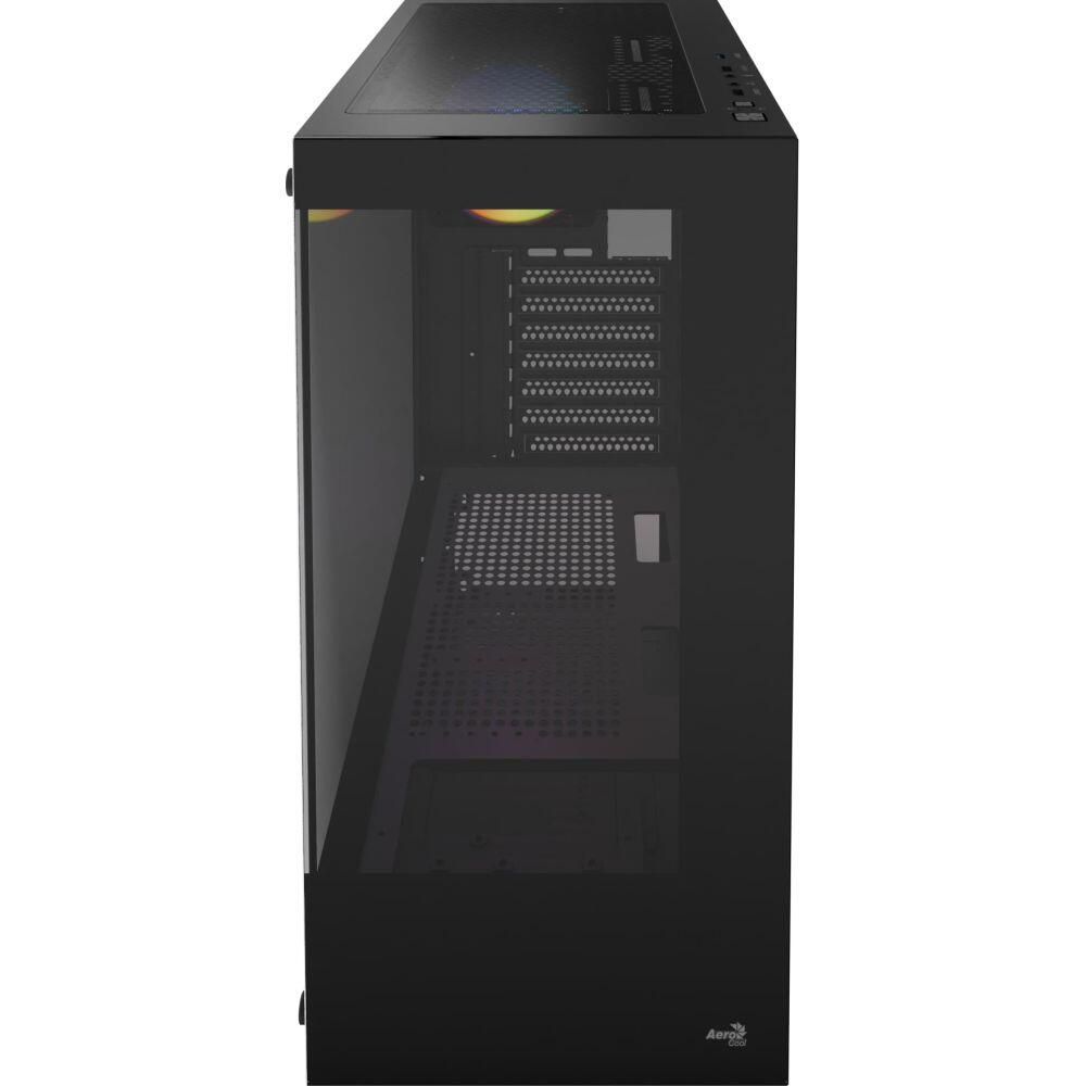 Carcasa Aerocool Pivot G V1 neagra, SPCC Steel ATX + Tempered Glass Mid Tower, fara sursa (tip ATX, montata jos), interior vopsit negru, 2x 3.5” (intern), 2x 2.5” (intern), tavan – 2x 120/140mm fans (optional), spate – 1x 120mm fRGB LED fan (inclus), podea – 2x 120mm fans (optional), 1x USB 3.0, 2x USB 2.0, HD Audio, ATX / microATX / mini-ITX, sloturi expansiune: x7, design premium tip panoramic cu panou frontal si lateral din sticla securizata, inaltime maxima cooler procesor: 170mm, lungime maxima placa video: 345mm, suport radiator water cooling: tavan – 1x 240mm (cu memorii de maxim 45mm inaltime), spate – 1x 120mm, adancime compartiment cabluri: 23.5mm, dimensiuni (WxHxD): 223.5x448.5x369.5mm