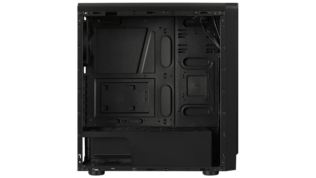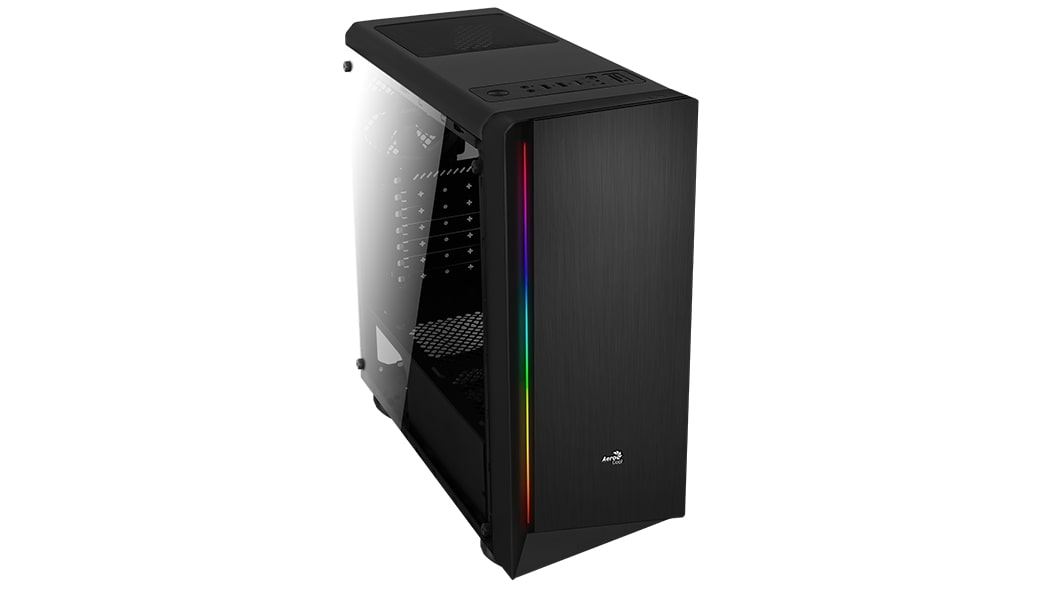Carcasa Aerocool Rift neagra, SPCC Steel ATX Mid Tower, fara sursa (tip ATX, montata jos), interior vopsit negru, 2x2.5”/3.5” (intern), 3x2.5” (intern), fata – 3x 120mm fans (optional), spate – 1x 120mm fan (inclus), tavan – 1x 120mm fans (optional), podea – 2x 120mm fans (optional), design premium cu panou lateral din plexiglass si panou frontal cu banda LED RGB cu diverse efecte de iluminare, 1x USB 3.0, 2x USB 2.0, HD Audio, card reader SD, ATX / microATX / Mini-ITX, sloturi expansiune: x7, inaltime maxima cooler procesor: 155mm, lungime maxima placa video: 346mm (cu ventilator frontal montat) / 371mm (fara ventilator frontal montat), suport radiatoare water cooling: fata – 1x 120mm, dimensiuni (HxWxD): 461x195x411mm, greutate: 4.8kg