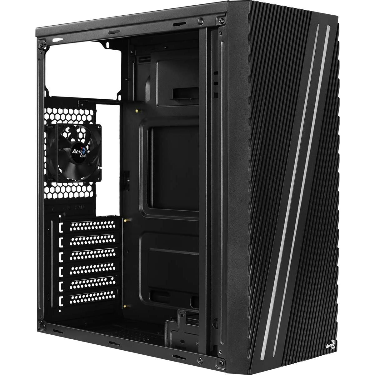Carcasa Aerocool Streak neagra, SPCC Steel ATX Mid Tower, fara sursa (tip ATX, montata sus), interior vopsit negru, 3x3.5” (2 x 3.5”/2.5″ intern), 4x2.5” (2 x 3.5”/2.5″ intern), fata – 2x 120mm fans (optional), spate – 1x 80mm fan (inclus) / 1x 92mm (optional), design premium cu panou lateral din plexiglass, panou frontal iluminat RGB, 1x USB 3.0, 2x USB 2.0, HD Audio, ATX / microATX / Mini-ITX, sloturi expansiune: x6, inaltime maxima cooler procesor: 151mm, lungime maxima placa video: pana la 335mm fara radiator montat, suport radiatoare water cooling: fata – 1x 240mm, dimensiuni: 190.1x412.8x382.6mm, greutate: 2.7kg