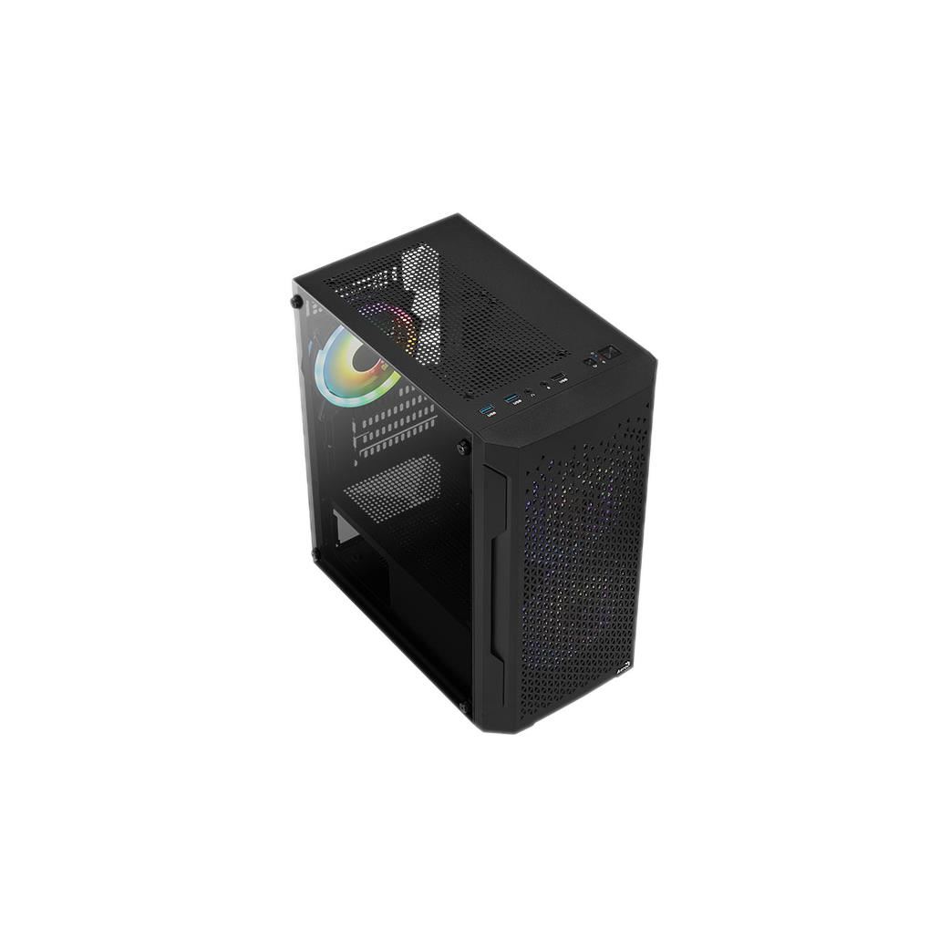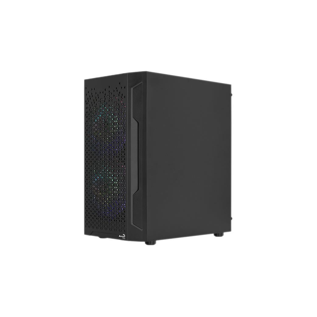 Carcasa Aerocool Trinity V2 neagra, SPCC Steel ATX Mid Tower, fara sursa (tip ATX, montata jos), interior vopsit negru, 2x 2.5”/3.5” (intern), 1x 2.5” (intern), fata – 2x 140mm fRGB LED (inclus) / 2x 120mm fans (optional), spate – 1x 120mm fRGB LED fan (inclus), podea – 2x 120mm fans (optional), tavan – 2x 120mm fan (optional), 2x USB 3.0, 1x USB 2.0, HD Audio, microATX / mini-ITX, sloturi expansiune: x4, inaltime maxima cooler procesor: 158mm, lungime maxima placa video: 297mm (fara radiator montat), suport radiator water cooling: fata – 1x 120/240mm, spate – 1x 120mm, dimensiuni (HxWxD): 385x206.5x353.4mm, greutate: 4.3kg