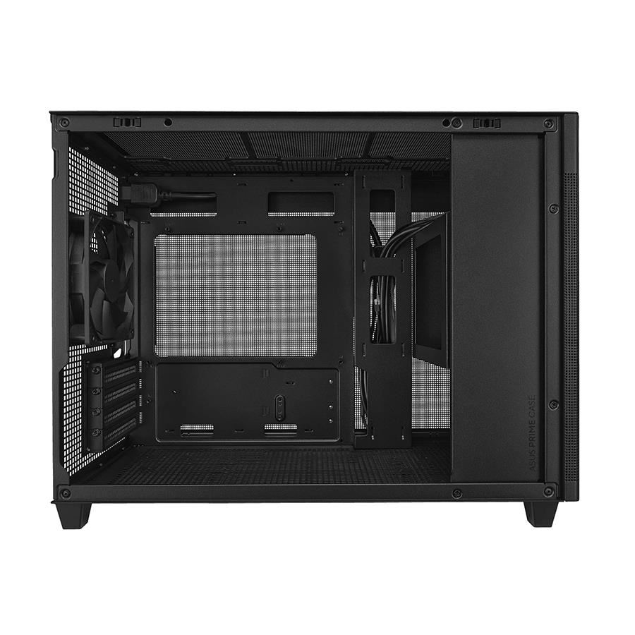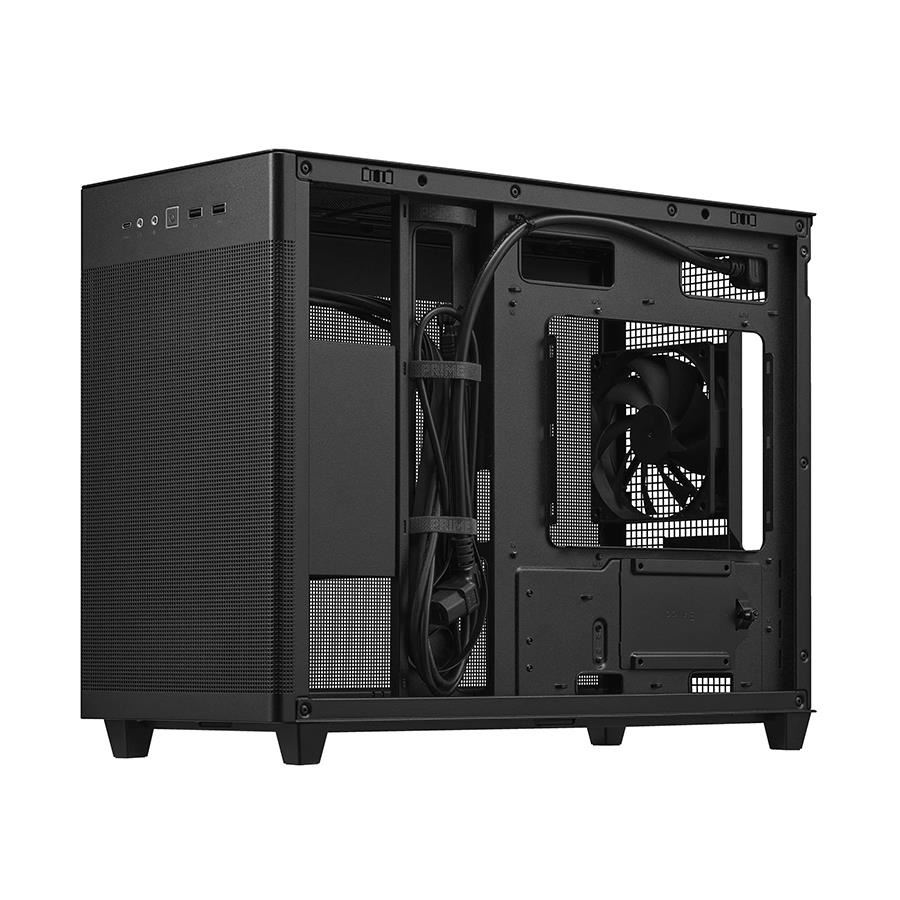 Carcasa ASUS Prime AP201 neagra, SECC Steel ATX Mid Tower, fara sursa (tip ATX, montata jos), interior vopsit negru, 3x3.5” (intern combo 2.5”/3.5”), 1x 2.5” (intern), design tool-less, spate – 1x 120mm fan (inlcus), tavan – 3x 120mm / 2x 140mm fan (optional), design premium cu panou lateral din tabla perforata, 2x USB 3.2 Gen1, 1 x USB 3.2 Gen2 Type C, HD Audio, microATX / Mini-ITX, sloturi expansiune: x4, inaltime maxima cooler procesor: 170mm, lungime maxima placa video: 338 mm, lungima maxima sursa: 140-180mm, suport radiatoare water cooling: tavan – 1x 120/140/240/280/360mm, spate – 1x 120mm, include filtre de praf, spatiu gestionare cabluri: 32mm, dimensiuni: 205x350x460mm, greutate: 5.8kg