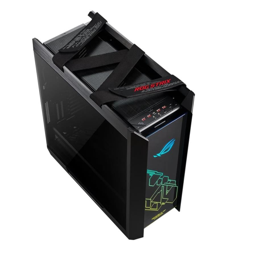 Carcasa ASUS ROG STRIX Helios neagra, SECC Steel ATX Mid Tower, fara sursa (tip ATX, montata jos), interior vopsit negru, 2x3.5” (intern combo 2.5”/3.5”), 4x 2.5” (intern), design tool-less, fata – 3x 140mm fan (inclus) / 3x 120mm fan (optional), spate – 1x 140mm fan (inclus) / 1x 120mm fan (optional), tavan – 3x 120mm / 2x 140mm fan (optional), design premium cu panou frontal si laterale din sticla securizata, panou frontal iluminat aRGB compatibil cu ASUS Aura Sync, 4x USB 3.1 Gen1, 1x USB 3.1 Gen2 Type-C, HD Audio, EATX (12"x10.9") / ATX / microATX / Mini-ITX, sloturi expansiune: x8+2, inaltime maxima cooler procesor: 190mm, lungime maxima placa video: 450 mm (este necesar un cablul riser cu o lungime de peste 200 mm pentru o instalare GPU în pozitie verticala), lungime maxima sursa: 220mm, suport radiatoare water cooling: fata – 1x 120/140/240/280/360/420mm (grosime radiator + ventilator: maxim 90mm), spate – 1x 120/140mm, tavan – 1x 120/140/240/280/360mm (grosime radiator + ventilator: maxim 60mm), include filtre de praf (frontal, superior si inferior), spatiu gestionare cabluri: 33mm, chingi pentru transport textile ce suporta pana la 50kg, dimensiuni: 565x250x591mm, greutate: 18kg