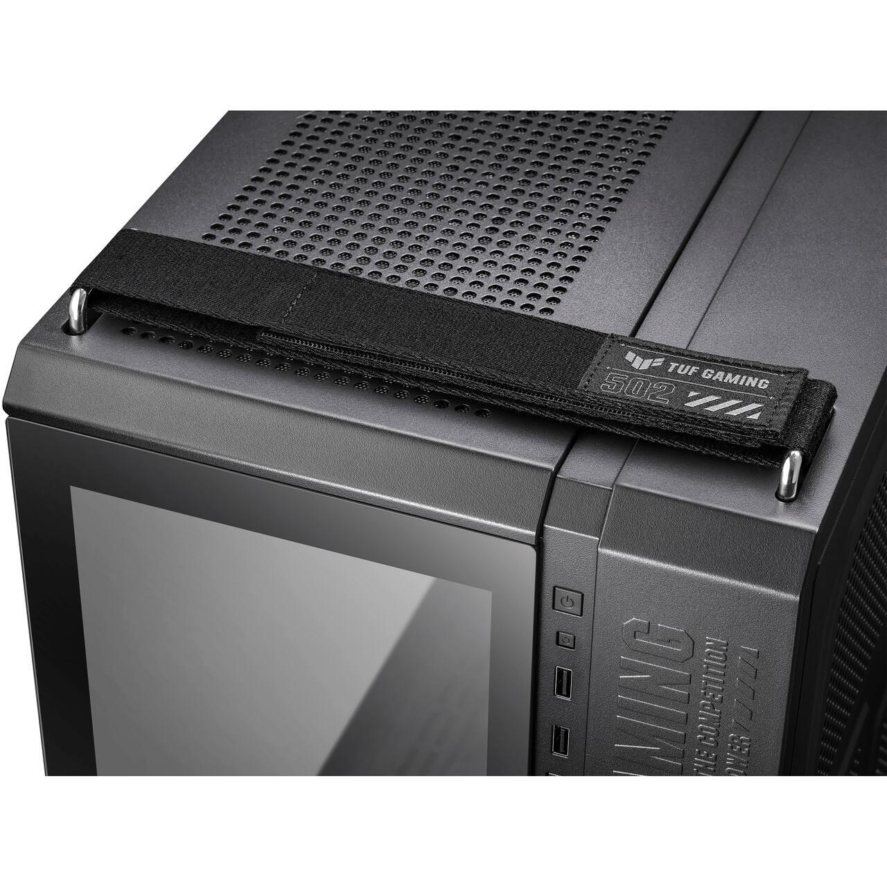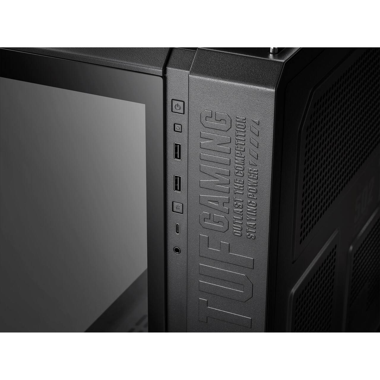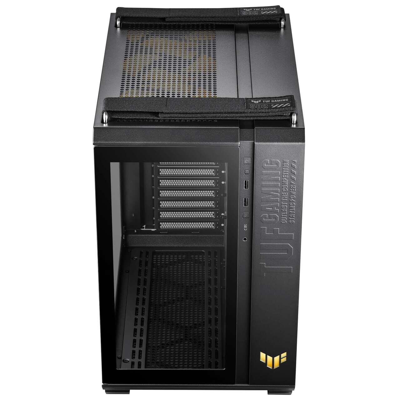 Carcasa Asus TUF Gaming GT502 PLUS aRGB Tempered Glass neagra, SECC Steel ATX Mid Tower, compartimentare dubla – dual chamber, design modular, fara sursa (tip ATX, montata jos), interior vopsit negru, 4x3.5” (intern combo 2.5”/3.5”), design tool-less, interior dreapta – 3x 120mm fan (optional), spate – 1x 120mm fan (inclus), tavan – 3x 120mm fan (inclus) / 2x 140mm fan (optional), compartiment sursa – 3x 120mm / 2x 140mm fan (optional), design premium cu panou frontal si lateral din sticla securizata, 2x USB 3.1 Gen1, 1 x USB 3.2 Gen2 Type-C, 1 x USB 3.2 Gen 2x2, HD Audio, ATX / microATX / Mini-ITX, sloturi expansiune: x8+3, inaltime maxima cooler procesor: 163mm, lungime maxima placa video: 400 mm, lungima maxima sursa: 200mm, suport radiatoare water cooling: tavan – 1x 120/140/240/280/360mm, compartiment sursa – 1x 120/140/240/280/360mm, include filtre de praf (superior si inferior), spatiu gestionare cabluri in compartimentul sursei, chingi pentru transport textile ce suporta pana la 30kg, dimensiuni: 450x285x446mm, greutate: 11kg