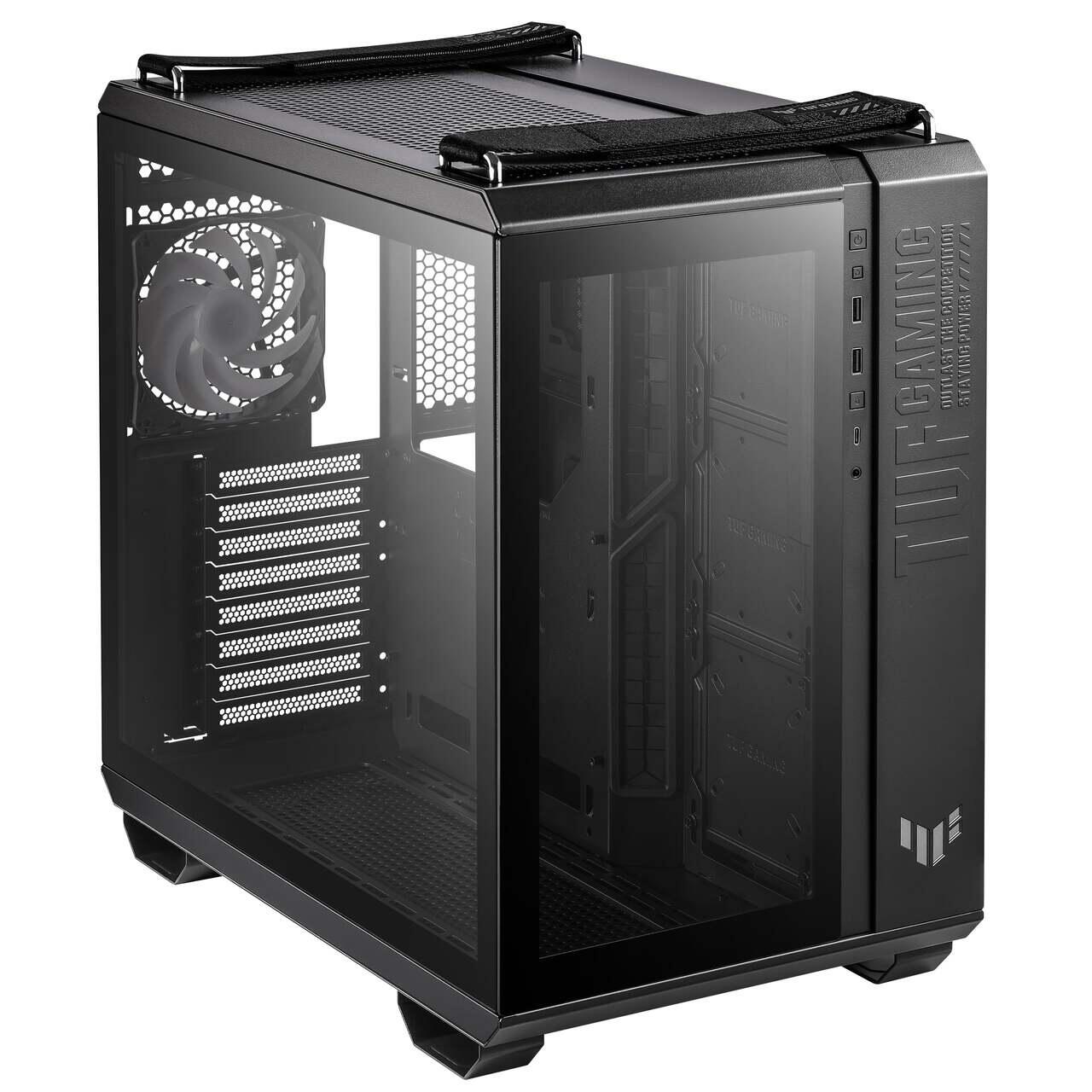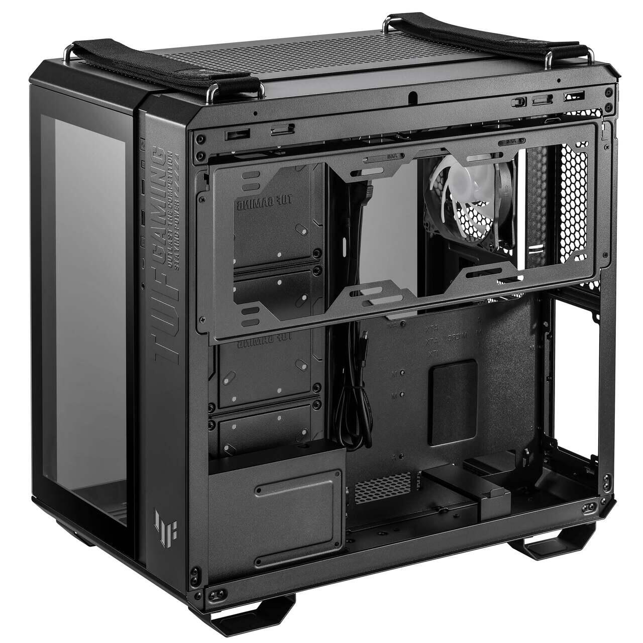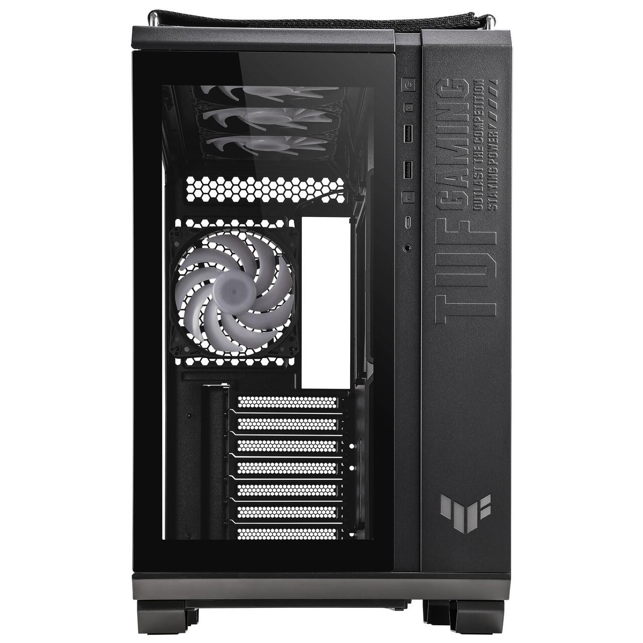 Carcasa Asus TUF Gaming GT502 PLUS aRGB Tempered Glass neagra, SECC Steel ATX Mid Tower, compartimentare dubla – dual chamber, design modular, fara sursa (tip ATX, montata jos), interior vopsit negru, 4x3.5” (intern combo 2.5”/3.5”), design tool-less, interior dreapta – 3x 120mm fan (optional), spate – 1x 120mm fan (inclus), tavan – 3x 120mm fan (inclus) / 2x 140mm fan (optional), compartiment sursa – 3x 120mm / 2x 140mm fan (optional), design premium cu panou frontal si lateral din sticla securizata, 2x USB 3.1 Gen1, 1 x USB 3.2 Gen2 Type-C, 1 x USB 3.2 Gen 2x2, HD Audio, ATX / microATX / Mini-ITX, sloturi expansiune: x8+3, inaltime maxima cooler procesor: 163mm, lungime maxima placa video: 400 mm, lungima maxima sursa: 200mm, suport radiatoare water cooling: tavan – 1x 120/140/240/280/360mm, compartiment sursa – 1x 120/140/240/280/360mm, include filtre de praf (superior si inferior), spatiu gestionare cabluri in compartimentul sursei, chingi pentru transport textile ce suporta pana la 30kg, dimensiuni: 450x285x446mm, greutate: 11kg