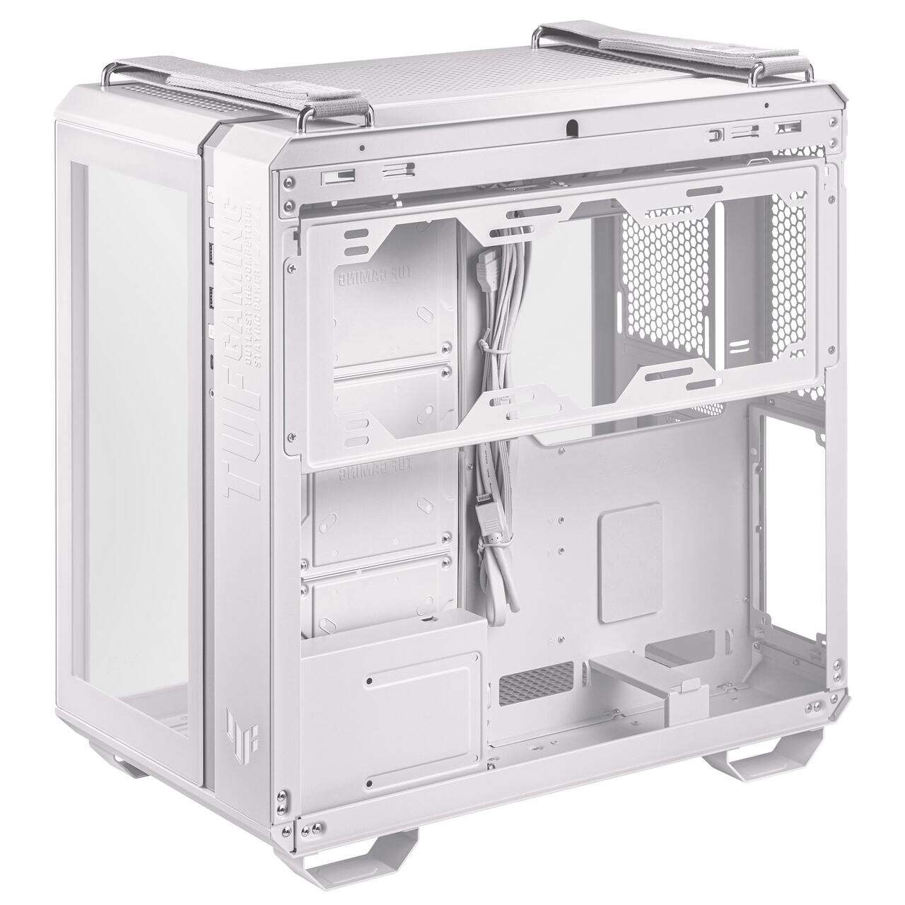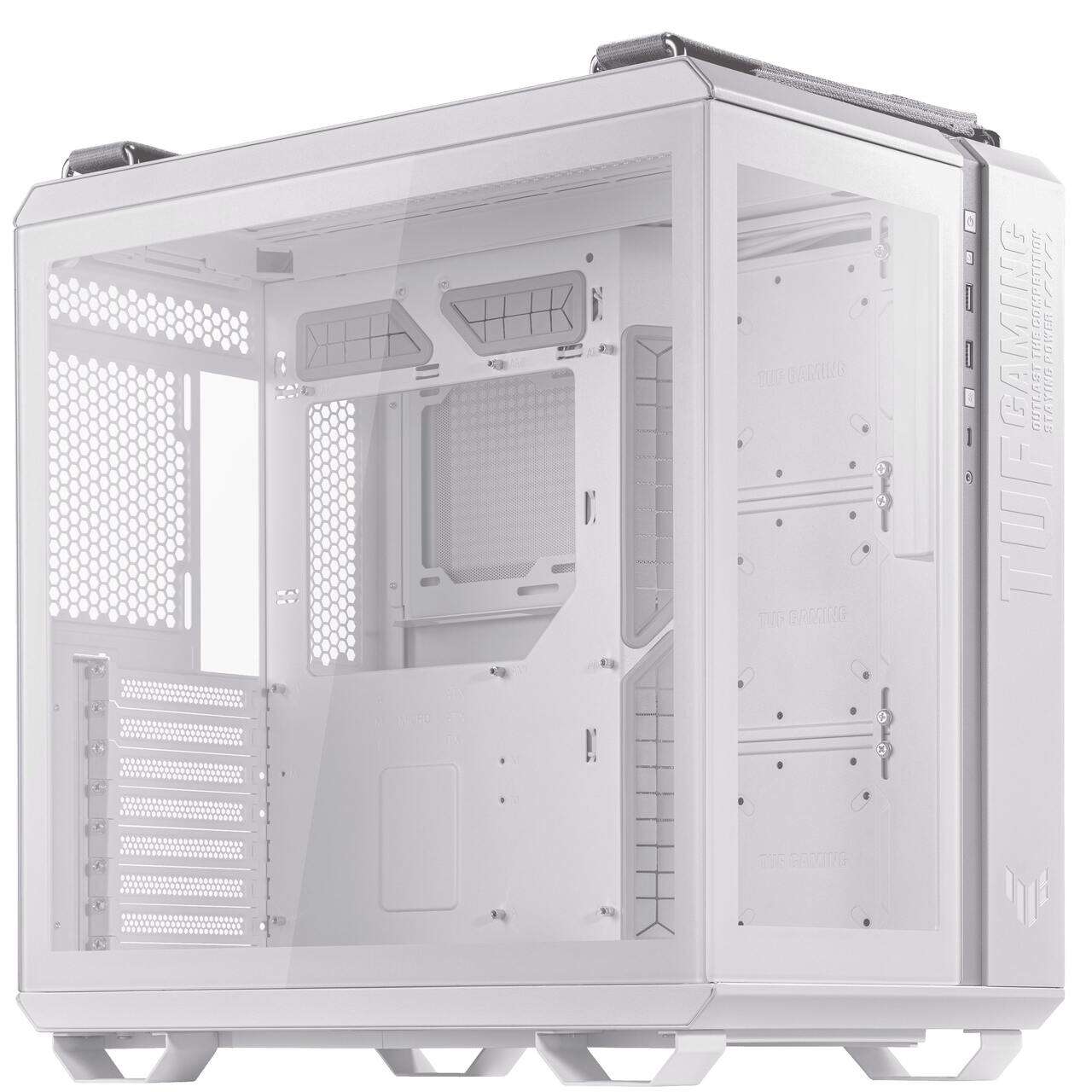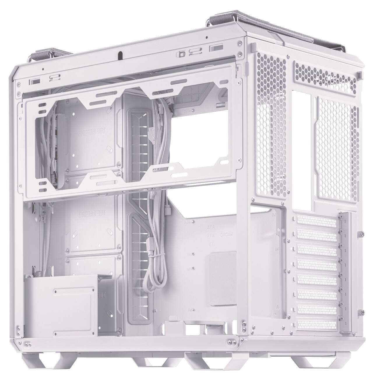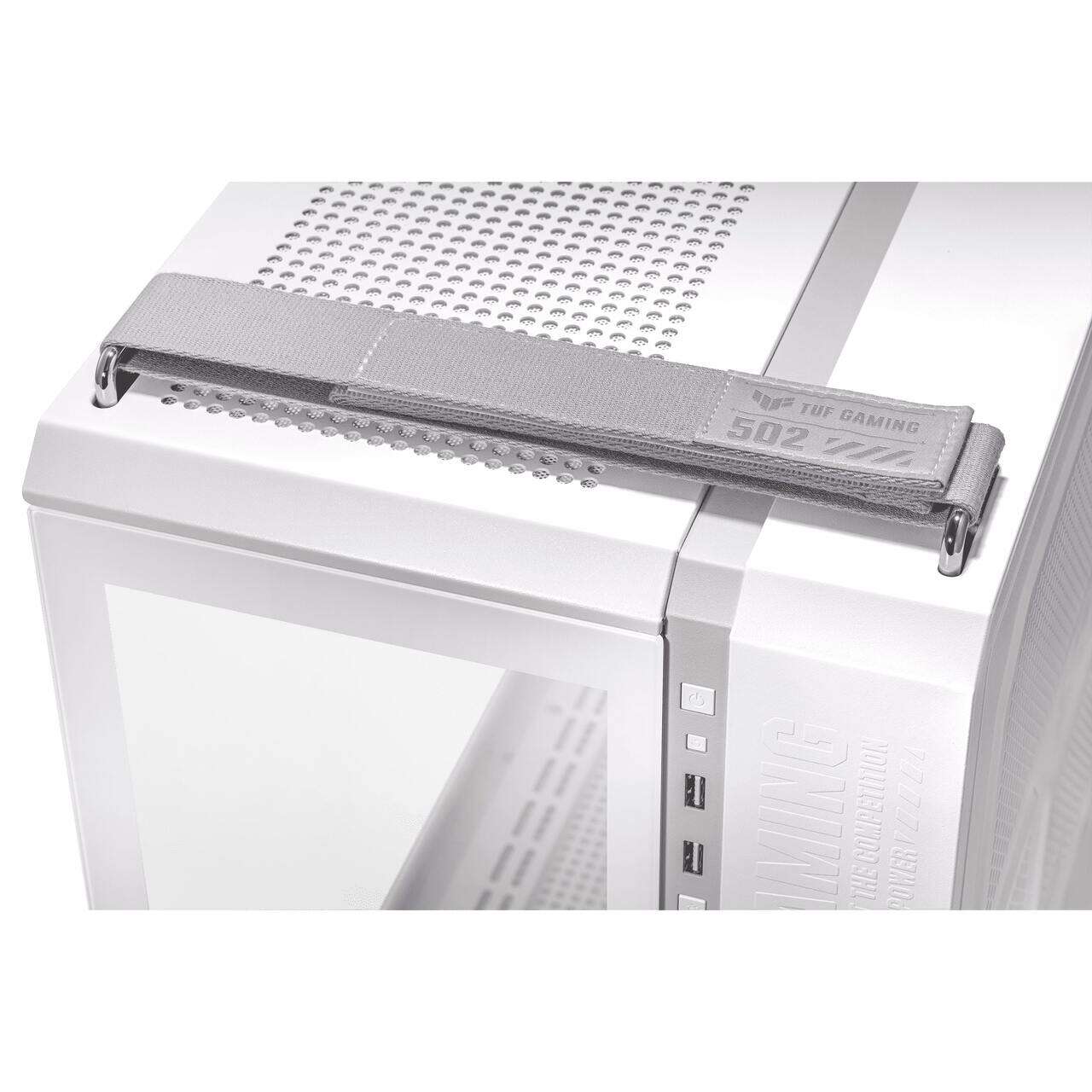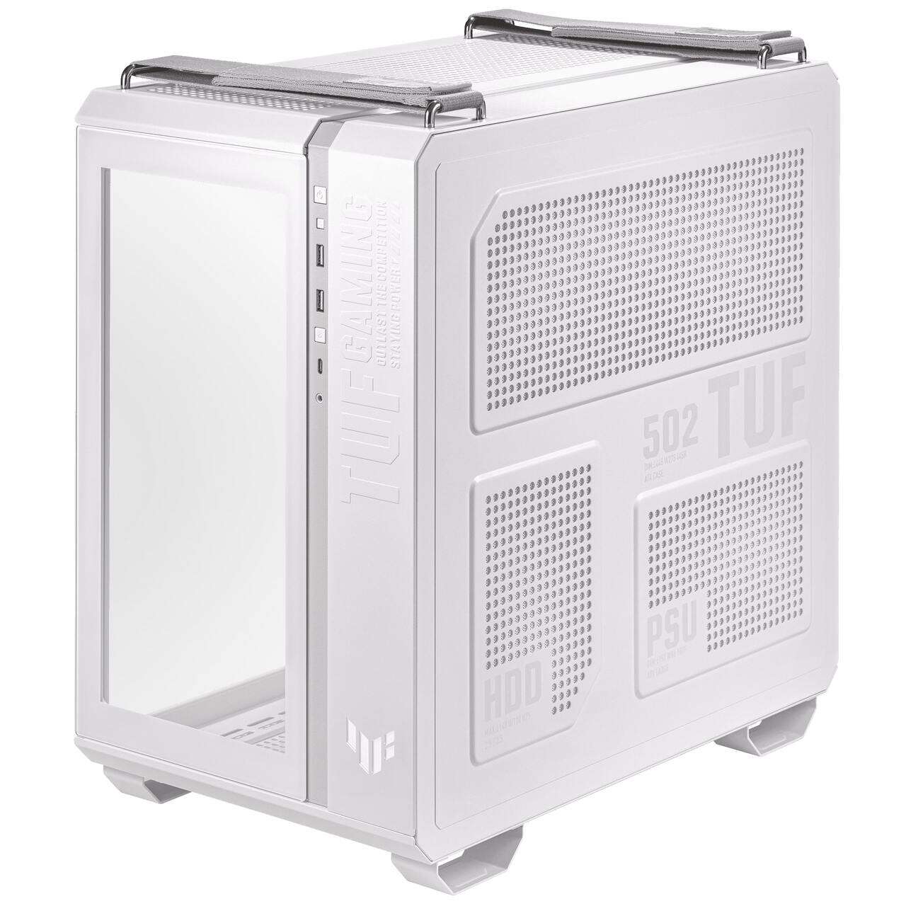 Carcasa ASUS TUF GT502 alba, SECC Steel ATX Mid Tower, compartimentare dubla – dual chamber, design modular, fara sursa (tip ATX, montata jos), interior vopsit alb, 4x3.5” (intern combo 2.5”/3.5”), design tool-less, interior dreapta – 3x 120mm fan (optional), spate – 1x 120mm fan (optional), tavan – 3x 120mm / 2x 140mm fan (optional), podea – 3x 120mm / 2x 140mm fan (optional), compartiment sursa – 3x 120mm / 2x 140mm fan (optional), design premium cu panou frontal si lateral din sticla securizata, 2x USB 3.1 Gen1, 1 x USB 3.2 Gen2 Type-C, HD Audio, ATX / microATX / Mini-ITX, sloturi expansiune: x8+3, inaltime maxima cooler procesor: 163mm, lungime maxima placa video: 400 mm, lungima maxima sursa: 200mm, suport radiatoare water cooling: interior dreapta – 1x 120/240/360mm, tavan – 1x 120/140/240/280/360mm, compartiment sursa – 1x 120/140/240/280/360mm, include filtre de praf (superior si inferior), spatiu gestionare cabluri in compartimentul sursei, chingi pentru transport textile ce suporta pana la 30kg, dimensiuni: 450x285x446mm, greutate: 11kg