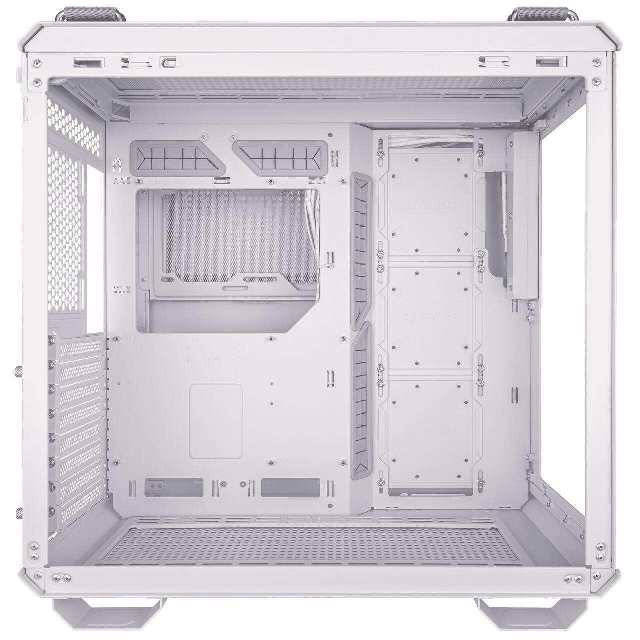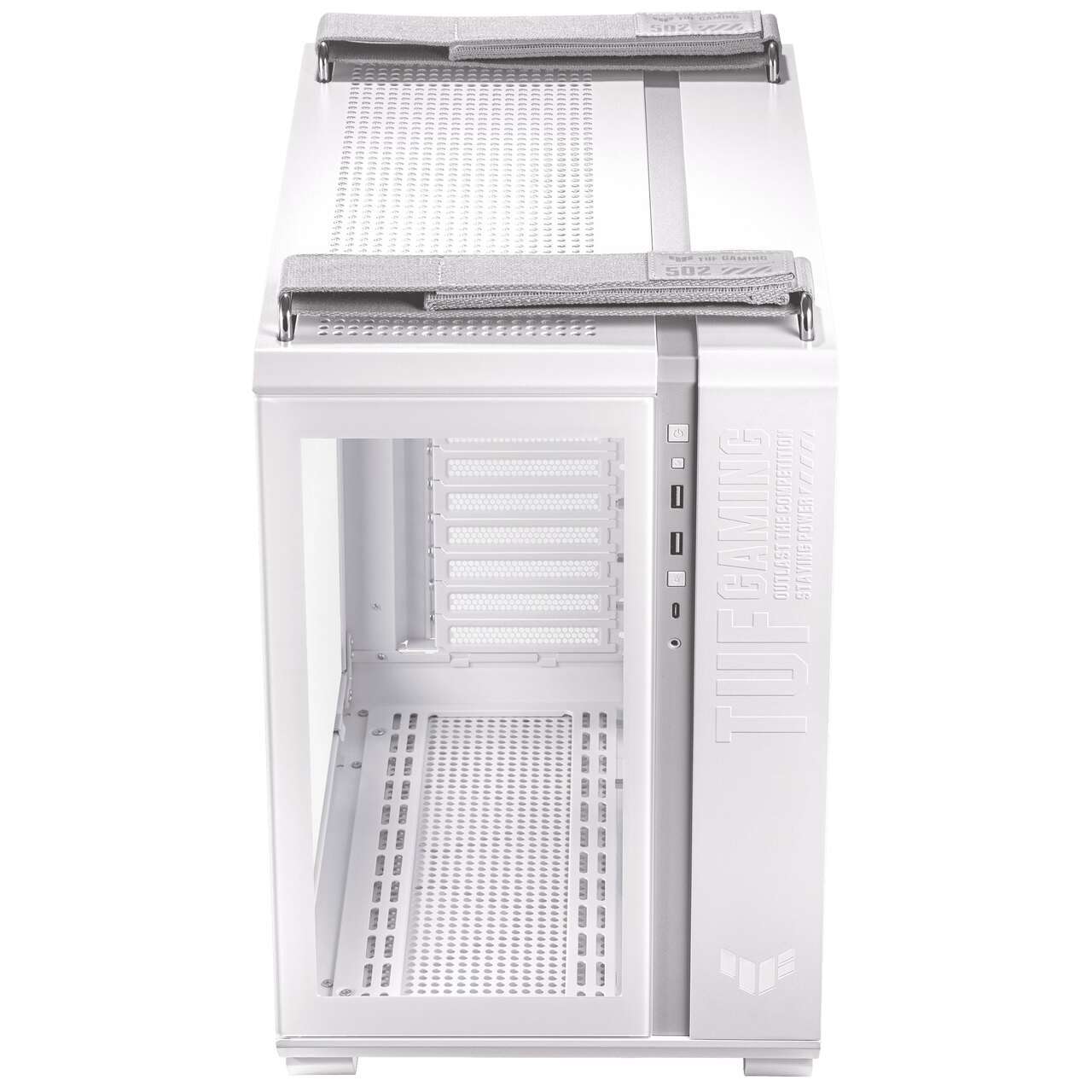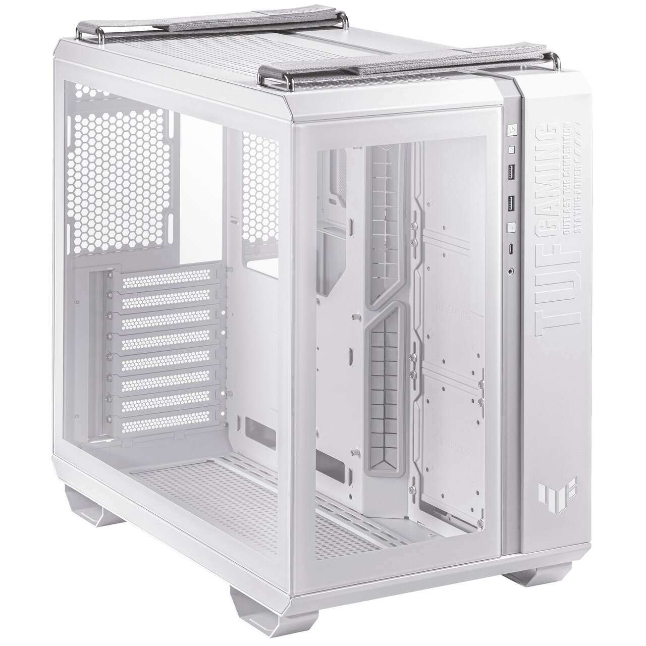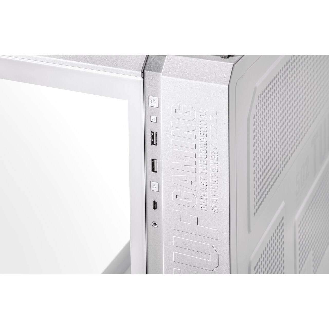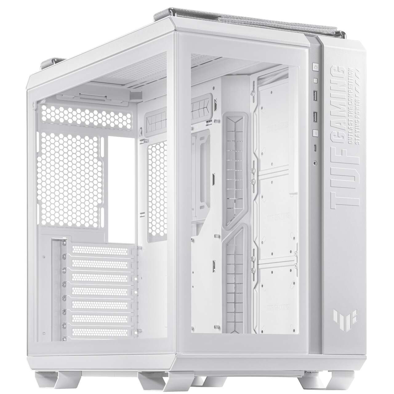 Carcasa ASUS TUF GT502 alba, SECC Steel ATX Mid Tower, compartimentare dubla – dual chamber, design modular, fara sursa (tip ATX, montata jos), interior vopsit alb, 4x3.5” (intern combo 2.5”/3.5”), design tool-less, interior dreapta – 3x 120mm fan (optional), spate – 1x 120mm fan (optional), tavan – 3x 120mm / 2x 140mm fan (optional), podea – 3x 120mm / 2x 140mm fan (optional), compartiment sursa – 3x 120mm / 2x 140mm fan (optional), design premium cu panou frontal si lateral din sticla securizata, 2x USB 3.1 Gen1, 1 x USB 3.2 Gen2 Type-C, HD Audio, ATX / microATX / Mini-ITX, sloturi expansiune: x8+3, inaltime maxima cooler procesor: 163mm, lungime maxima placa video: 400 mm, lungima maxima sursa: 200mm, suport radiatoare water cooling: interior dreapta – 1x 120/240/360mm, tavan – 1x 120/140/240/280/360mm, compartiment sursa – 1x 120/140/240/280/360mm, include filtre de praf (superior si inferior), spatiu gestionare cabluri in compartimentul sursei, chingi pentru transport textile ce suporta pana la 30kg, dimensiuni: 450x285x446mm, greutate: 11kg