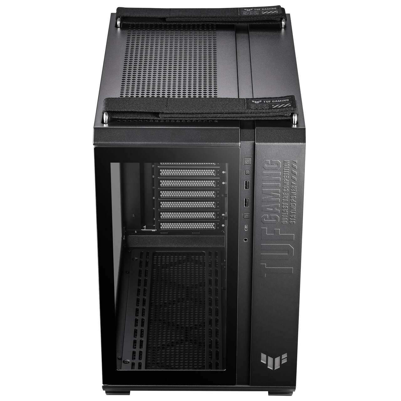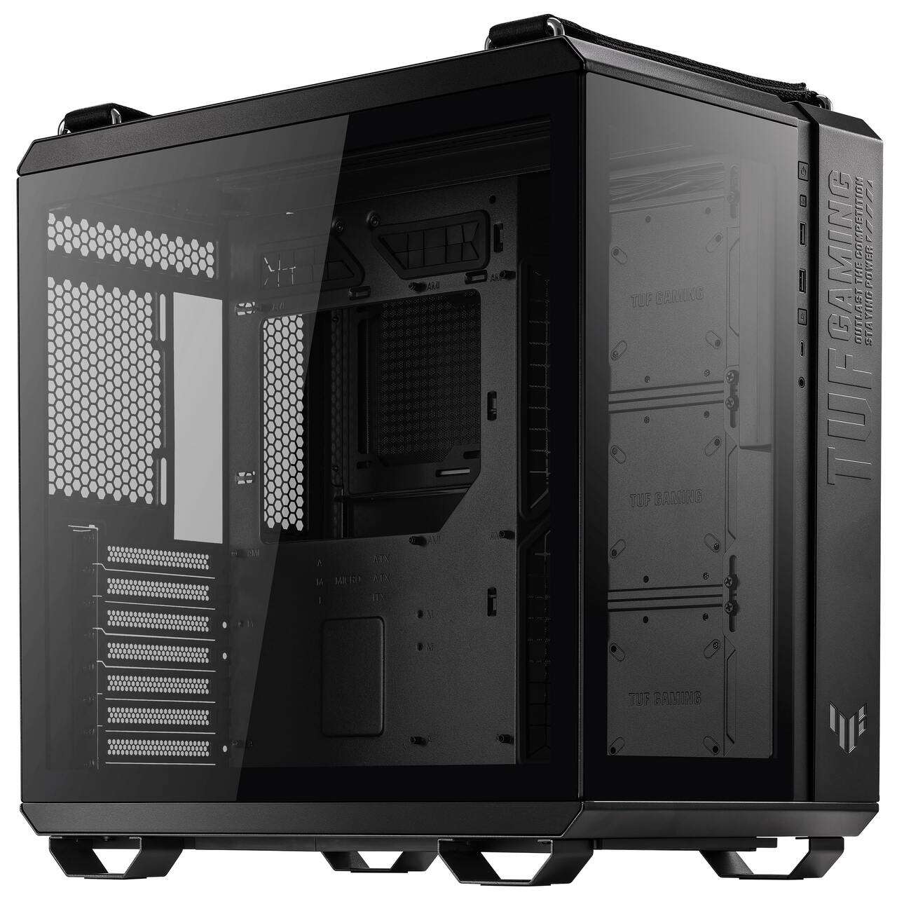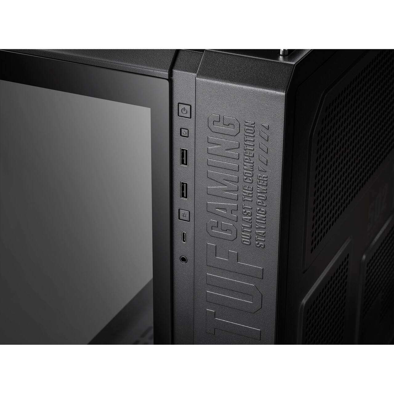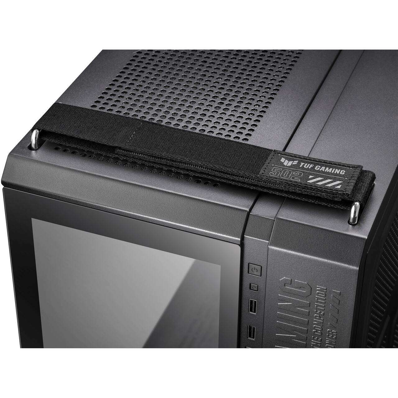 Carcasa ASUS TUF GT502 neagra, SECC Steel ATX Mid Tower, compartimentare dubla – dual chamber, design modular, fara sursa (tip ATX, montata jos), interior vopsit negru, 4x3.5” (intern combo 2.5”/3.5”), design tool-less, interior dreapta – 3x 120mm fan (optional), spate – 1x 120mm fan (optional), tavan – 3x 120mm / 2x 140mm fan (optional), podea – 3x 120mm / 2x 140mm fan (optional), compartiment sursa – 3x 120mm / 2x 140mm fan (optional), design premium cu panou frontal si lateral din sticla securizata, 2x USB 3.1 Gen1, 1 x USB 3.2 Gen2 Type-C, HD Audio, ATX / microATX / Mini-ITX, sloturi expansiune: x8+3, inaltime maxima cooler procesor: 163mm, lungime maxima placa video: 400 mm, lungima maxima sursa: 200mm, suport radiatoare water cooling: interior dreapta – 1x 120/240/360mm, tavan – 1x 120/140/240/280/360mm, compartiment sursa – 1x 120/140/240/280/360mm, include filtre de praf (superior si inferior), spatiu gestionare cabluri in compartimentul sursei, chingi pentru transport textile ce suporta pana la 30kg, dimensiuni: 450x285x446mm, greutate: 11kg