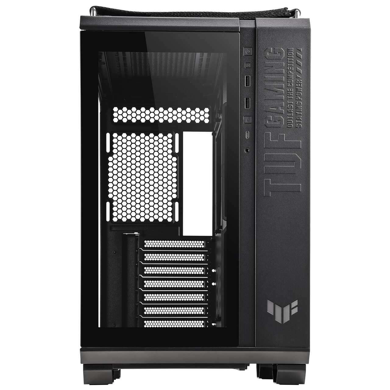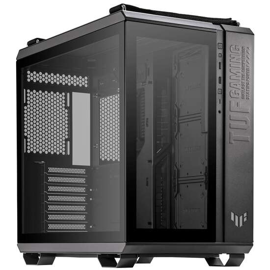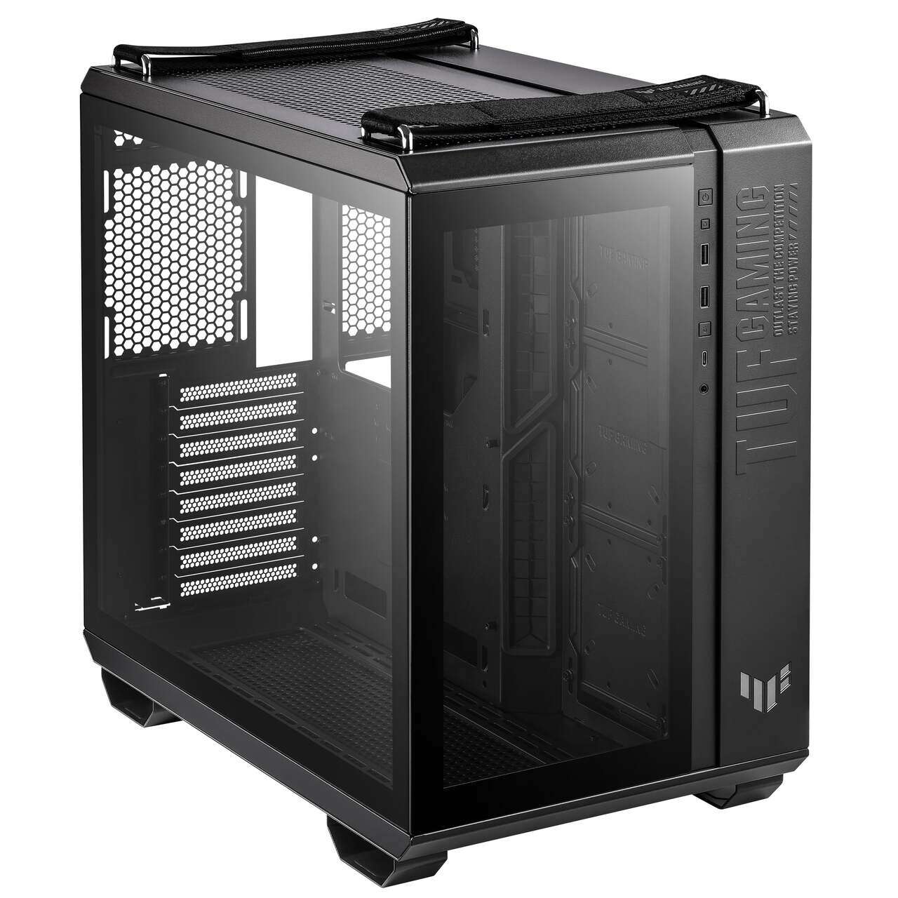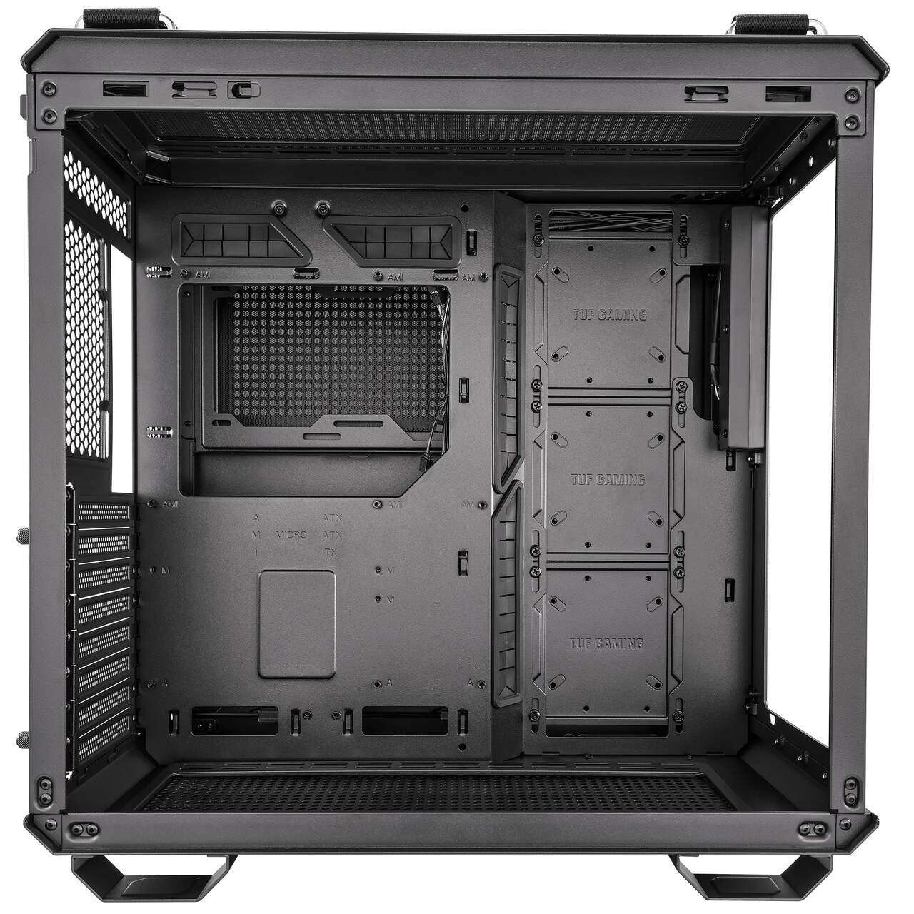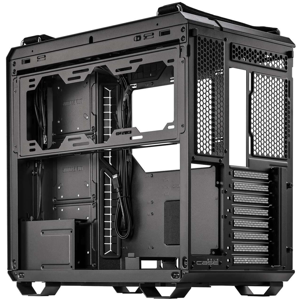 Carcasa ASUS TUF GT502 neagra, SECC Steel ATX Mid Tower, compartimentare dubla – dual chamber, design modular, fara sursa (tip ATX, montata jos), interior vopsit negru, 4x3.5” (intern combo 2.5”/3.5”), design tool-less, interior dreapta – 3x 120mm fan (optional), spate – 1x 120mm fan (optional), tavan – 3x 120mm / 2x 140mm fan (optional), podea – 3x 120mm / 2x 140mm fan (optional), compartiment sursa – 3x 120mm / 2x 140mm fan (optional), design premium cu panou frontal si lateral din sticla securizata, 2x USB 3.1 Gen1, 1 x USB 3.2 Gen2 Type-C, HD Audio, ATX / microATX / Mini-ITX, sloturi expansiune: x8+3, inaltime maxima cooler procesor: 163mm, lungime maxima placa video: 400 mm, lungima maxima sursa: 200mm, suport radiatoare water cooling: interior dreapta – 1x 120/240/360mm, tavan – 1x 120/140/240/280/360mm, compartiment sursa – 1x 120/140/240/280/360mm, include filtre de praf (superior si inferior), spatiu gestionare cabluri in compartimentul sursei, chingi pentru transport textile ce suporta pana la 30kg, dimensiuni: 450x285x446mm, greutate: 11kg