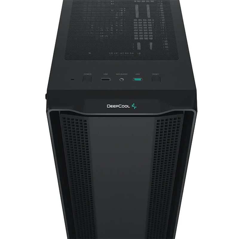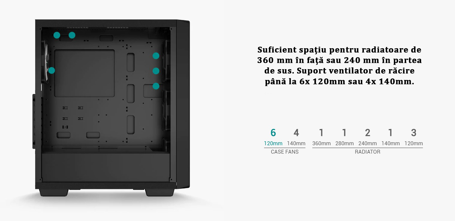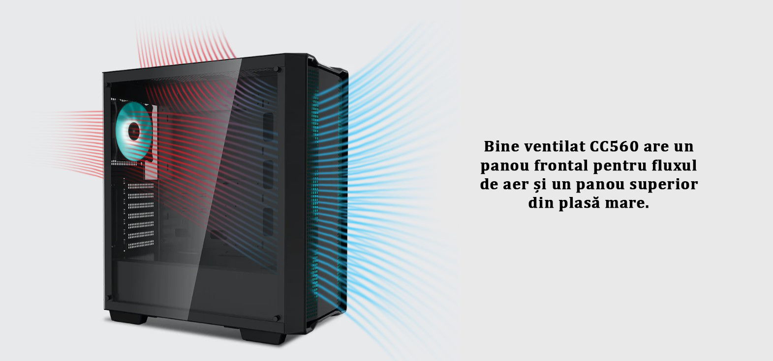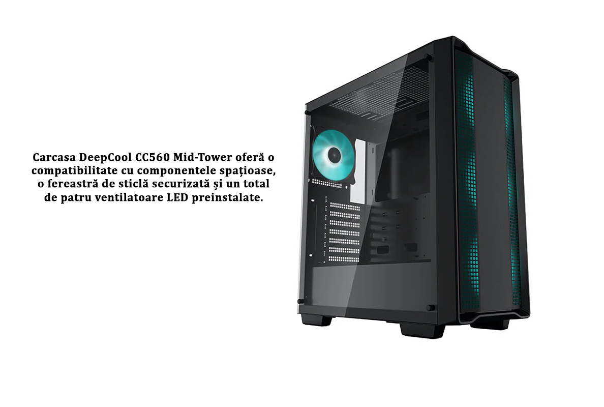 Carcasa Deepcool CC560 neagra, ABS+SPCC Steel ATX Mid Tower, fara sursa (tip ATX, montata jos), interior vopsit negru, 2x3,5”/2.5” (intern), 2+1x2,5” (intern), spate – 1x120mm fan (inclus) / 1x 140mm (optional), fata – 3x120mm fan (inclus) / 2x 140mm fan (optional), tavan – 2x 120mm / 2x 140mm fans (optional), 1x USB 2.0, 1x USB 3.0, HD Audio, design premium cu panou lateral din sticla securizata, sloturi expansiune: x7, ATX / microATX / Mini-ITX, inaltime maxima cooler procesor: 163mm, lungime maxima placa video: 370mm), suport radiatoare water cooling: spate – 120/140mm, fata – 120/140/240/280/360mm, tavan – 120/140/240/280mm, dimensiuni (LxWxH): 416x210x477mm, greutate: 5.25 kg