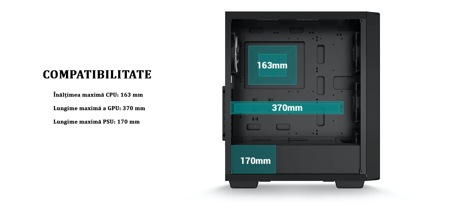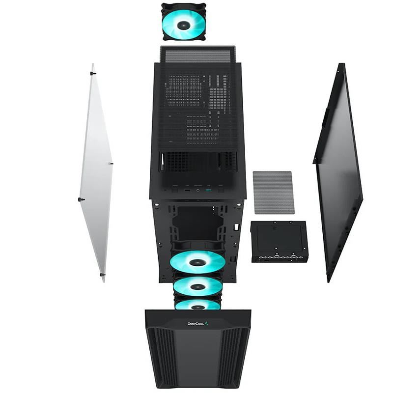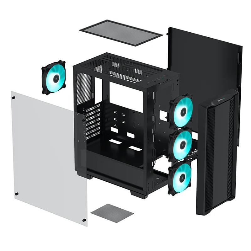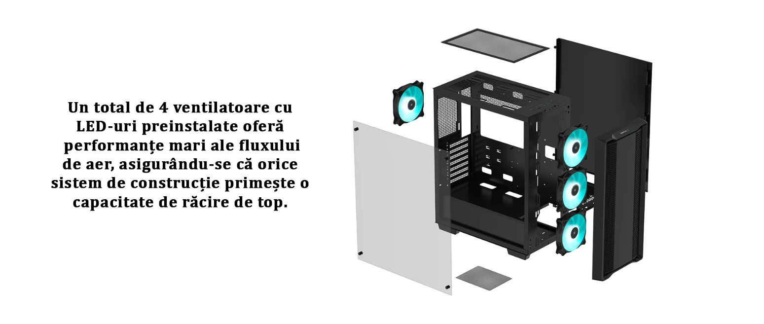 Carcasa Deepcool CC560 neagra, ABS+SPCC Steel ATX Mid Tower, fara sursa (tip ATX, montata jos), interior vopsit negru, 2x3,5”/2.5” (intern), 2+1x2,5” (intern), spate – 1x120mm fan (inclus) / 1x 140mm (optional), fata – 3x120mm fan (inclus) / 2x 140mm fan (optional), tavan – 2x 120mm / 2x 140mm fans (optional), 1x USB 2.0, 1x USB 3.0, HD Audio, design premium cu panou lateral din sticla securizata, sloturi expansiune: x7, ATX / microATX / Mini-ITX, inaltime maxima cooler procesor: 163mm, lungime maxima placa video: 370mm), suport radiatoare water cooling: spate – 120/140mm, fata – 120/140/240/280/360mm, tavan – 120/140/240/280mm, dimensiuni (LxWxH): 416x210x477mm, greutate: 5.25 kg