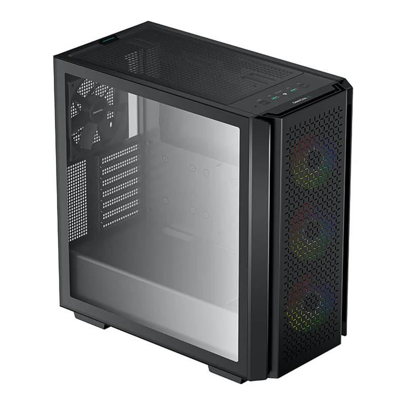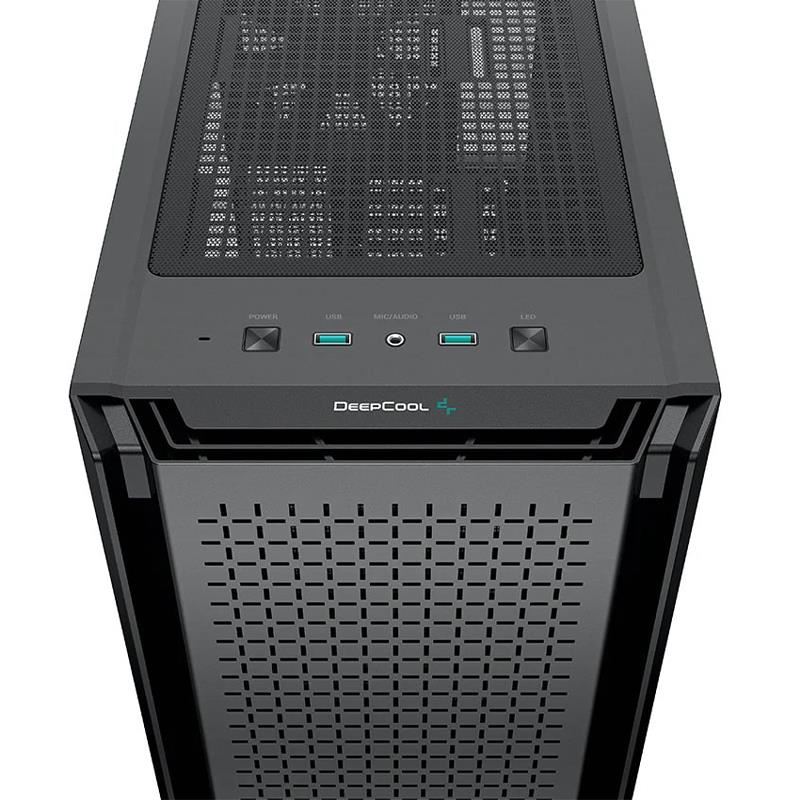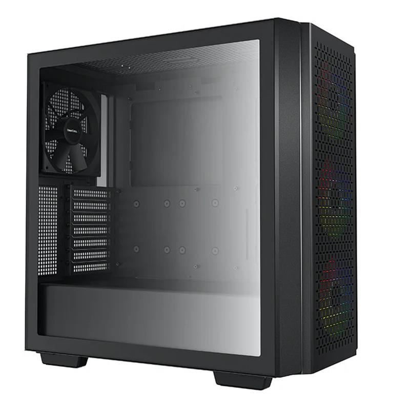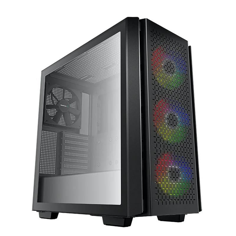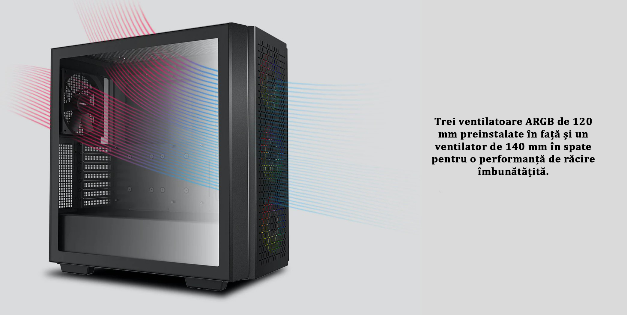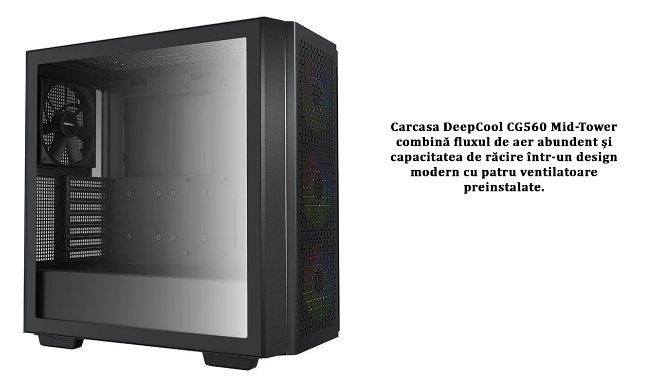 Carcasa Deepcool CG560 neagra, ABS+SPCC Steel ATX Mid Tower, fara sursa (tip ATX, montata jos), interior vopsit negru, 2x3,5”/2.5” (intern), 2+1x2,5” (intern), spate – 1x140mm fan (inclus) / 1x 120mm (optional), fata – 3x120mm aRGB fan (inclus) / 2x 140mm fan (optional), tavan – 2x 120mm / 2x 140mm fans (optional), 2x USB 3.0, HD Audio, design premium cu panou lateral din sticla securizata, sloturi expansiune: x7, EATX / ATX / microATX / Mini-ITX, inaltime maxima cooler procesor: 175mm, lungime maxima placa video: 380mm), suport radiatoare water cooling: spate – 120/140mm, fata – 120/140/240/280/360mm, tavan – 120/140/240/280mm, dimensiuni (LxWxH): 452x230x470mm, greutate: 7 kg