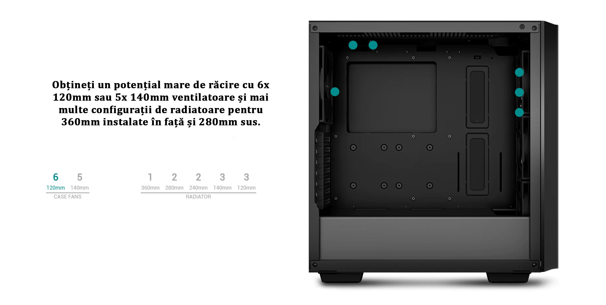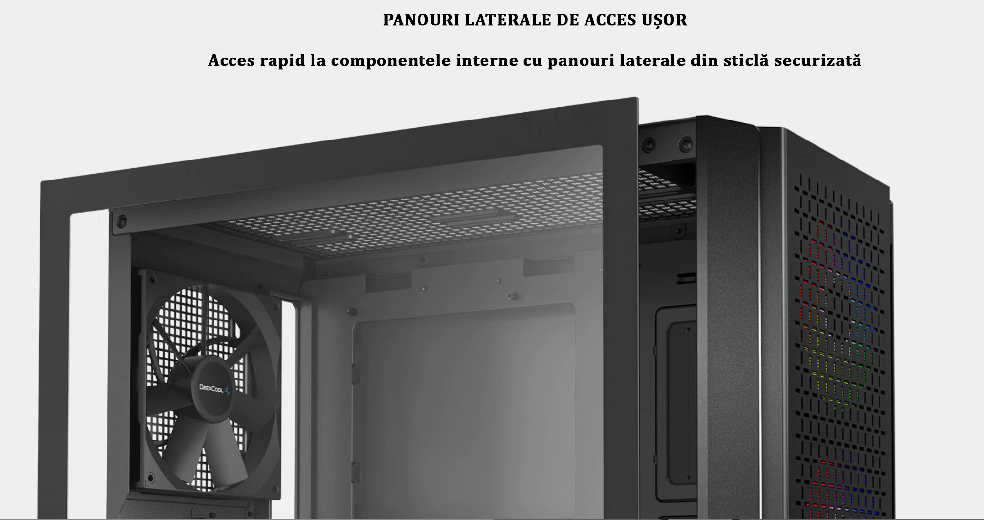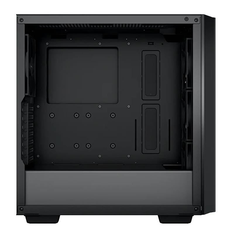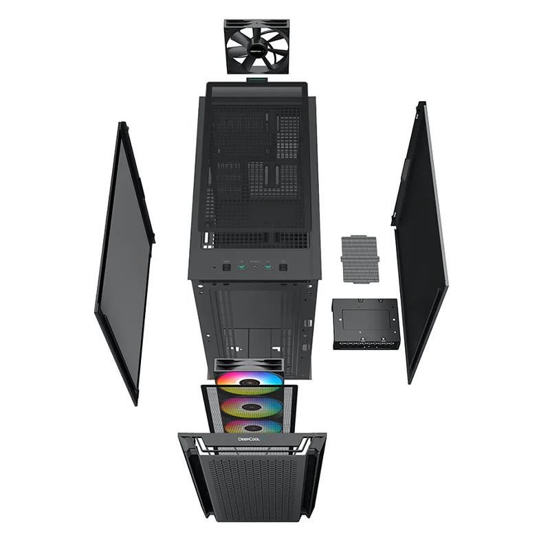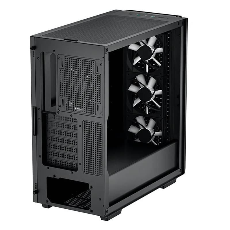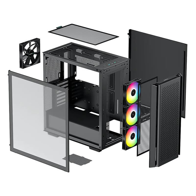 Carcasa Deepcool CG560 neagra, ABS+SPCC Steel ATX Mid Tower, fara sursa (tip ATX, montata jos), interior vopsit negru, 2x3,5”/2.5” (intern), 2+1x2,5” (intern), spate – 1x140mm fan (inclus) / 1x 120mm (optional), fata – 3x120mm aRGB fan (inclus) / 2x 140mm fan (optional), tavan – 2x 120mm / 2x 140mm fans (optional), 2x USB 3.0, HD Audio, design premium cu panou lateral din sticla securizata, sloturi expansiune: x7, EATX / ATX / microATX / Mini-ITX, inaltime maxima cooler procesor: 175mm, lungime maxima placa video: 380mm), suport radiatoare water cooling: spate – 120/140mm, fata – 120/140/240/280/360mm, tavan – 120/140/240/280mm, dimensiuni (LxWxH): 452x230x470mm, greutate: 7 kg