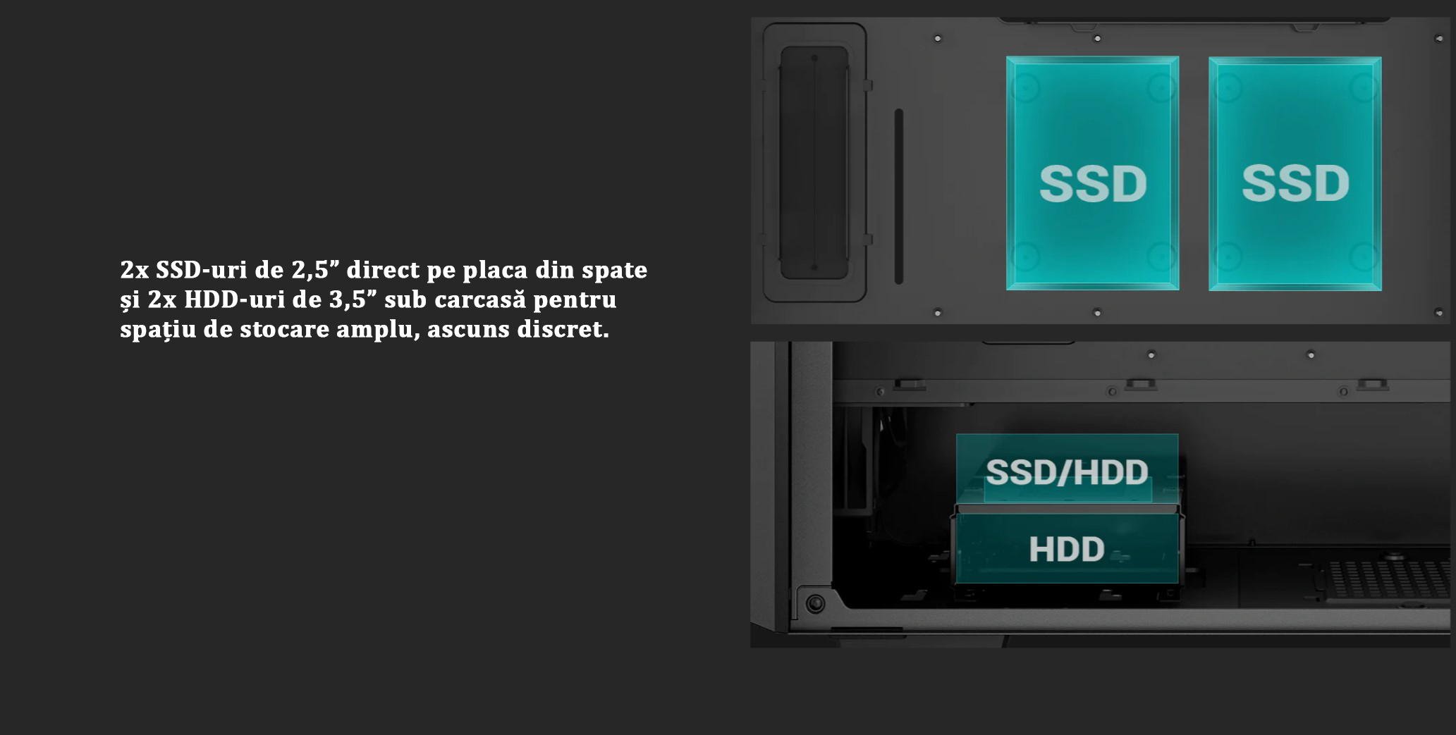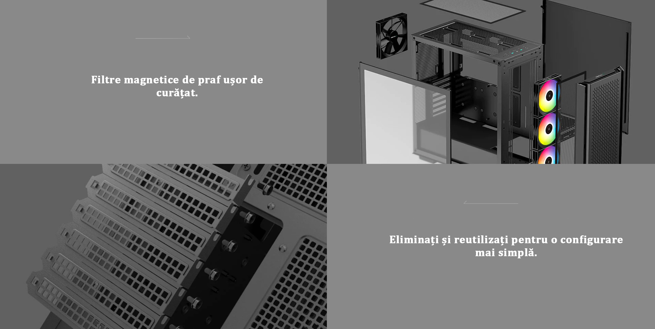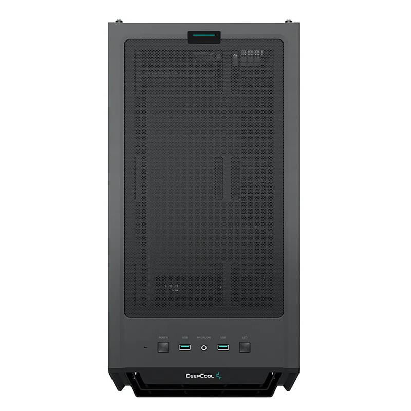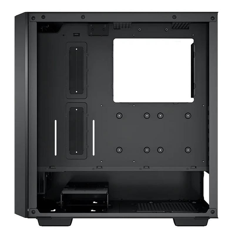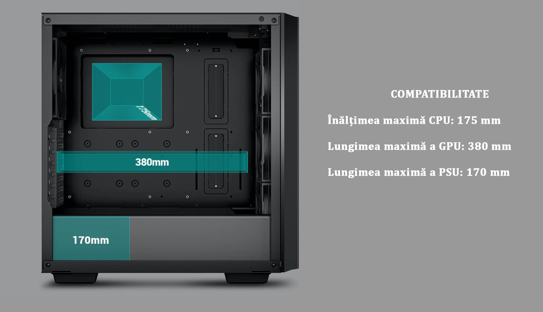 Carcasa Deepcool CG560 neagra, ABS+SPCC Steel ATX Mid Tower, fara sursa (tip ATX, montata jos), interior vopsit negru, 2x3,5”/2.5” (intern), 2+1x2,5” (intern), spate – 1x140mm fan (inclus) / 1x 120mm (optional), fata – 3x120mm aRGB fan (inclus) / 2x 140mm fan (optional), tavan – 2x 120mm / 2x 140mm fans (optional), 2x USB 3.0, HD Audio, design premium cu panou lateral din sticla securizata, sloturi expansiune: x7, EATX / ATX / microATX / Mini-ITX, inaltime maxima cooler procesor: 175mm, lungime maxima placa video: 380mm), suport radiatoare water cooling: spate – 120/140mm, fata – 120/140/240/280/360mm, tavan – 120/140/240/280mm, dimensiuni (LxWxH): 452x230x470mm, greutate: 7 kg