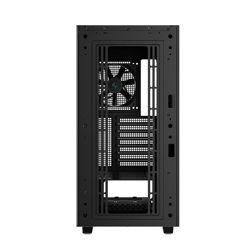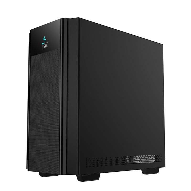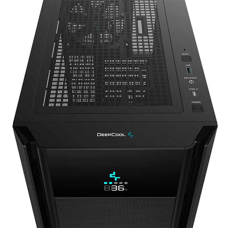 Carcasa Deepcool CH510 Mesh Digital neagra, ABS+SPCC Steel ATX Mid Tower, fara sursa (tip ATX, montata jos), interior vopsit negru, 2x3,5” (intern), 2+1x2,5” (intern), spate – 1x120mm fan (inclus) / 1x 140mm (optional), fata – 3x120mm (optional) / 2x 140mm fan (optional), tavan – 3x 120mm / 2x 140mm fans (optional), podea – 2x 120mm fan (optional), 1x USB 3.0, 1x USB Type-C, HD Audio, design premium cu panou lateral din sticla securizata, inlcude display pentru afisarea temparaturii procesorului sau placii video, power cover inclus, suport placa video ajustabil, sloturi expansiune: x7, E-ATX / ATX / microATX / Mini-ITX, inaltime maxima cooler procesor: 175mm, lungime maxima placa video: 380mm, suport radiatoare water cooling: spate – 120/140mm, fata – 120/140/240/280/360mm, tavan – 120/140/240/280/360mm, dimensiuni (LxWxH): 455x230x470mm, greutate: 7.5 kg