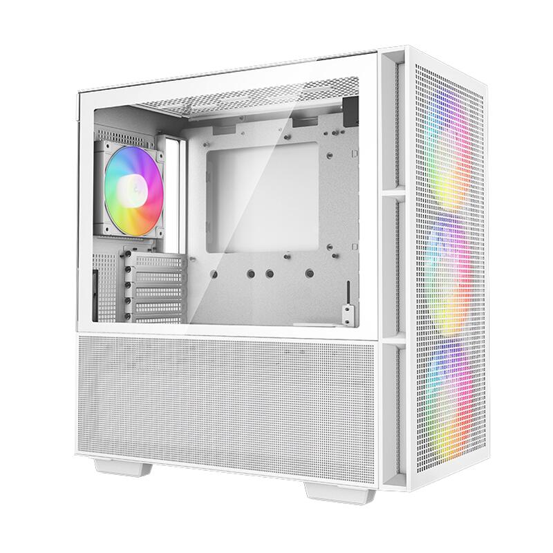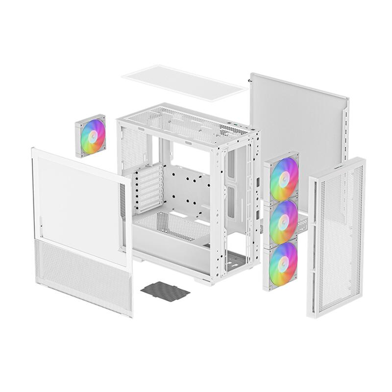 Carcasa Deepcool CH560 alba, ABS+SPCC Steel ATX Mid Tower, fara sursa (tip ATX, montata jos), interior vopsit alb, 2x3,5”/2.5” (intern), 2+1x2,5” (intern), spate – 1x120mm fan (inclus) / 1x 140mm (optional), fata – 3x140mm aRGB fan (inclus) / 3x 120mm fan (optional), tavan – 3x 120mm / 2x 140mm fans (optional), podea – 2x 120mm fan (optional), 1x USB 3.0, 1x USB Type-C, HD Audio, design premium cu panou lateral din sticla securizata, include suport placa video, sloturi expansiune: x7, EATX / ATX / microATX / Mini-ITX, inaltime maxima cooler procesor: 175mm, lungime maxima placa video: 380mm, suport radiatoare water cooling: spate – 120/140mm, fata – 120/140/240/280/360mm, tavan – 120/140/240/280/360mm, dimensiuni (LxWxH): 458x230x471mm, greutate: 7.7kg