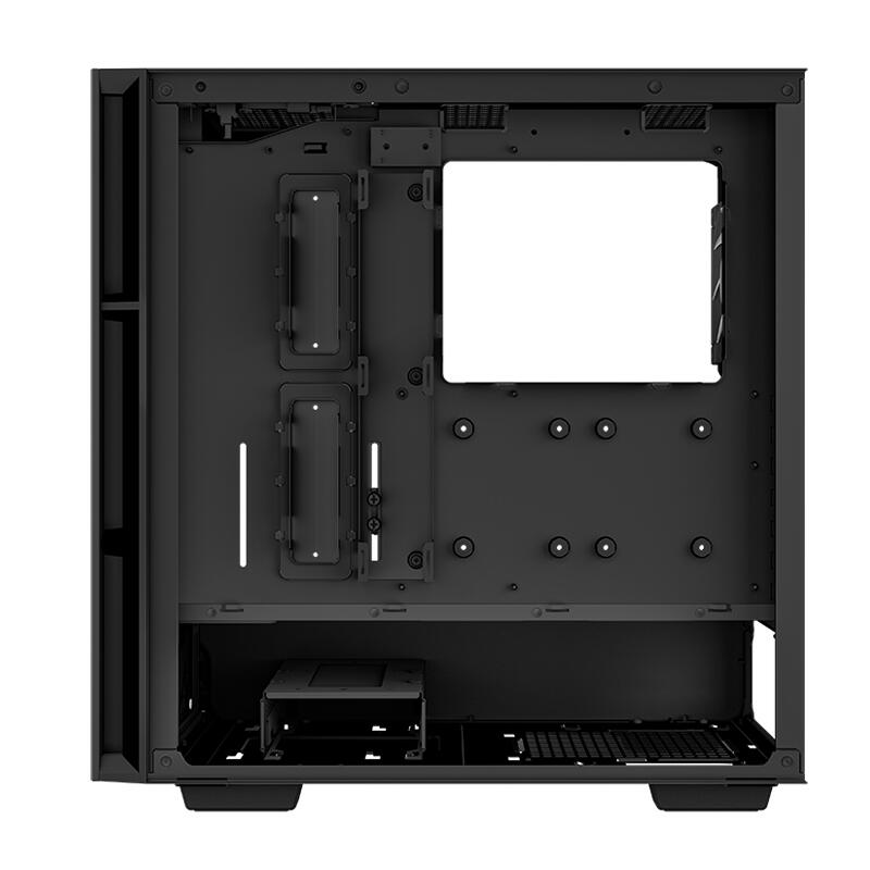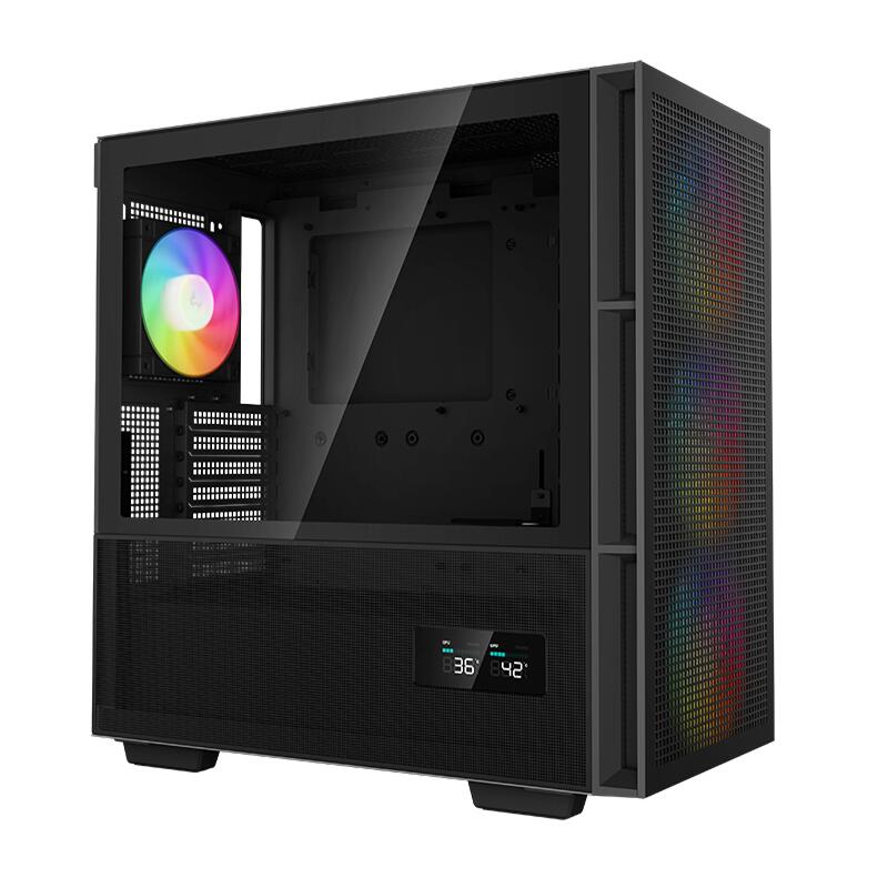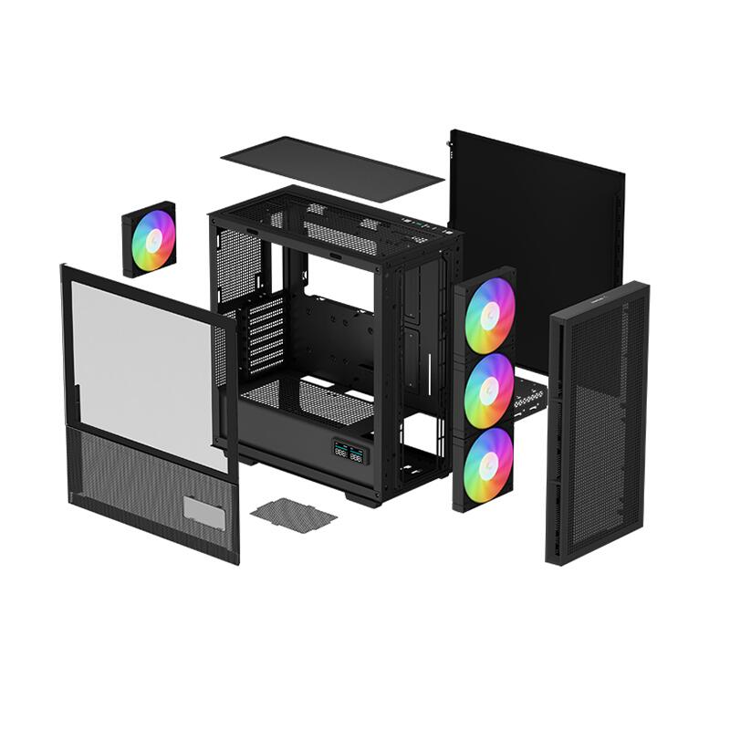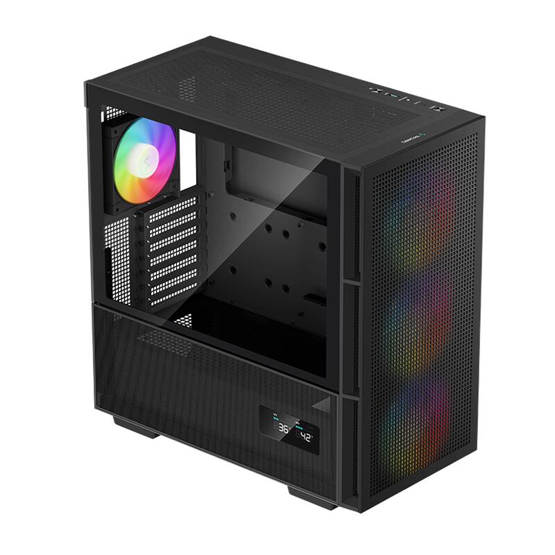 Carcasa Deepcool CH560 Digital neagra, ABS+SPCC Steel ATX Mid Tower, fara sursa (tip ATX, montata jos), interior vopsit negru, 2x3,5”/2.5” (intern), 2+1x2,5” (intern), spate – 1x120mm fan (inclus) / 1x 140mm (optional), fata – 3x140mm aRGB fan (inclus) / 3x 120mm fan (optional), tavan – 3x 120mm / 2x 140mm fans (optional), podea – 2x 120mm fan (optional), 1x USB 3.0, 1x USB Type-C, HD Audio, design premium cu panou lateral din sticla securizata, include display pe laterala ce poate afisa temperatura procesorului si a placii video, gradul de incarcare al lor sau ambele informatii schimbandu-se la interval de 5 secunde, include suport placa video, sloturi expansiune: x7, EATX / ATX / microATX / Mini-ITX, inaltime maxima cooler procesor: 175mm, lungime maxima placa video: 380mm, suport radiatoare water cooling: spate – 120/140mm, fata – 120/140/240/280/360mm, tavan – 120/140/240/280/360mm, dimensiuni (LxWxH): 458x230x471mm, greutate: 7.5kg