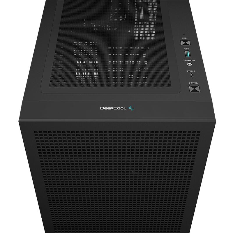 Carcasa Deepcool CH560 neagra, ABS+SPCC Steel ATX Mid Tower, fara sursa (tip ATX, montata jos), interior vopsit negru, 2x3,5”/2.5” (intern), 2+1x2,5” (intern), spate – 1x120mm fan (inclus) / 1x 140mm (optional), fata – 3x140mm aRGB fan (inclus) / 3x 120mm fan (optional), tavan – 3x 120mm / 2x 140mm fans (optional), podea – 2x 120mm fan (optional), 1x USB 3.0, 1x USB Type-C, HD Audio, design premium cu panou lateral din sticla securizata, include suport placa video, sloturi expansiune: x7, EATX / ATX / microATX / Mini-ITX, inaltime maxima cooler procesor: 175mm, lungime maxima placa video: 380mm, suport radiatoare water cooling: spate – 120/140mm, fata – 120/140/240/280/360mm, tavan – 120/140/240/280/360mm, dimensiuni (LxWxH): 458x230x471mm, greutate: 7.5kg