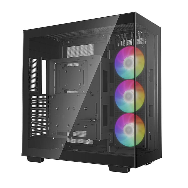 Carcasa Deepcool CH780 neagra, ABS+SPCC+Tempered Glass Mid Tower, fara sursa (tip ATX, montata jos), compartimentata dual chamber, interior vopsit negru, 2x3,5” (intern), 2+1x2,5” (intern), tavan – 3x120mm/140mm / 2x 180mm/200mm fan (optional), podea – 3x120mm/140mm / 2x 180mm/200mm fan (optional), lateral – 1x 420 Trinity aRGB fan (inclus) / 3x 120mm/140mm fans (optional), 4x USB 3.0, 1x USB Type-C, HD Audio, design premium cu panou frontsl si lateral din sticla securizata, suport placa video si cablu riser pentru motare verticala, sloturi expansiune: x3, Mini-ITX / M-ATX / ATX / E-ATX, inaltime maxima cooler procesor: 132mm, lungime maxima placa video: 480mm, suport radiatoare water cooling, podea – 120/140/240/280/360/420mm, tavan – 120/140/240/280/360/420mm, lateral – 120/140/240/280/360/420mm, dimensiuni (LxWxH): 528x250x551mm, greutate: 13.7 kg