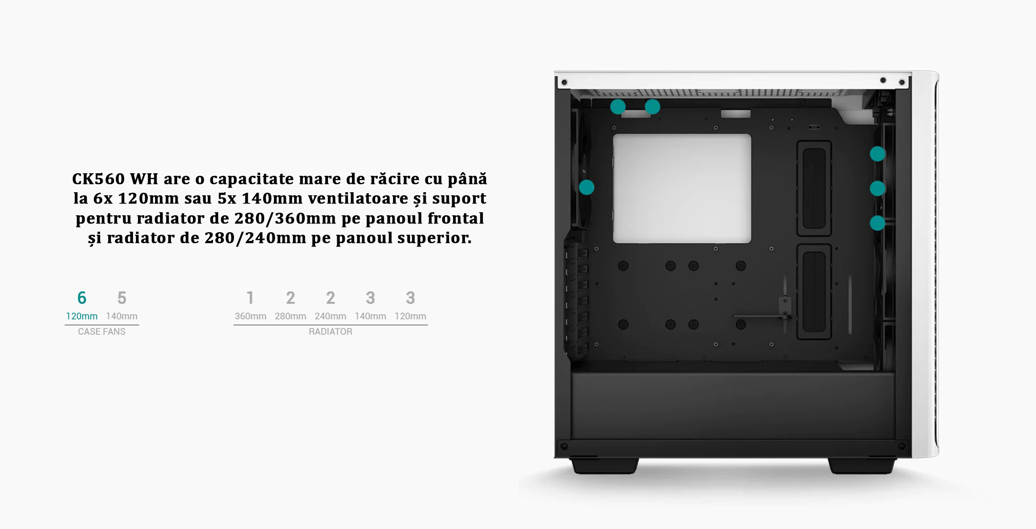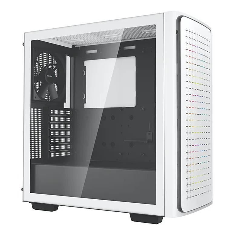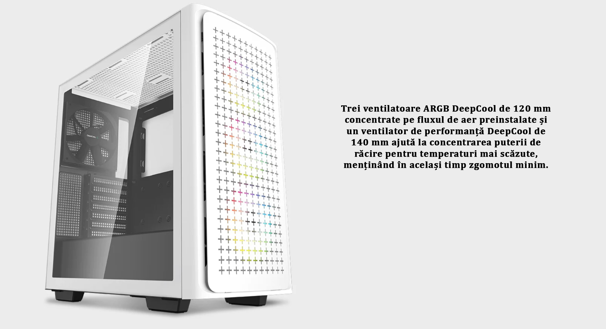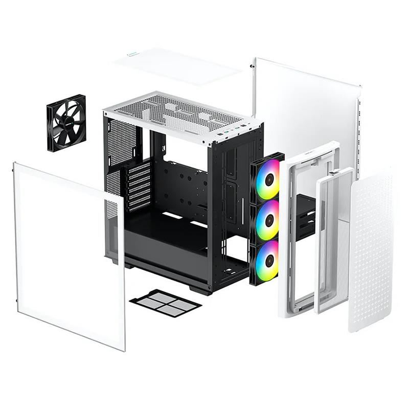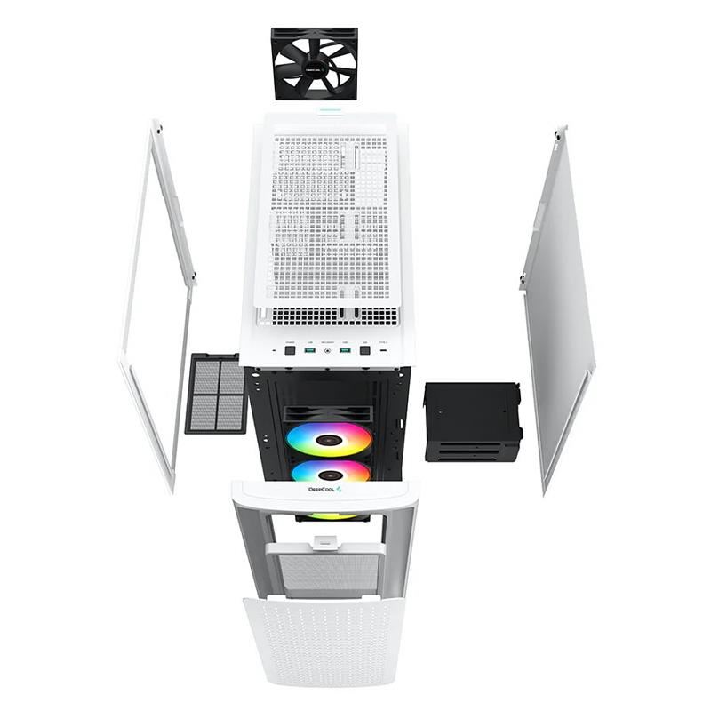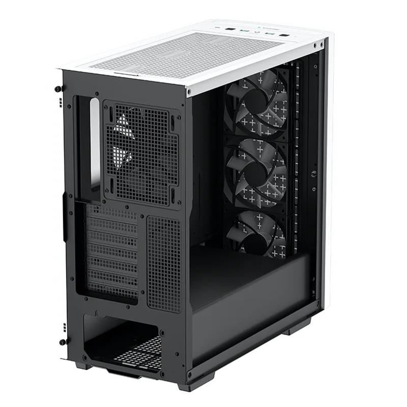 Carcasa Deepcool CK560 alba, ABS+SPCC Steel ATX Mid Tower, fara sursa (tip ATX, montata jos), interior vopsit negru, 2x3,5”/2.5” (intern), 2x2,5” (intern), spate – 1x120mm fan (inclus) / 1x 140mm (optional), fata – 3x120mm aRGB fan (inclus) / 2x 140mm fan (optional), tavan – 2x 120mm / 2x 140mm fans (optional), 2x USB 3.0, 1x USB Type-C, HD Audio, design premium cu panou lateral din sticla securizata, sloturi expansiune: x7, EATX / ATX / microATX / Mini-ITX, inaltime maxima cooler procesor: 175mm, lungime maxima placa video: 380mm), suport radiatoare water cooling: spate – 120/140mm, fata – 120/140/240/280/360mm, tavan – 120/140/240/280mm, dimensiuni (LxWxH): 456x230x471mm, greutate: 8 kg