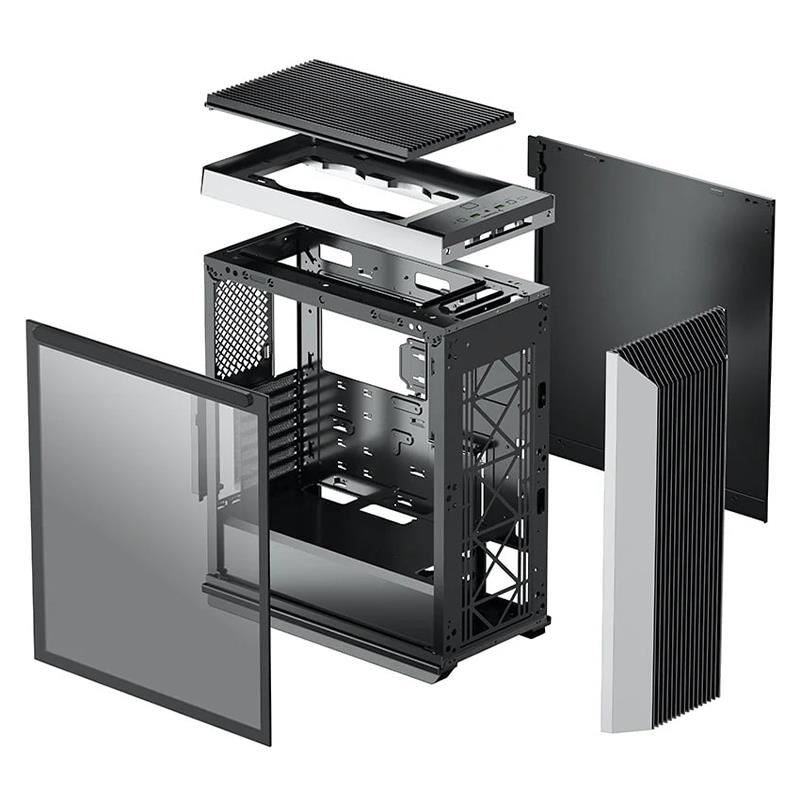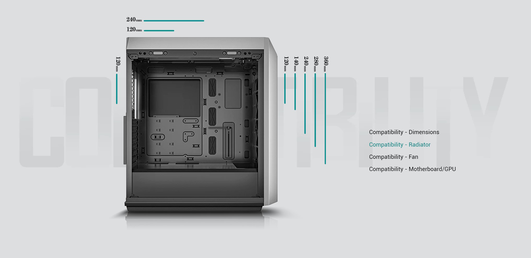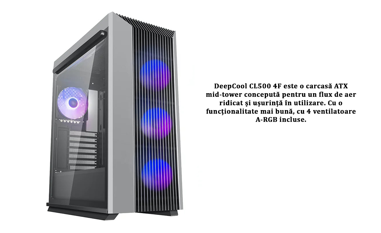 Carcasa Deepcool CL500 4F neagra, ABS+SPCC Steel ATX Mid Tower, fara sursa (tip ATX, montata jos), interior vopsit negru, 2x3,5”/2.5” (intern), 2x2,5” (intern), spate – 1x120mm aRGB fan (inclus) / 1x 140mm (optional), fata – 3x120mm aRGB fan (inclus) / 2x 140mm fan (optional), tavan – 2x 120mm / 2x 140mm fans (optional), 2x USB 3.0, 1x USB Type-C, HD Audio, design premium cu panou lateral din sticla securizata, sloturi expansiune: x7, ATX / microATX / Mini-ITX, inaltime maxima cooler procesor: 165mm, lungime maxima placa video: 330mm), suport radiatoare water cooling: spate – 120mm, fata – 120/140/240/280/360mm, tavan – 120/240mm, dimensiuni (LxWxH): 473x226x519mm, greutate: 8.4 kg
