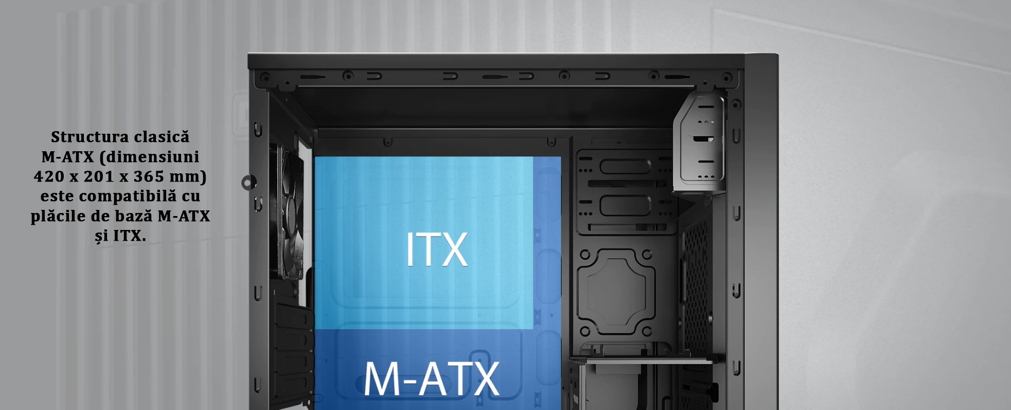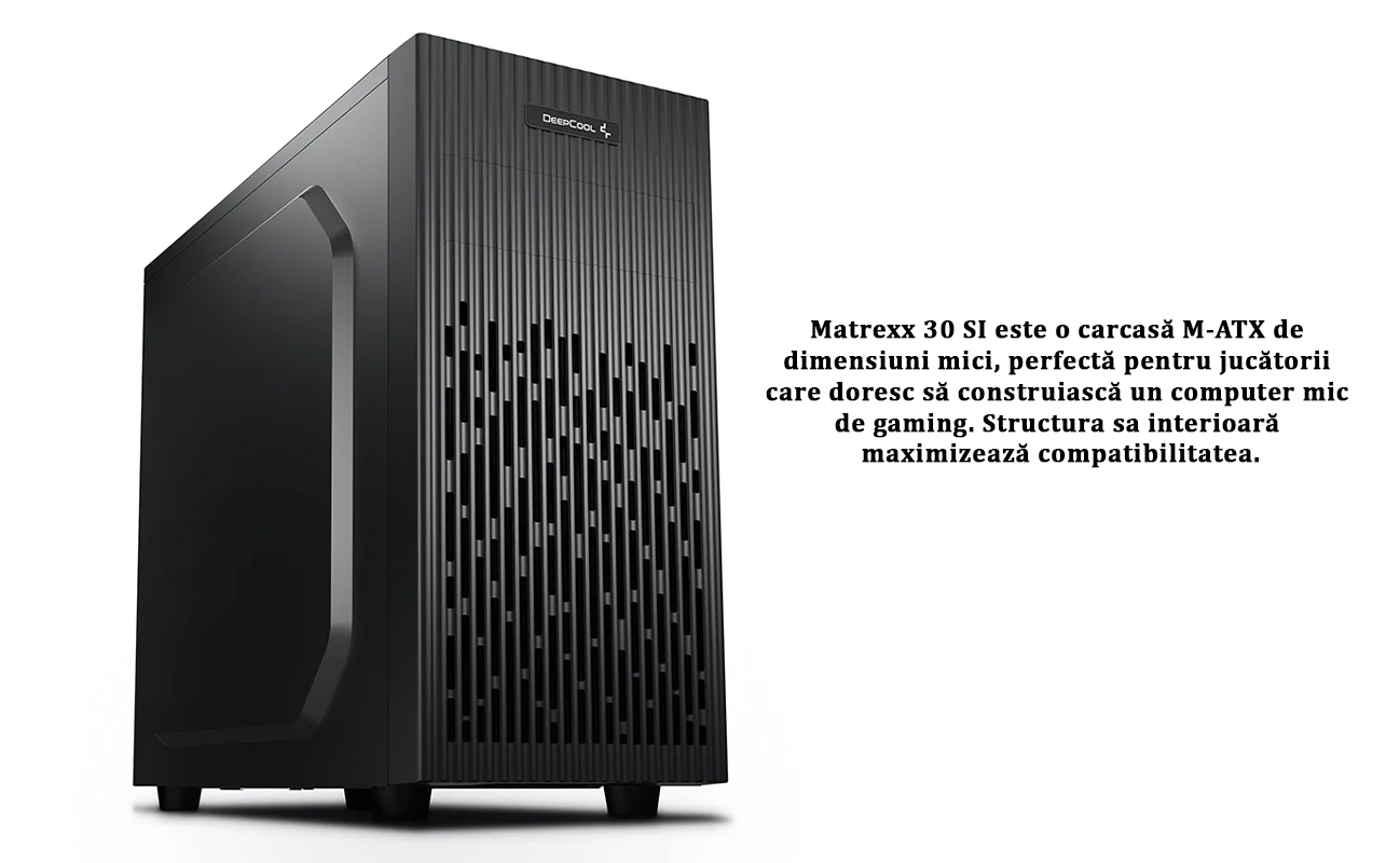 Carcasa Deepcool Matrexx 30 SI neagra, ABS+SPCC Steel ATX Mid Tower, fara sursa (tip ATX, montata jos), interior vopsit negru, 1x5.25”(extern, compatibil cu placi Micro-ATX mai mici de 244mmx244mm), 3x3,5” (intern), 2x2,5” (intern), spate – 1x120mm fan (inclus), fata – 1x 120mm fan (optional), 1x USB 3.0, 1x USB 2.0, HD Audio, sloturi expansiune: x4, microATX / Mini-ITX, inaltime maxima cooler procesor: 151mm, lungime maxima placa video: 250mm, suport radiatoare water cooling: spate – 120mm, dimensiuni (LxWxH): 405.8x193x378.2mm, greutate: 3.62 kg