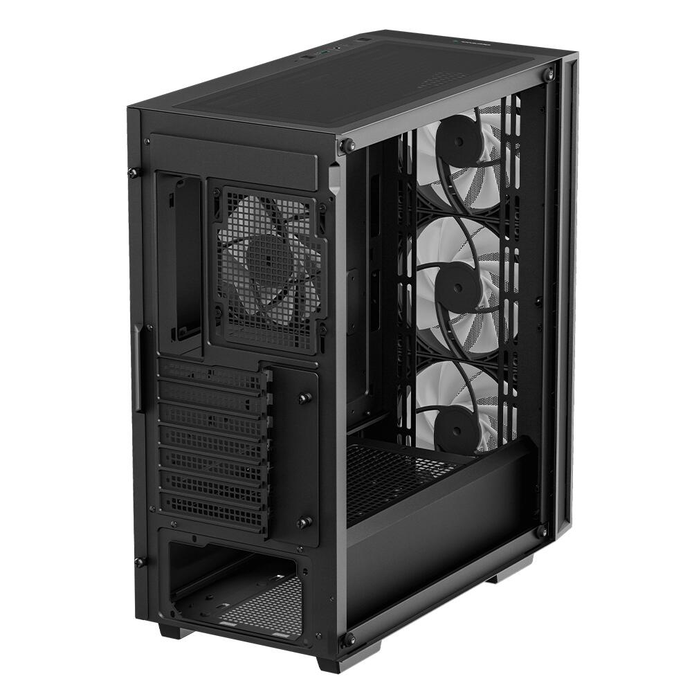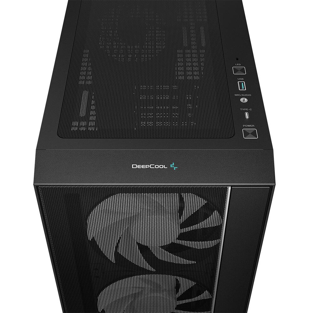 Carcasa Deepcool Matrexx 55 Mesh V4 C aRGB neagra, ABS+SPCC+Tempered Glass Middle Tower fara sursa (tip ATX, montata jos), interior vopsit negru, 2x3,5” (intern), 2+1x2,5” (intern), spate – 1x120mm aRG LED fan (inclus), fata – 3x140mm aRGB LED fans (inclus) / 3x 120mm fan (optional) , tavan – 2x 120/140mm fans (optional), podea – 2x 120mm fan (optional), 1x USB 3.0, 1x USB Type-C, HD Audio,panou lateral din sticla securizata, panou frontal din mesh metalic si iluminat aRGB, sloturi expansiune: x7, ATX / microATX / Mini-ITX, inaltime maxima cooler procesor: 165mm, lungime maxima placa video: 370mm, suport radiatoare water cooling: tavan – 1x 120/140/240/280mm, spate – 1x 120mm, fata – 1x 120/140/240/280/360mm, dimensiuni (LxWxH): 421 x 215 x 483mm, greutate: 6.5 kg
