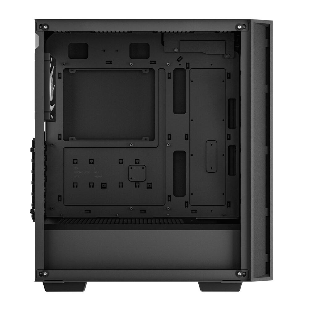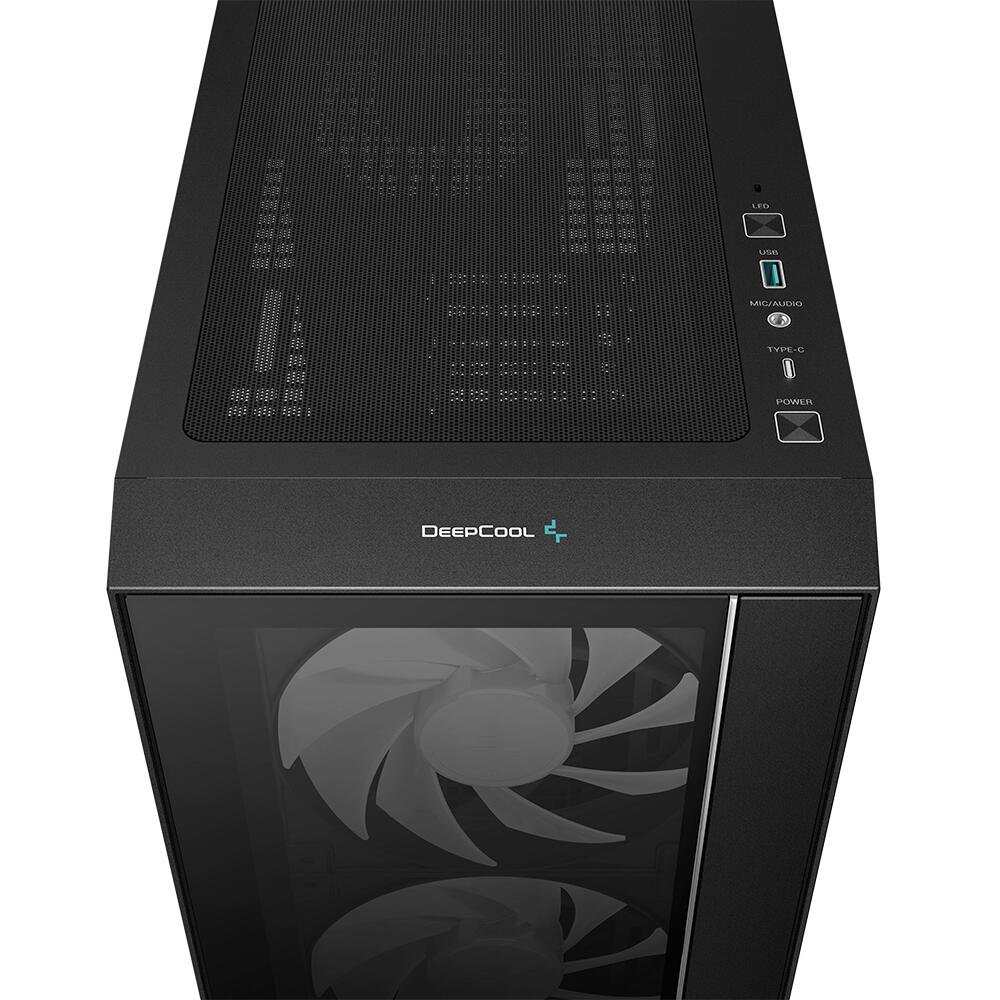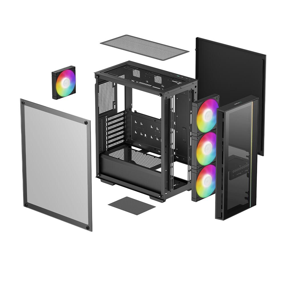 Carcasa Deepcool Matrexx 55 V4 aRGB neagra, ABS+SPCC+Tempered Glass Middle Tower fara sursa (tip ATX, montata jos), interior vopsit negru, 2x3,5” (intern), 2+1x2,5” (intern), spate – 1x120mm aRG LED fan (inclus), fata – 3x140mm aRGB LED fans (inclus) / 3x 120mm fan (optional) , tavan – 2x 120/140mm fans (optional), podea – 2x 120mm fan (optional), 1x USB 3.0, 1x USB Type-C, HD Audio,panou lateral si frontal din sticla securizata, panou frontal iluminat aRGB, sloturi expansiune: x7, ATX / microATX / Mini-ITX, inaltime maxima cooler procesor: 165mm, lungime maxima placa video: 370mm, suport radiatoare water cooling: tavan – 1x 120/140/240/280mm, spate – 1x 120mm, fata – 1x 120/140/240/280/360mm, dimensiuni (LxWxH): 421 x 215 x 483mm, greutate: 6.9 kg