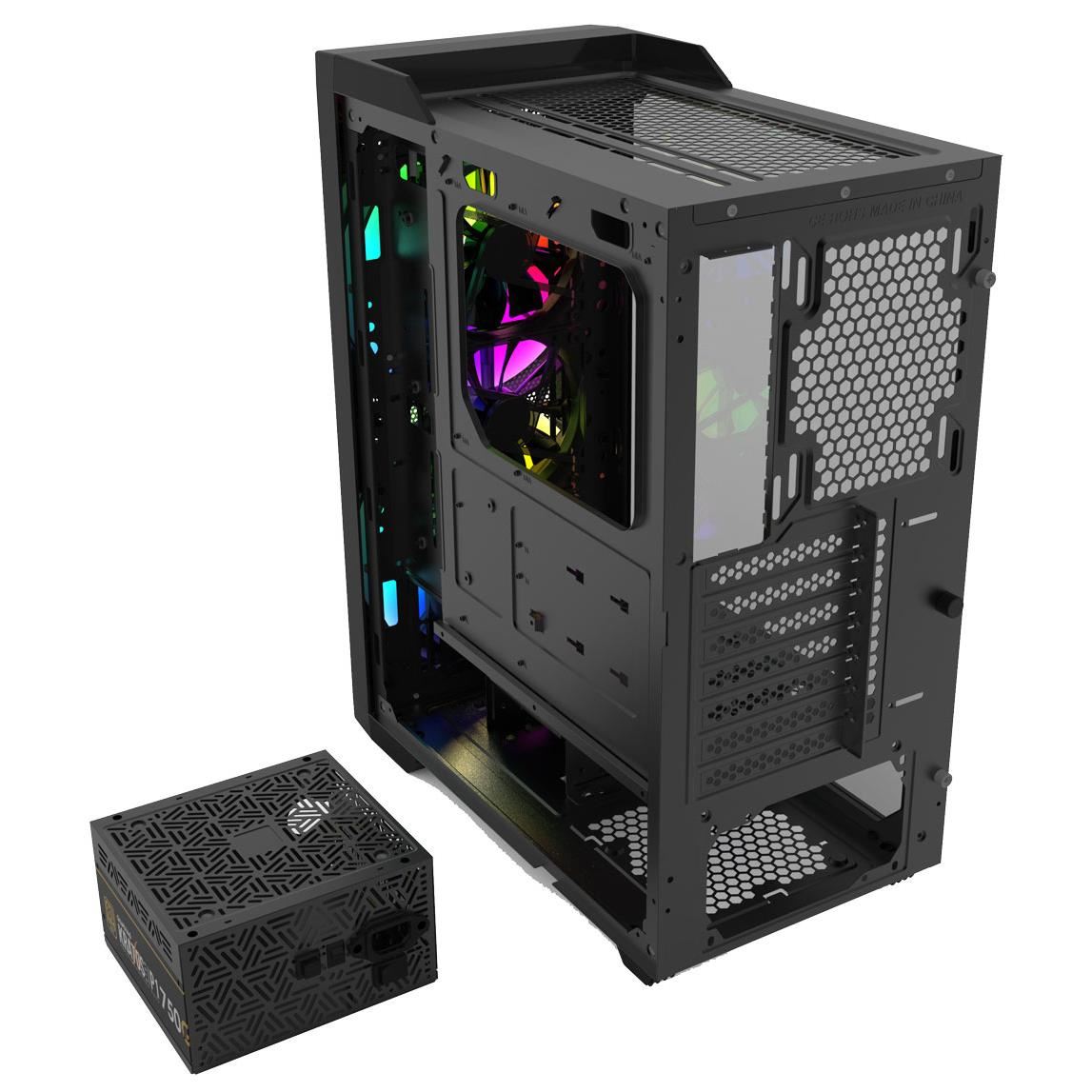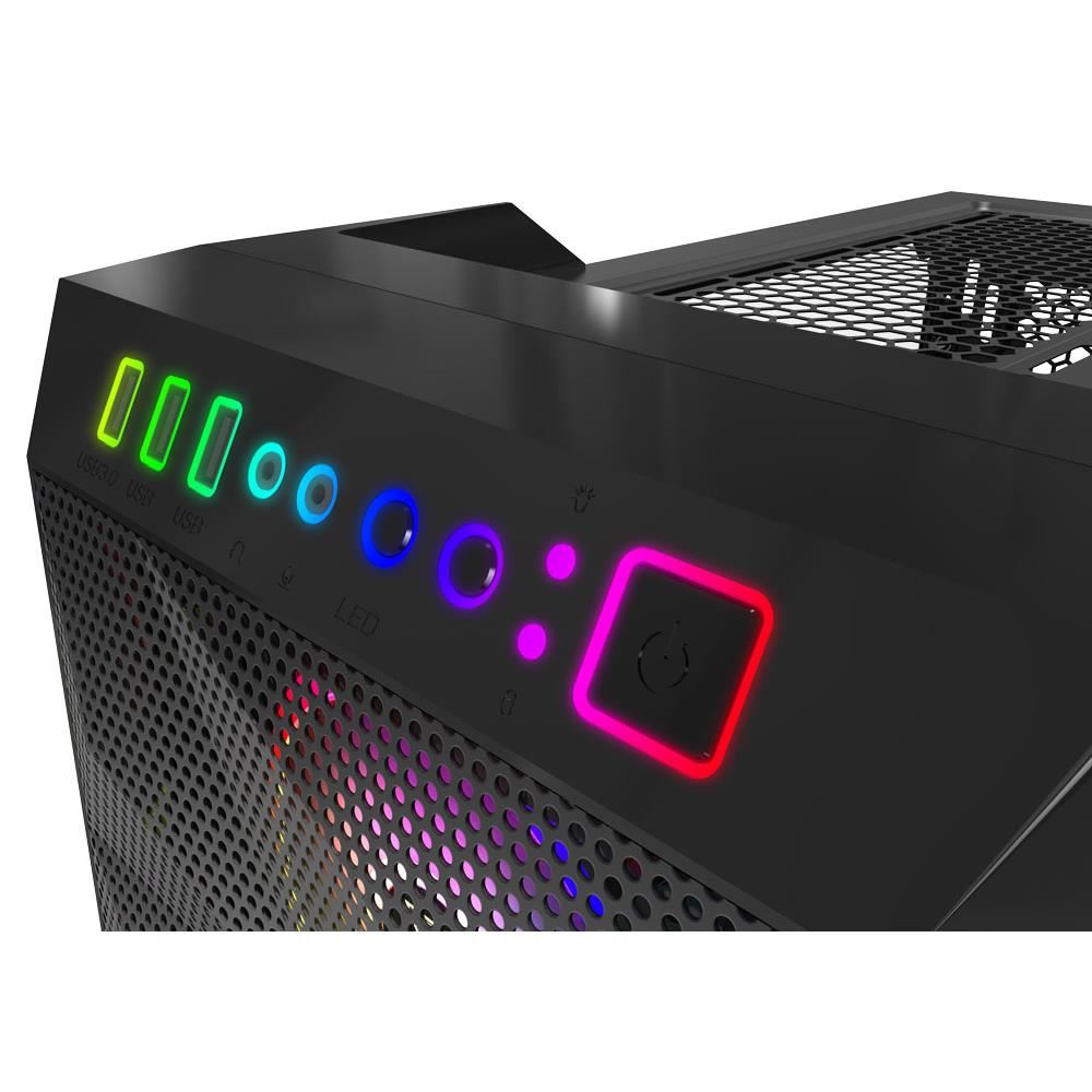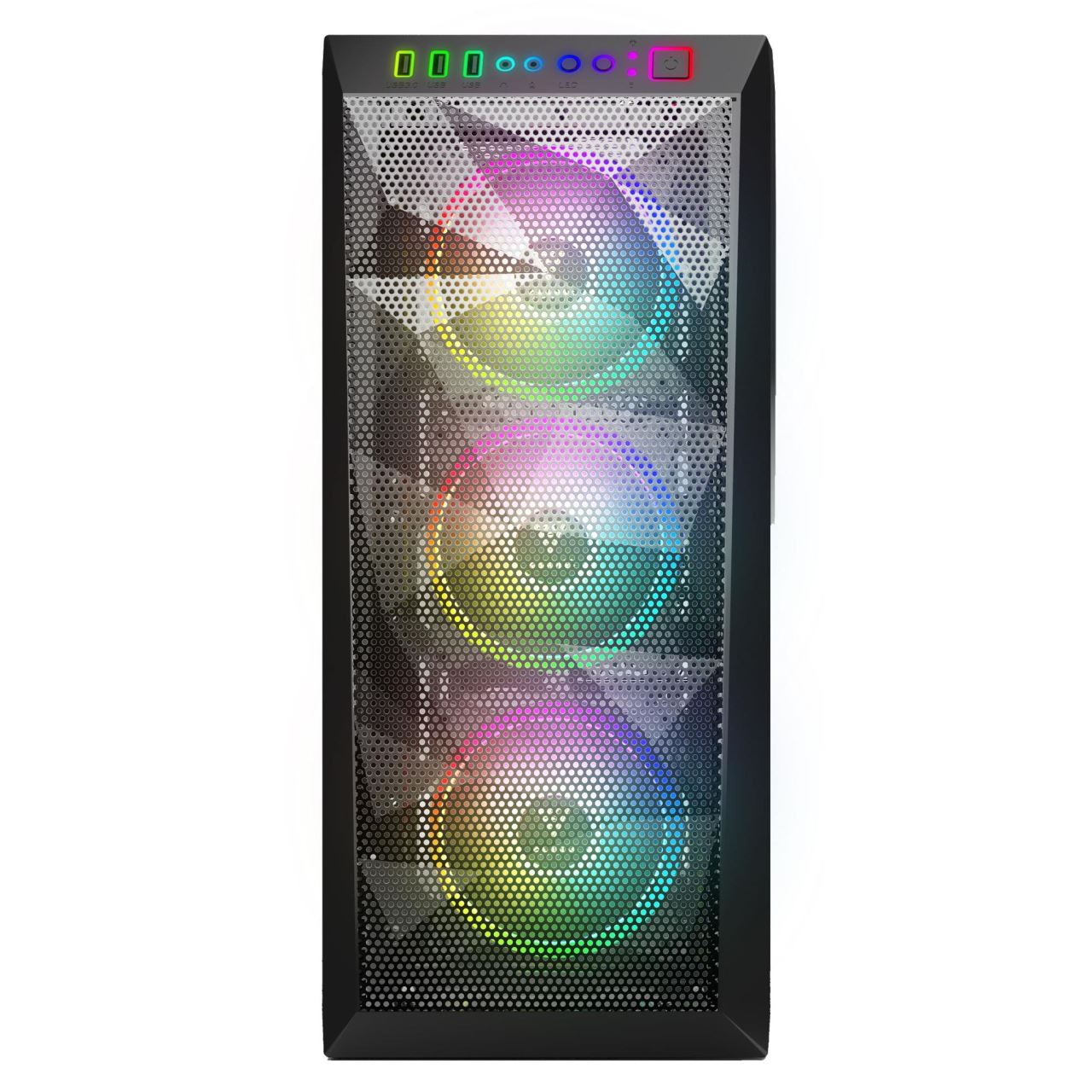 Carcasa Gamdias Athena M1 neagra, SPCC Steel and ABS, Mid Tower Case, interior vopsit negru, 2x 3.5" or 1x 2.5"+1x 3.5"(HDD Cage), 1x 2.5” (intern), fata – 3x 120mm Trio Rings ARGB Fans (inclus) / 2x 200mm/2x 140mm (optional), spate – 1x 120/140mm fan (optional), tavan – 2x 120mm / 140mm fans (optional), podea – 2x 120mm (optional), 1x USB 3.0, 2x USB 2.0, HD Audio, 1x RGB controller (se mai pot adauga 3 ventilatoare optionale si o banda LED), ATX/Micro-ATX/Mini-ITX, sloturi expansiune: x7, inaltime maxima cooler procesor: 170mm, lungime maxima placa video: 330mm, lungime maxima sursa: 170mm, suport radiatoare water cooling: fata – radiator 360/280mm, spate – radiator 120mm, tavan – radiator 240mm, dimensiuni ((LxWxH): 410x215x485mm, greutate: 6.8kg