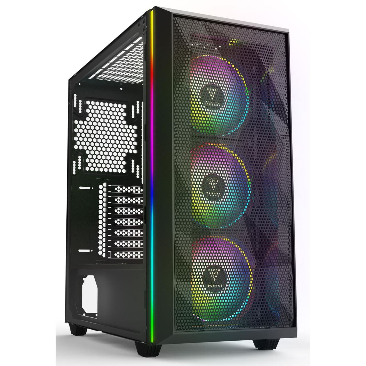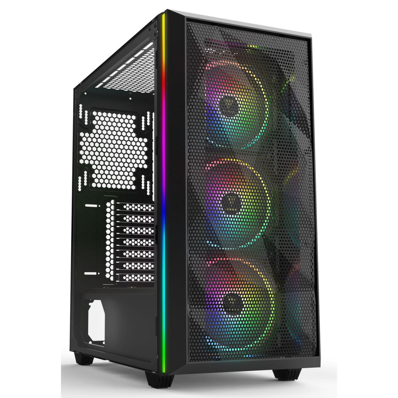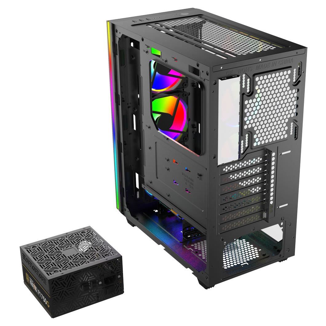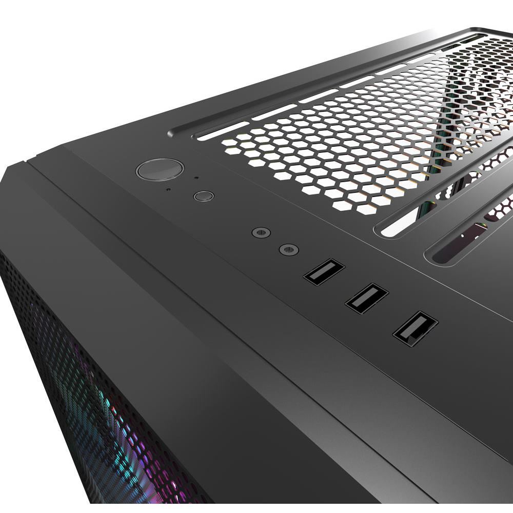 Carcasa Gamdias Athena M2 neagra, SPCC Steel and ABS, Mid Tower Case, interior vopsit negru, 2x 3.5" or 1x 2.5"+1x 3.5"(HDD Cage), 1x 2.5” (intern), fata – 3x 120mm Trio Rings ARGB Fans (inclus) / 2x 140mm (optional), spate – 1x 120/140mm fan (optional), tavan – 2x 120mm / 140mm fans (optional), podea – 2x 120mm (optional), 1x USB 3.0, 2x USB 2.0, HD Audio, 1x RGB controller (se mai pot adauga 3 ventilatoare optionale si o banda LED), ATX/Micro-ATX/Mini-ITX, sloturi expansiune: x7, inaltime maxima cooler procesor: 170mm, lungime maxima placa video: 330mm, lungime maxima sursa: 170mm, suport radiatoare water cooling: fata – radiator 360/280mm, spate – radiator 120mm, tavan – radiator 240mm, dimensiuni ((LxWxH): 405x215x460mm, greutate: 5.92kg