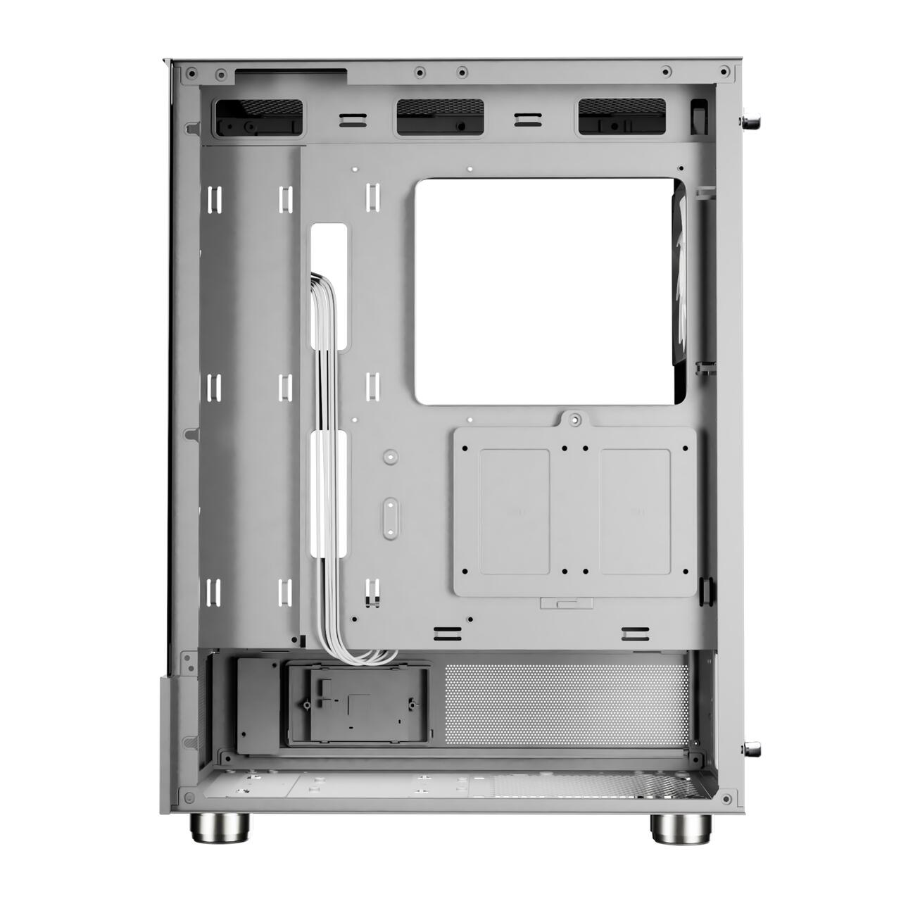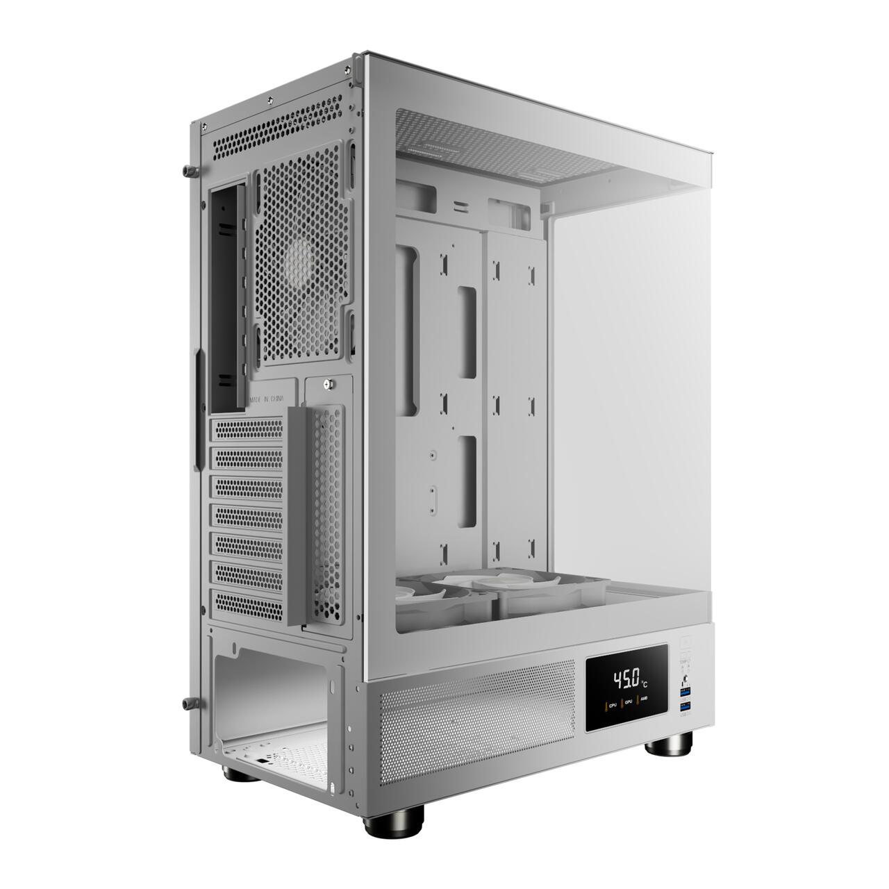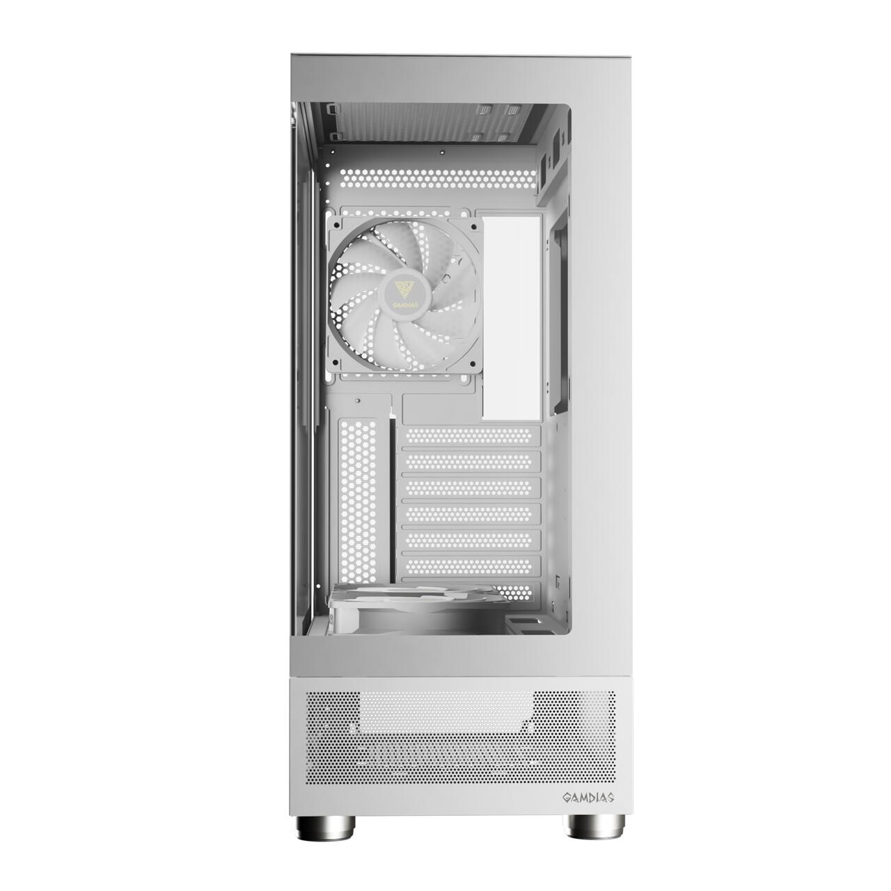 Carcasa Gamdias Atlas E1 alba, SPCC & ABS & Tempered glass, Mid Tower Case, interior vopsit alb, 1x 3.5" (intern), 2x 2.5” (intern), power cover – 2x 120mm aRGB LED Fans (inclus), spate – 1x 120mm aRGB LED Fans (inclus), tavan – 2x 120mm / 2x 140mm fans (optional), 2x USB 3.0, HD Audio, ATX/Micro-ATX/Mini-ITX, sloturi expansiune: x7, design premium cu panou lateral si frontal din sticla securizata, include display ce afiseaza temperatura CPU, GPU sau ambientala, software de configurare Zeus Cast, inaltime maxima cooler procesor: 160mm, lungime maxima placa video: 340mm, lungime maxima sursa: 160mm, suport radiatoare water cooling: spate – radiator 120mm, tavan – radiator 240mm, dimensiuni ((LxWxH): 360x210x480mm, greutate: 6.3kg
