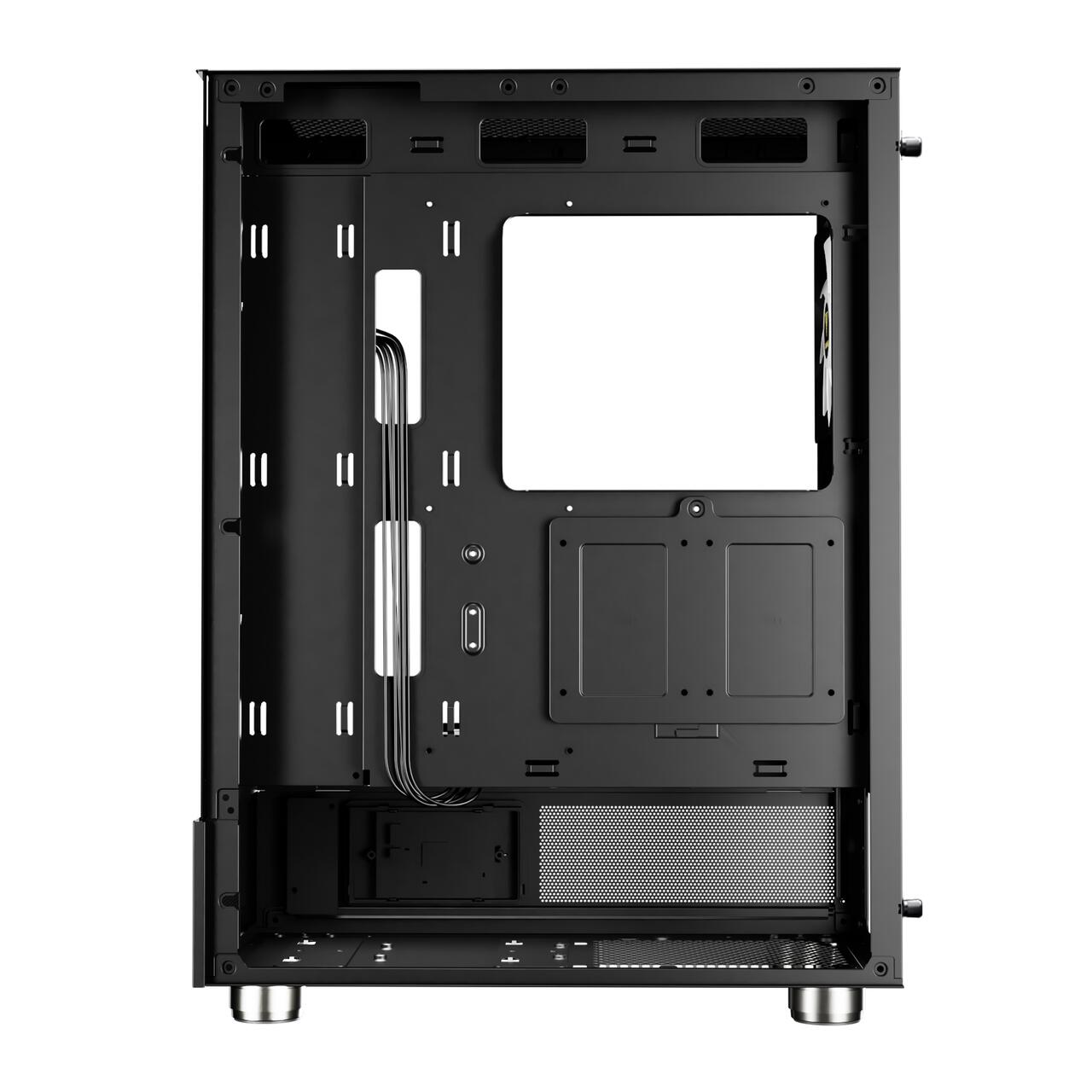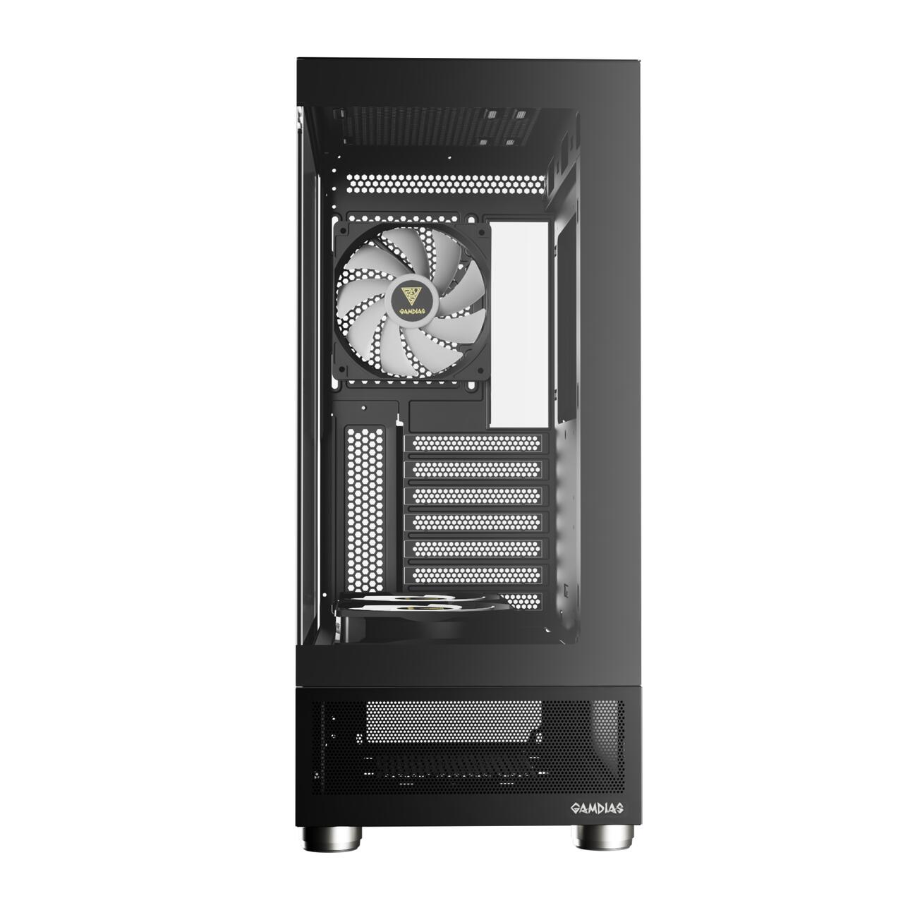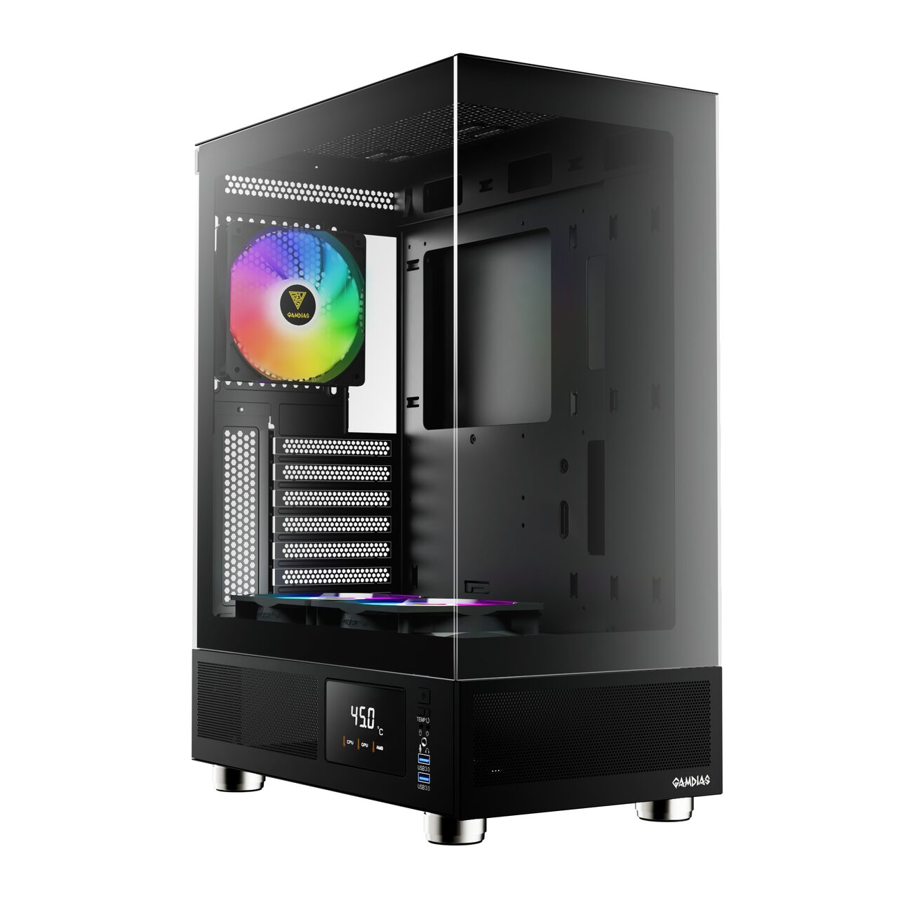 Carcasa Gamdias Atlas E1 neagra, SPCC & ABS & Tempered glass, Mid Tower Case, interior vopsit negru, 1x 3.5" (intern), 2x 2.5” (intern), power cover – 2x 120mm aRGB LED Fans (inclus), spate – 1x 120mm aRGB LED Fans (inclus), tavan – 2x 120mm / 2x 140mm fans (optional), 2x USB 3.0, HD Audio, ATX/Micro-ATX/Mini-ITX, sloturi expansiune: x7, design premium cu panou lateral si frontal din sticla securizata, include display ce afiseaza temperatura CPU, GPU sau ambientala, software de configurare Zeus Cast, inaltime maxima cooler procesor: 160mm, lungime maxima placa video: 340mm, lungime maxima sursa: 160mm, suport radiatoare water cooling: spate – radiator 120mm, tavan – radiator 240mm, dimensiuni ((LxWxH): 360x210x480mm, greutate: 6.3kg