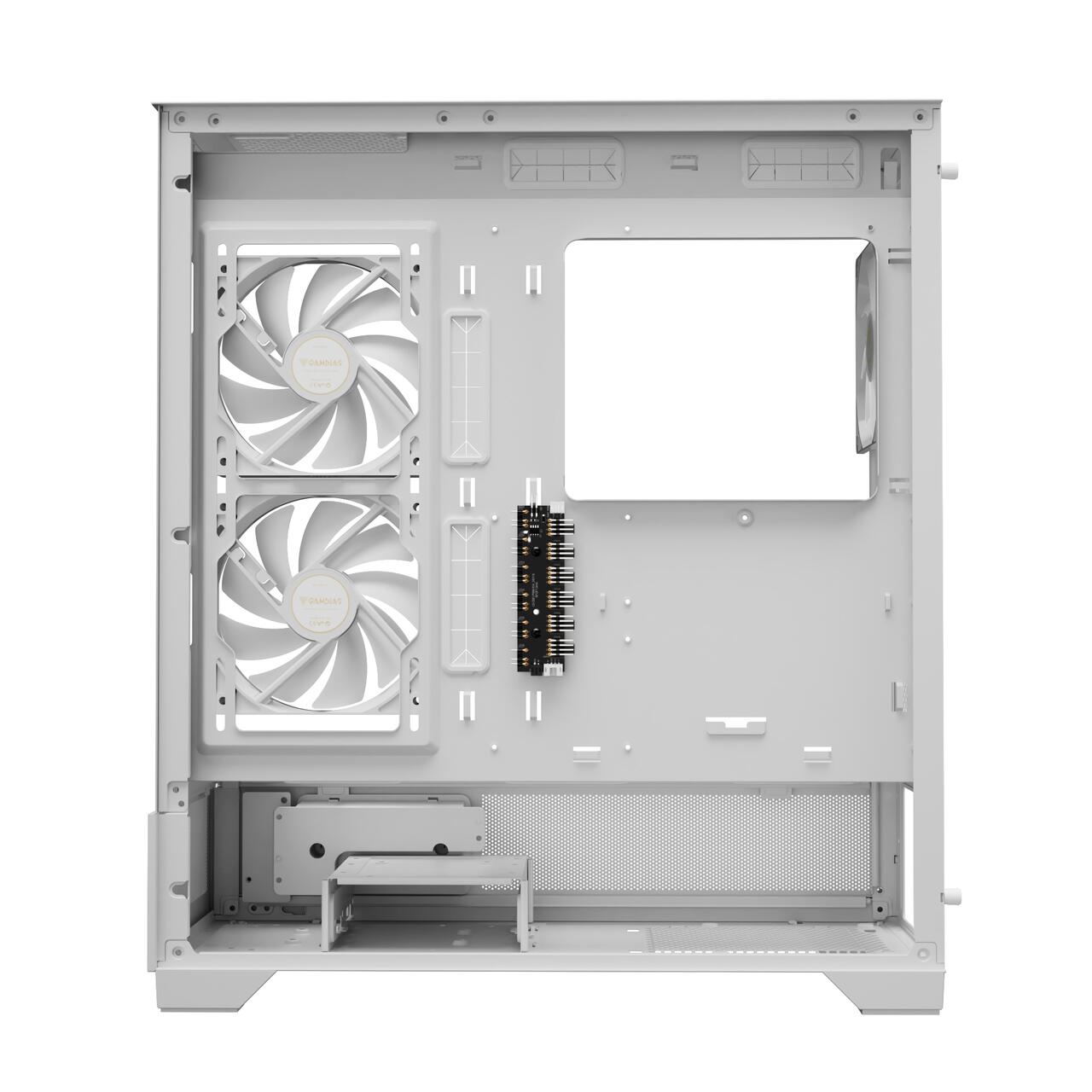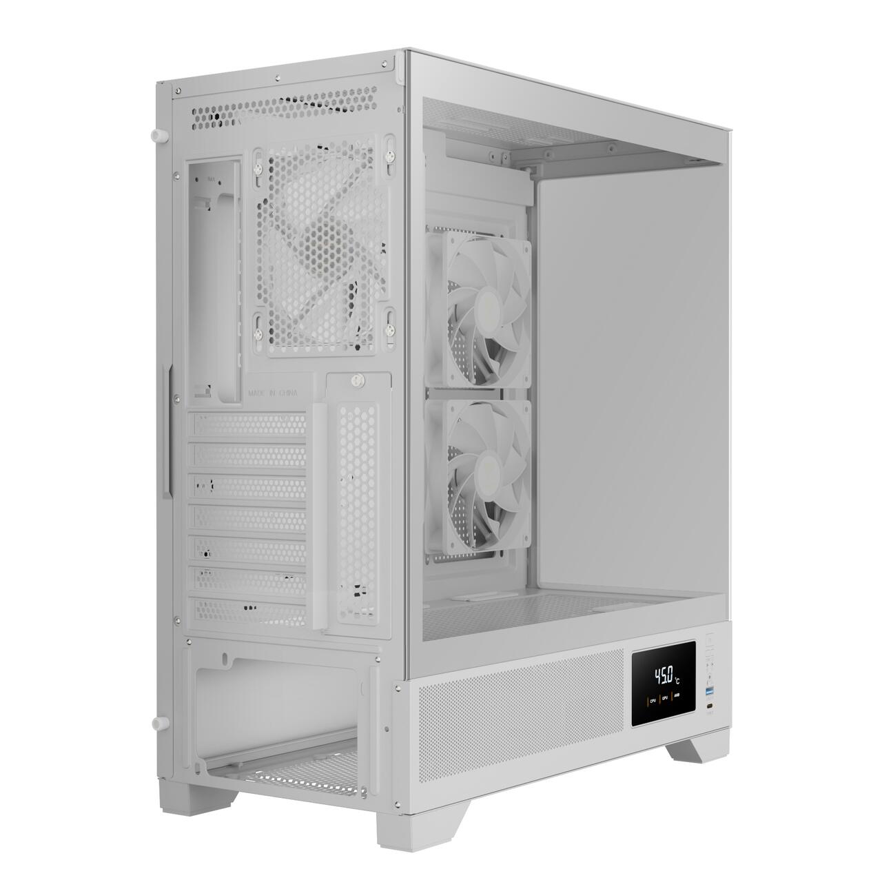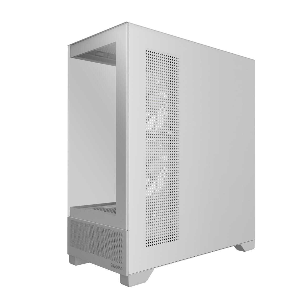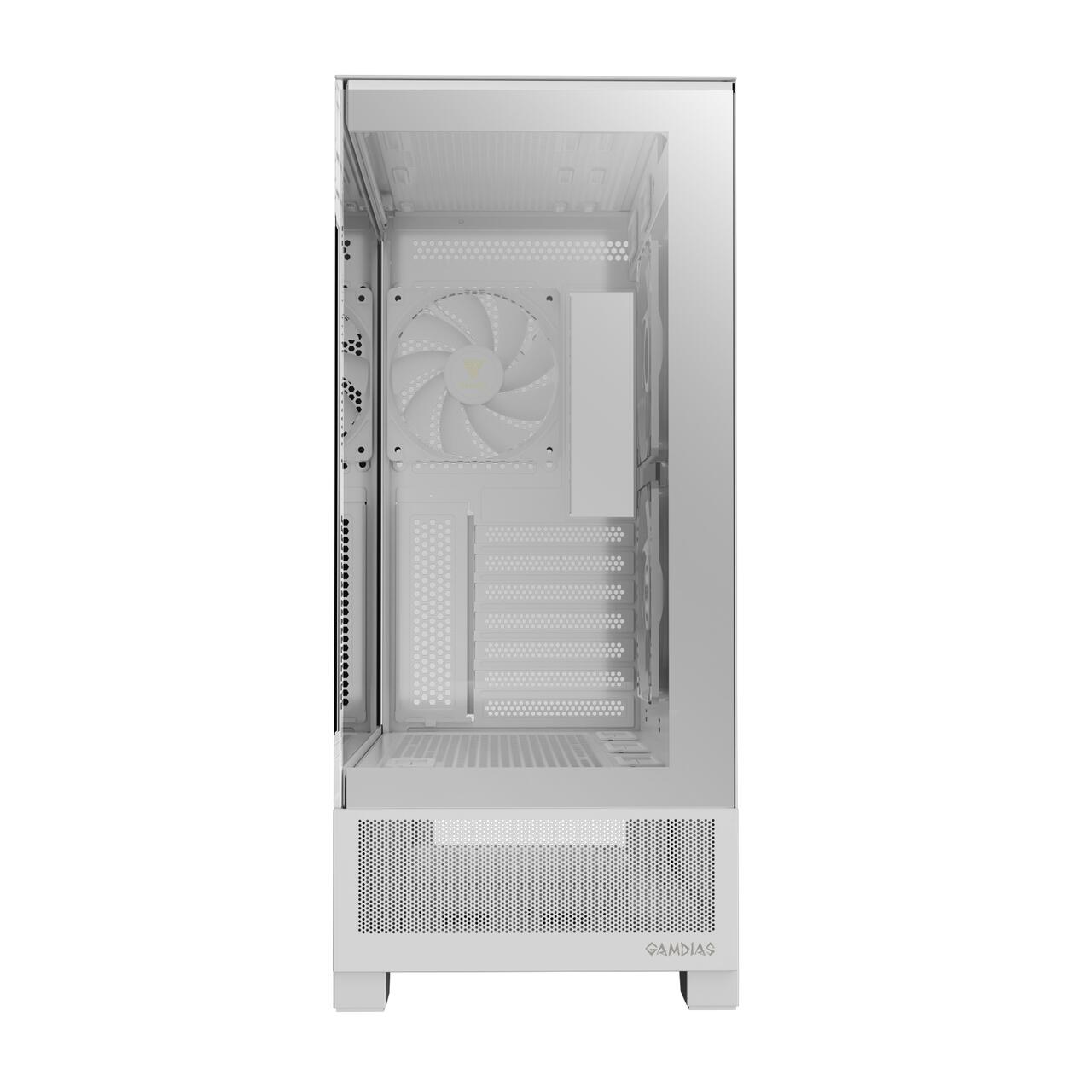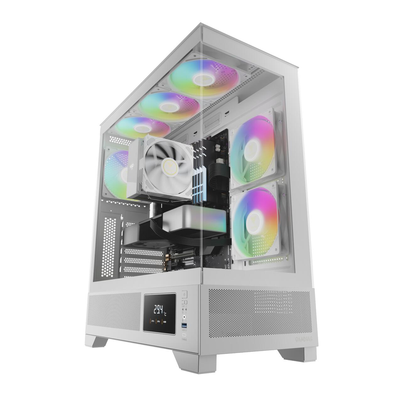 Carcasa Gamdias Atlas M1 alba, SPCC & ABS & Tempered glass, Mid Tower Case, interior vopsit alb, 2x 3.5" (intern) sau 1x 3.5” si 1x 2.5” (intern), 2x 2.5” (intern), lateral – 2x 120mm aRGB LED Fans (inclus), spate – 1x 120mm aRGB LED Fans (inclus), tavan – 3x 120mm / 2x 140mm fans (optional), 1x USB 3.0, 1x USB Type-C, HD Audio, ATX/Micro-ATX/Mini-ITX, sloturi expansiune: x7+2, design premium cu panou lateral si frontal din sticla securizata, include display ce afiseaza temperatura CPU, GPU sau ambientala, software de configurare Zeus Cast, HUB aRGB cu 6 port-uri (3 sunt ocupate de ventilatoare existente pe carcasa), inaltime maxima cooler procesor: 160mm, lungime maxima placa video: 410mm, lungime maxima sursa: 160mm, suport radiatoare water cooling: spate – radiator 120mm, tavan – radiator 280/360mm, lateral – 1x 240mm, dimensiuni (LxWxH): 420x210x465mm, greutate: 7.6kg