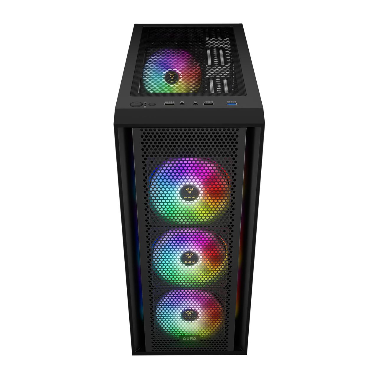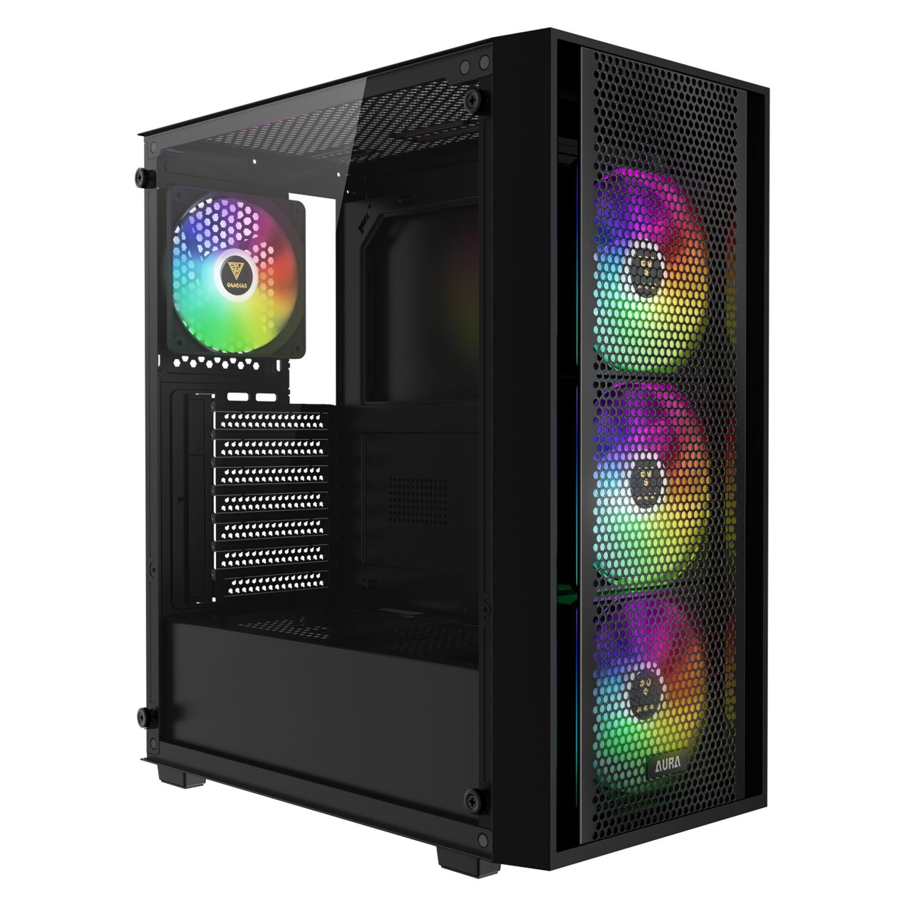 Carcasa Gamdias Aura GC2 Elite aRGB neagra, SPCC & ABS & Tempered glass, Mid Tower Case, interior vopsit negru, 2 x 3.5" sau 1 x 2.5"+1 x 3.5"(HDD Cage), 2x 2.5” (intern), fata – 3x 120mm aRGB LED Fans (inclus) / 2x 140mm fand (optional), spate – 1x 120mm aRGB LED Fans (inclus), tavan – 2x 120mm fans (optional), 1x USB 3.0, 2x USB 2.0, HD Audio, ATX/Micro-ATX/Mini-ITX, design premium cu panou lateral din sticla securizata, sloturi expansiune: x7, inaltime maxima cooler procesor: 160mm, lungime maxima placa video: 340mm, lungime maxima sursa: 160mm, suport radiatoare water cooling: fata – 1x 360mm, spate – 1x 120mm, dimensiuni (LxWxH): 395x195x450mm, greutate: 4.9kg