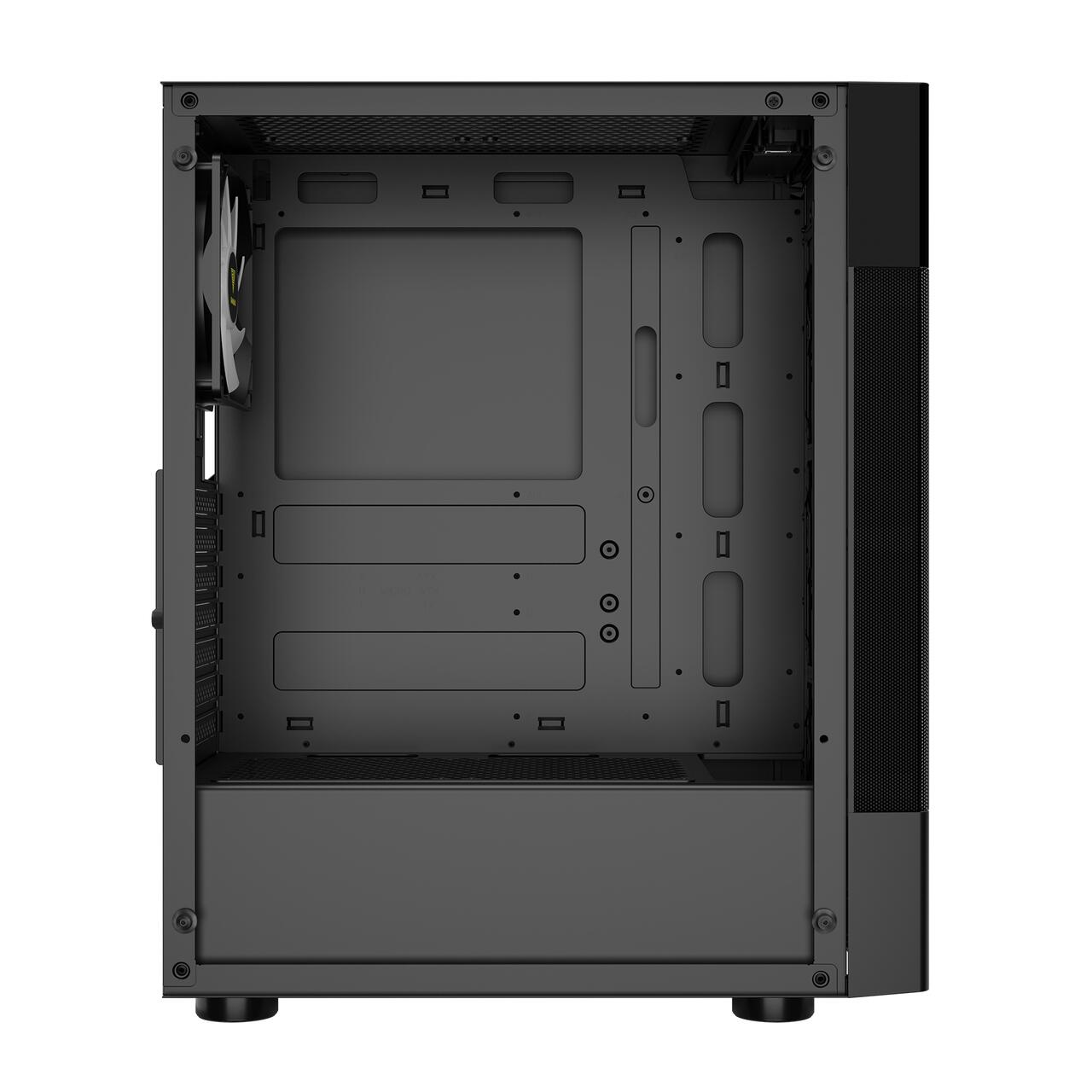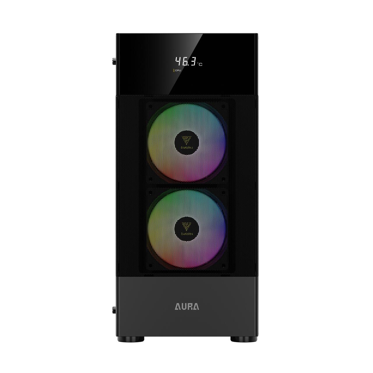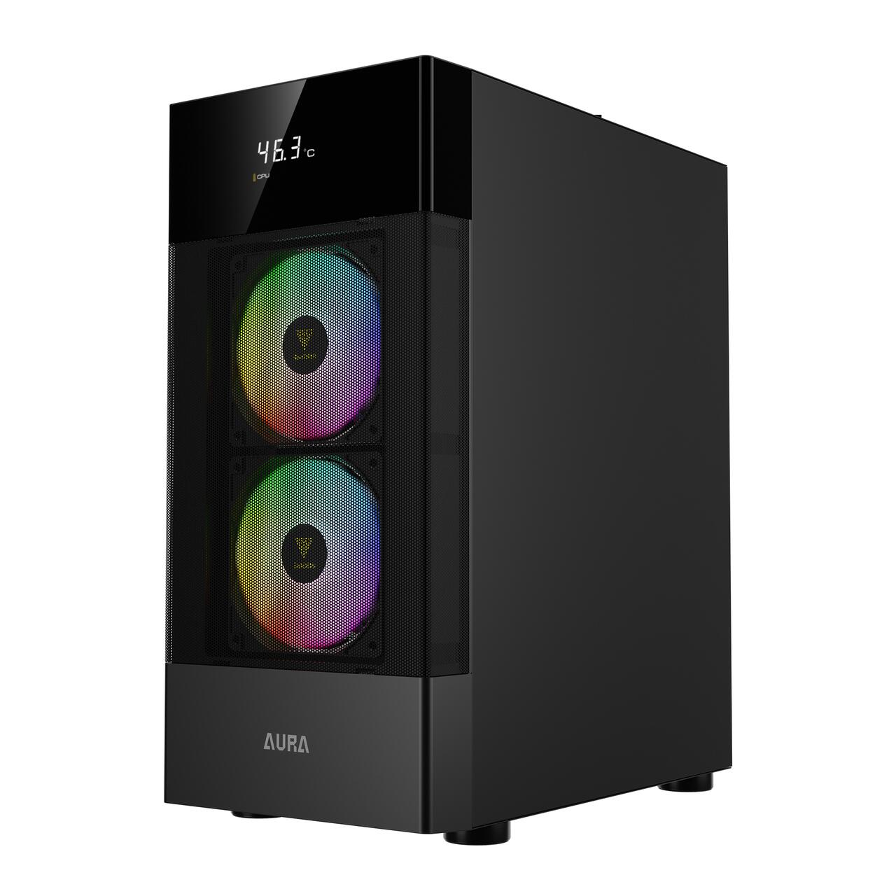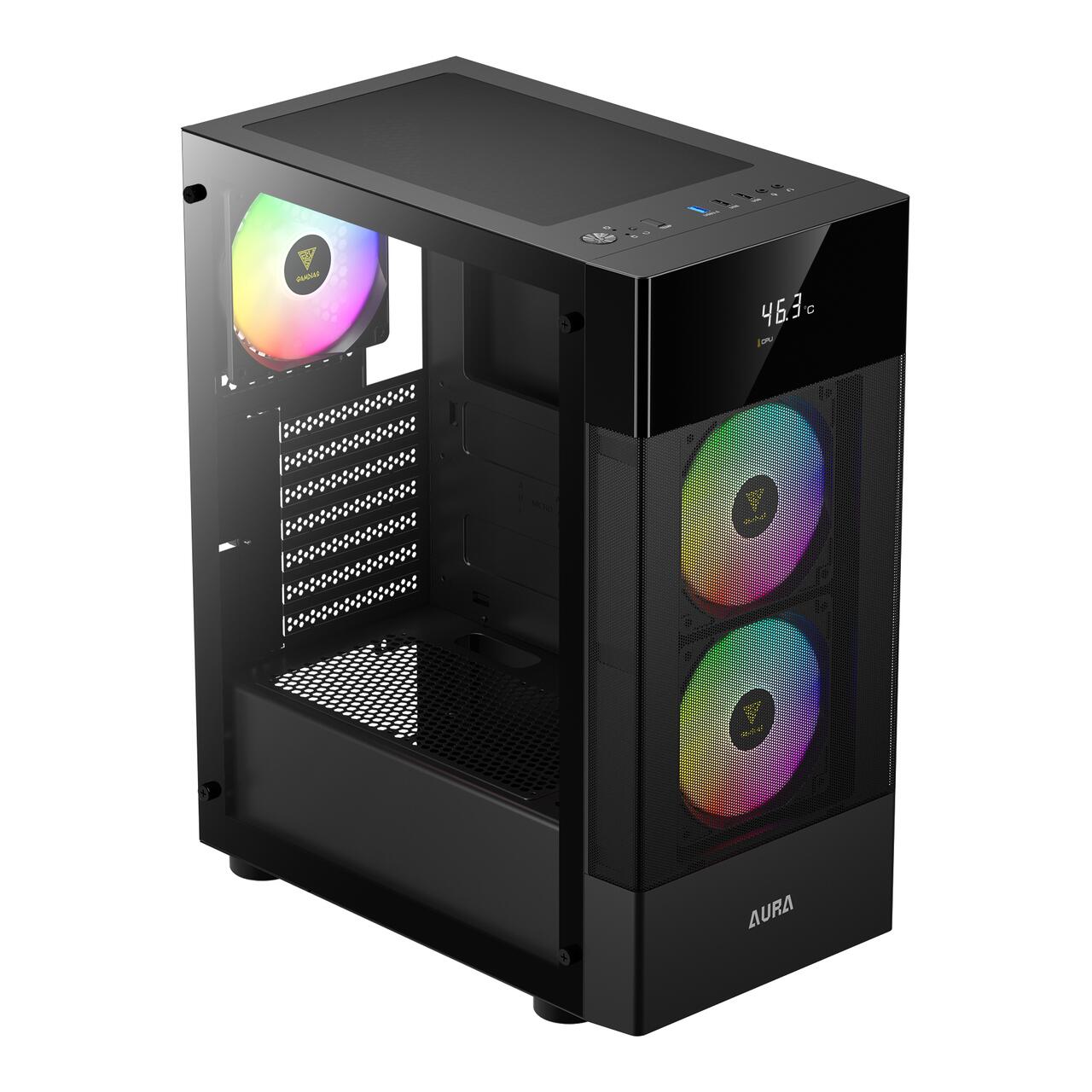 Carcasa Gamdias Aura GC5 aRGB neagra, SPCC & ABS & Tempered glass, Mid Tower Case, interior vopsit negru, 2 x 3.5" sau 1 x 2.5"+1 x 3.5"(HDD Cage), 1x 2.5” (intern), fata – 2x 120mm aRGB LED Fans (inclus) / 1x 120mm fan (optional), spate – 1x 120mm aRGB LED Fans (inclus), tavan – 2x 120mm fans (optional), 1x USB 3.0, 2x USB 2.0, HD Audio, ATX/Micro-ATX/Mini-ITX, design premium cu panou lateral din sticla securizata, include display ce afiseaza temperatura CPU, GPU sau ambientala, software de configurare Zeus Cast, sloturi expansiune: x7, inaltime maxima cooler procesor: 160mm, lungime maxima placa video: 300mm, lungime maxima sursa: 150mm, suport radiatoare water cooling: spate – radiator 120mm, fata – radiator 360mm, dimensiuni (LxWxH): 370x210x450mm, greutate: 4.7kg
